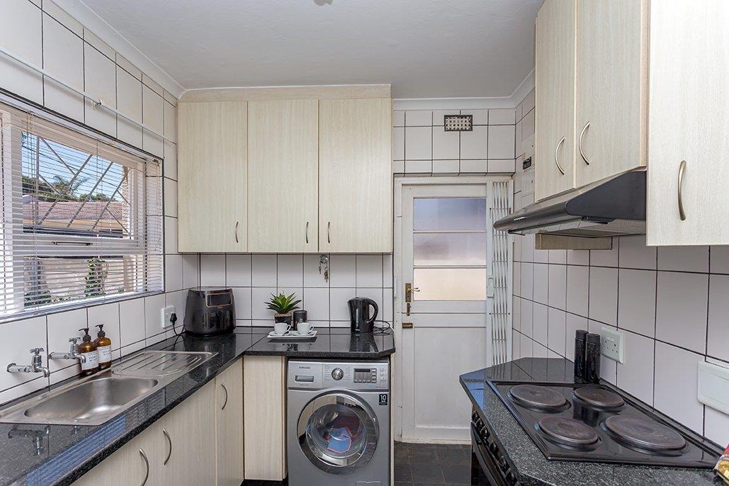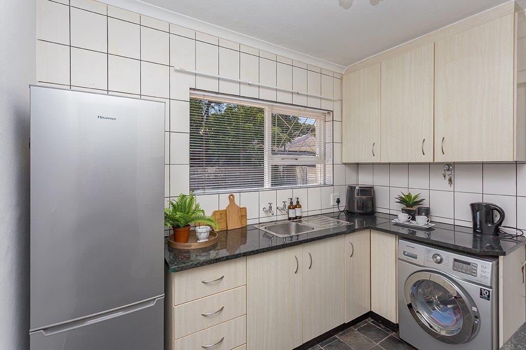 The practical kitchen is equipped with an oven and hob and opens onto a private garden—perfect for outdoor entertaining, weekend braais, or simply enjoying a quiet green space.