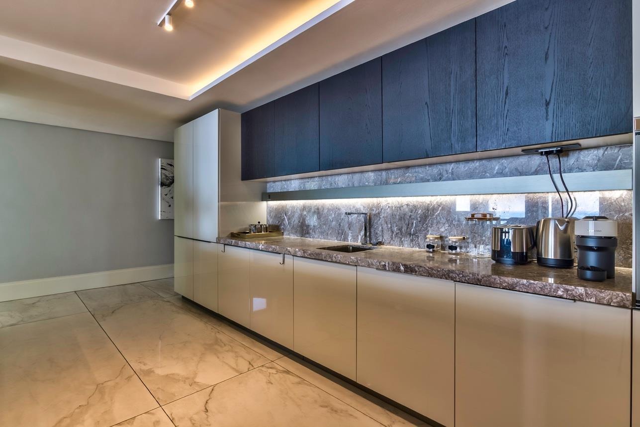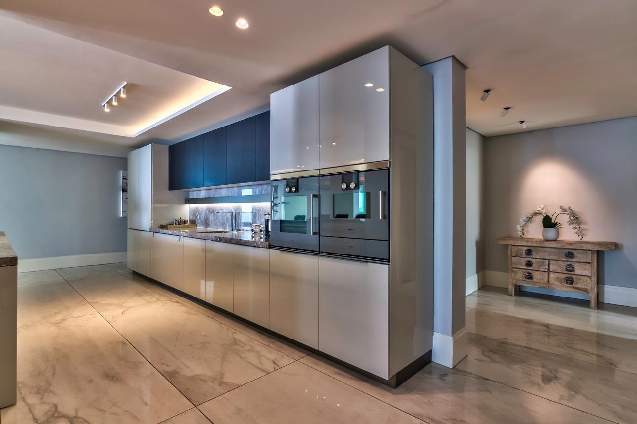 The state-of-the-art kitchen is a masterpiece of design — featuring integrated Gaggenau appliances, a beautiful granite island ensuring a seamless connectivity to the dining and lounge areas. The architectural lighting accentuates the home’s modern elegance.