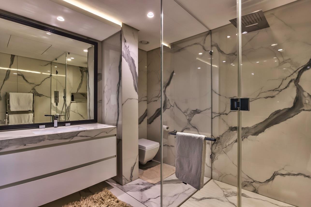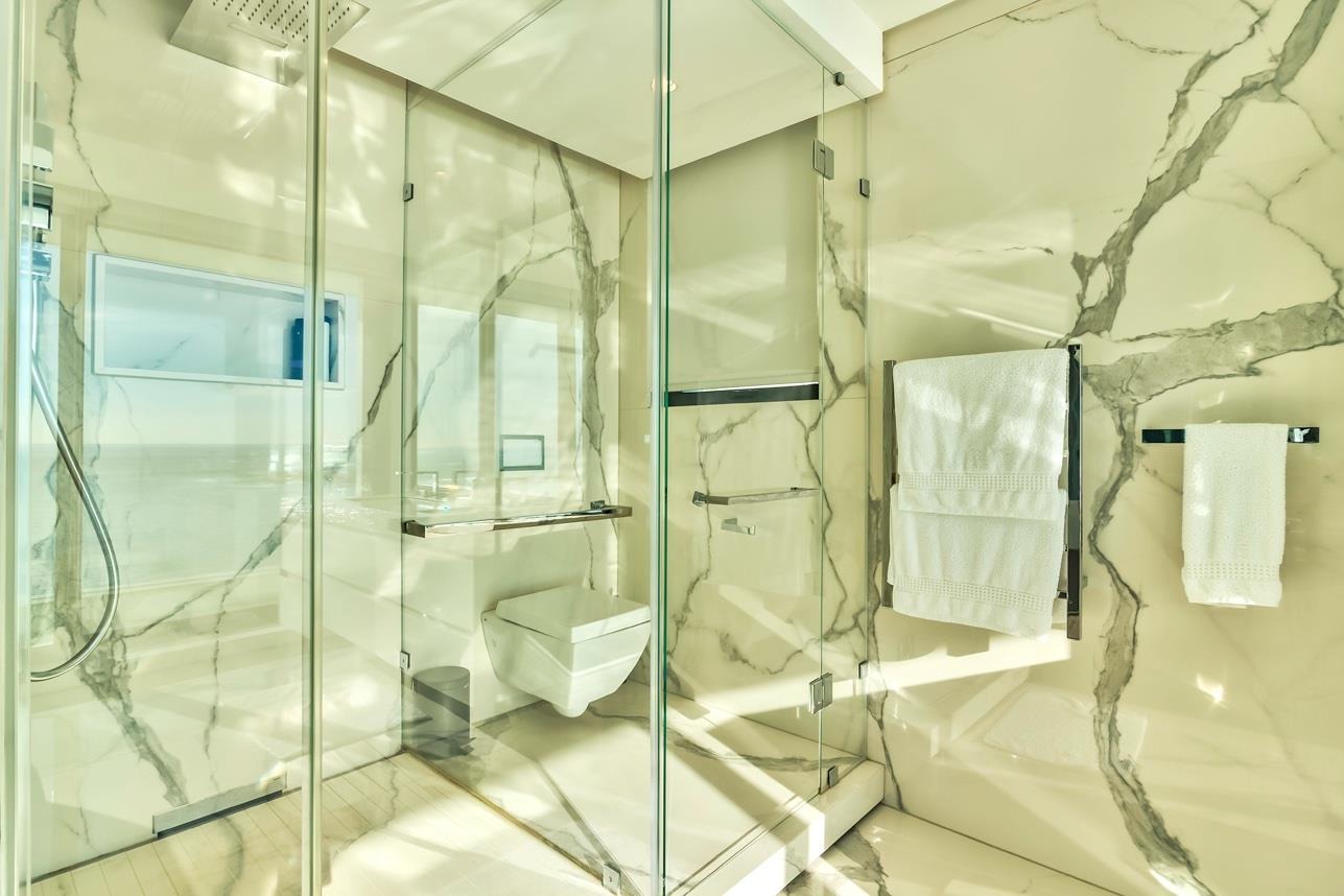 The ocean-facing master suite is a true sanctuary — complete with a lavish en-suite bathroom and custom-designed dressing room where the faultless cabinetry is on display. Each of the four additional double bedrooms is luxuriously appointed with its own en-suite bathroom and private terrace, offering panoramic sea views.