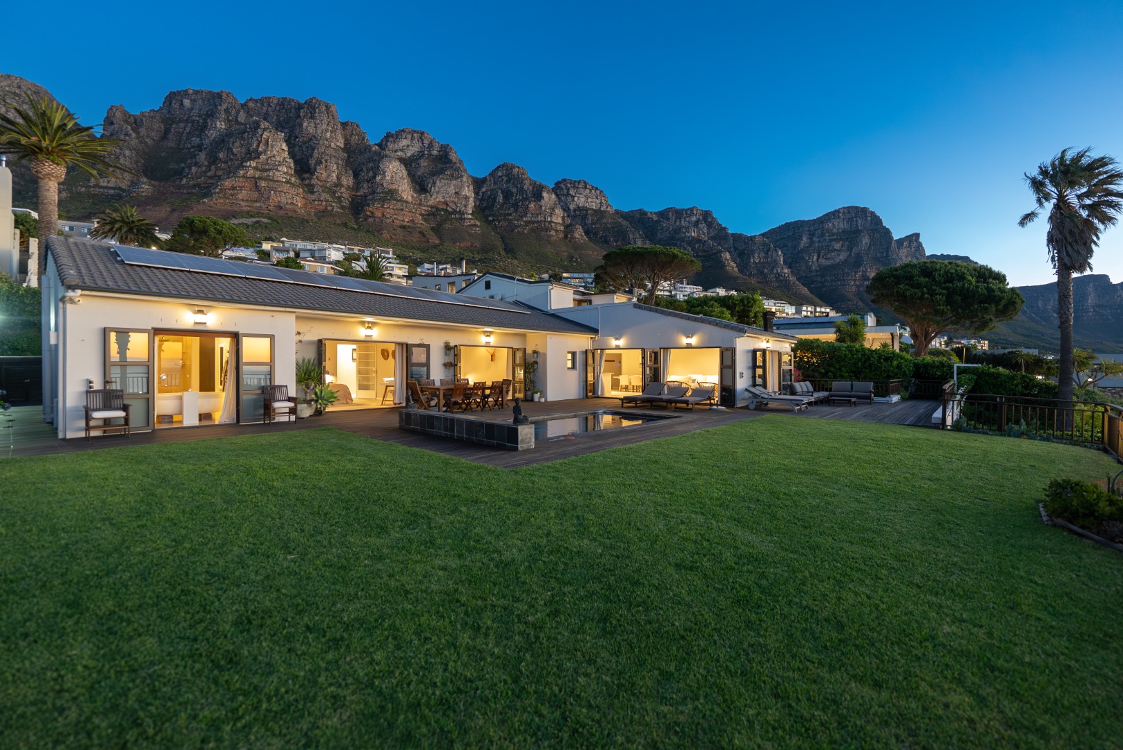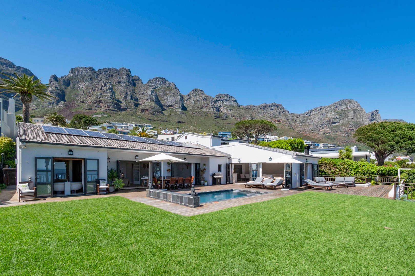 Set in the heart of Camps Bay, this spacious 936 m² property offers panoramic ocean and mountain vistas, including views of Lion’s Head, the Twelve Apostles, and the Atlantic Ocean.