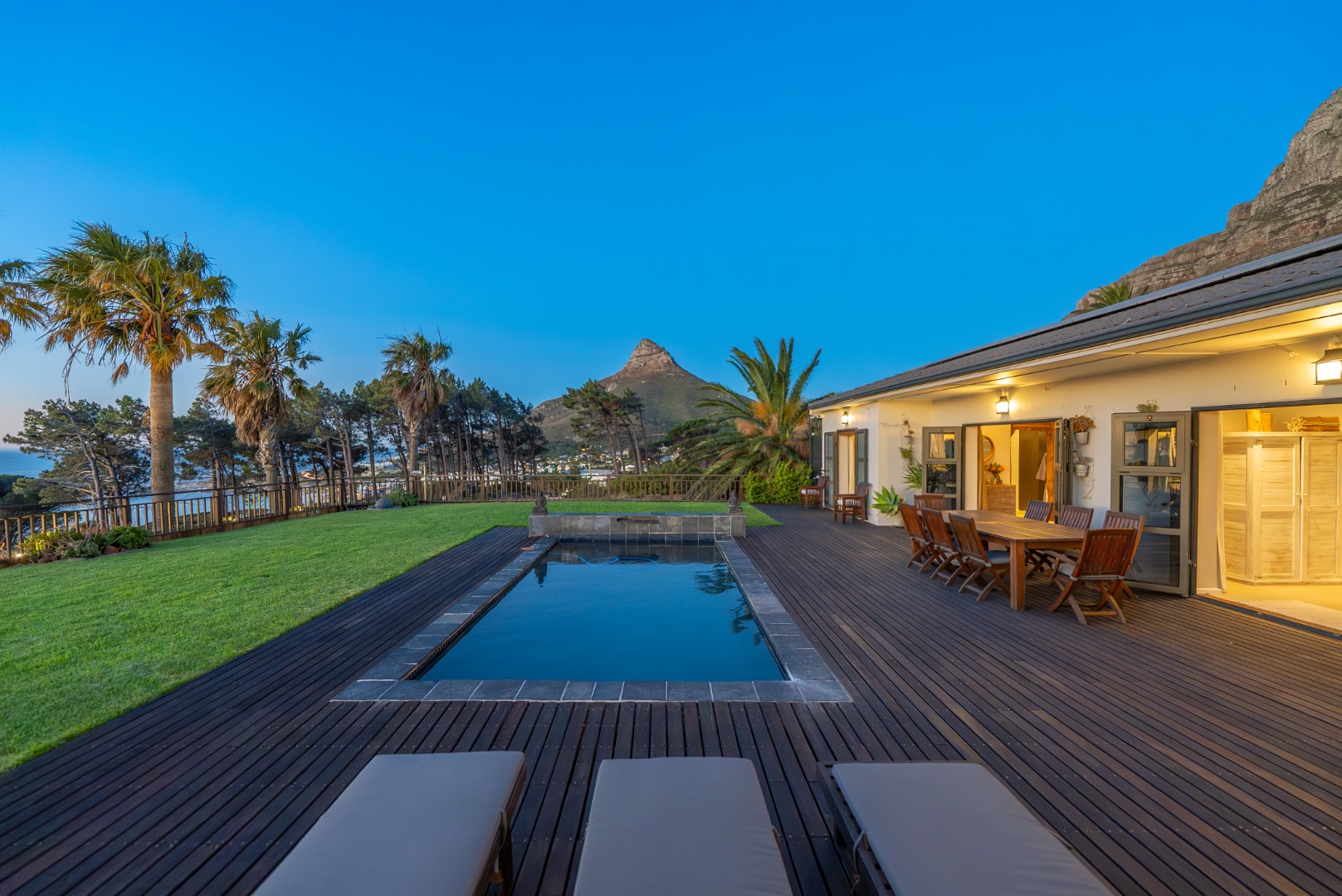 Designed for modern living, the home combines Mediterranean elegance with clean lines and neutral tones. Expansive sun terraces and a pool deck provide the perfect setting for enjoying Cape Town’s iconic sunsets.