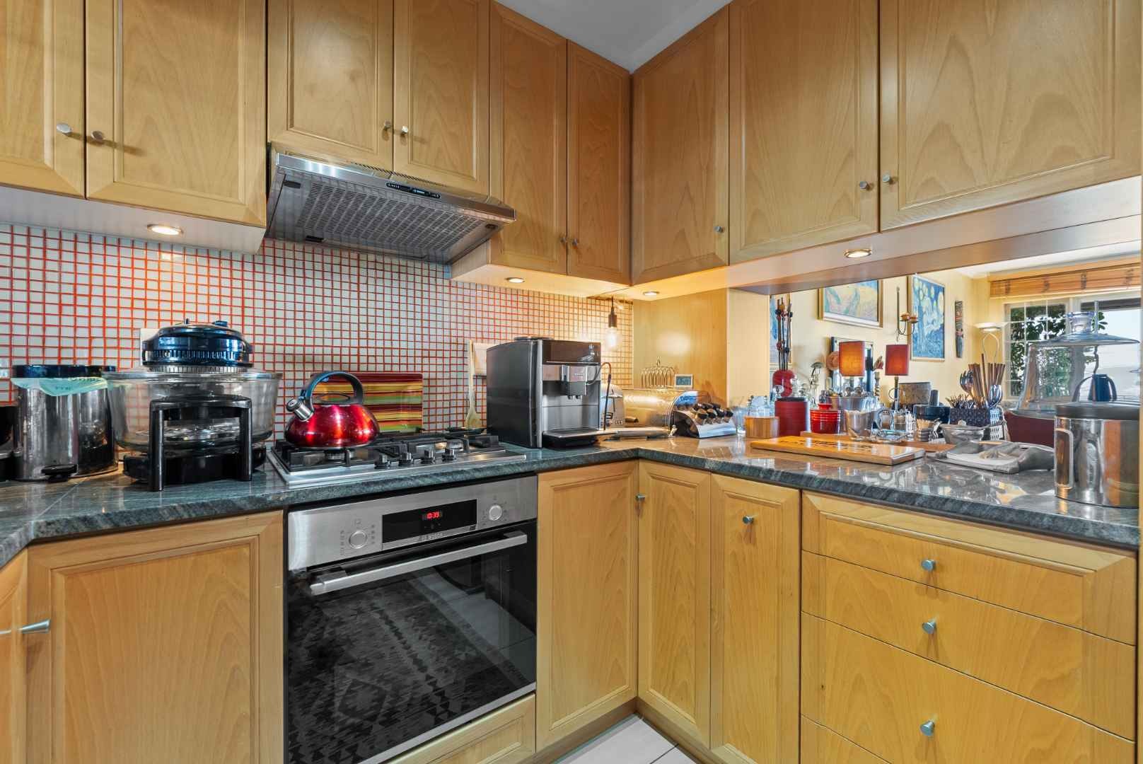 The kitchen, though compact, is expertly designed to accommodate a dishwasher, washing machine, and dryer, making it as functional as it is stylish.