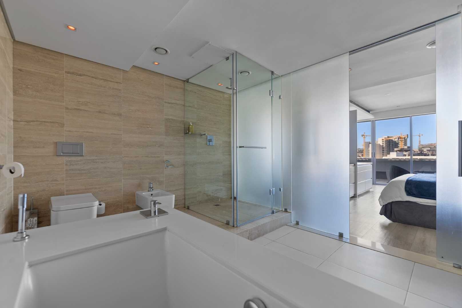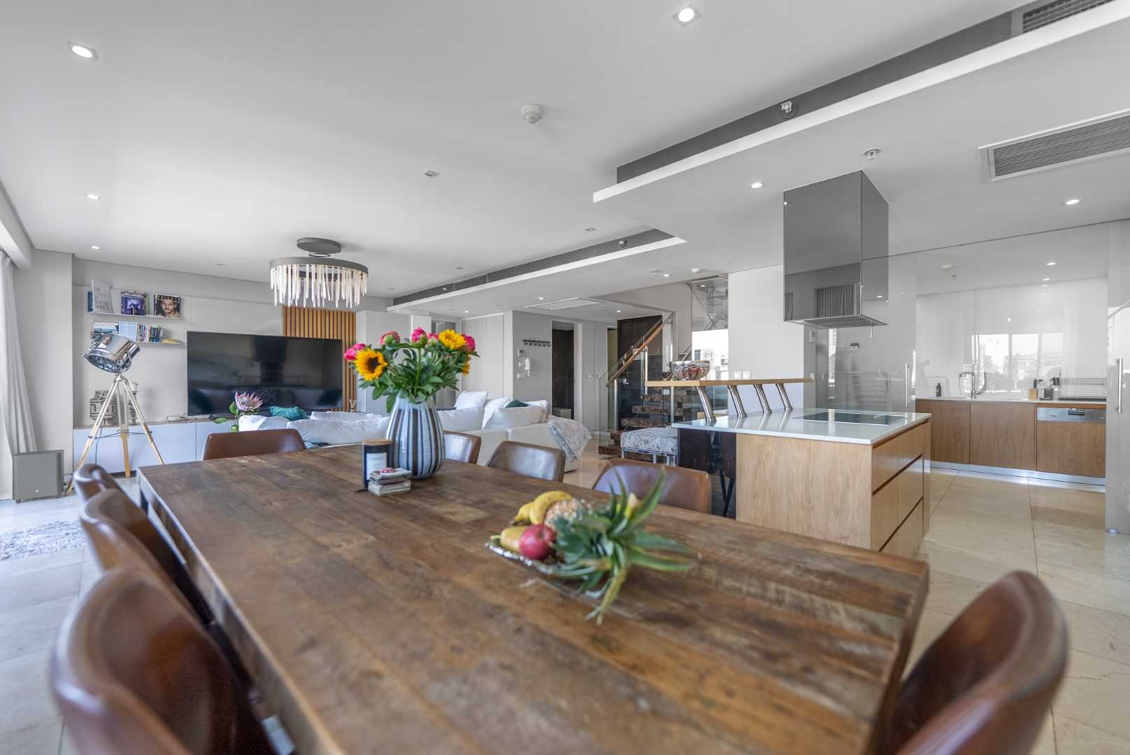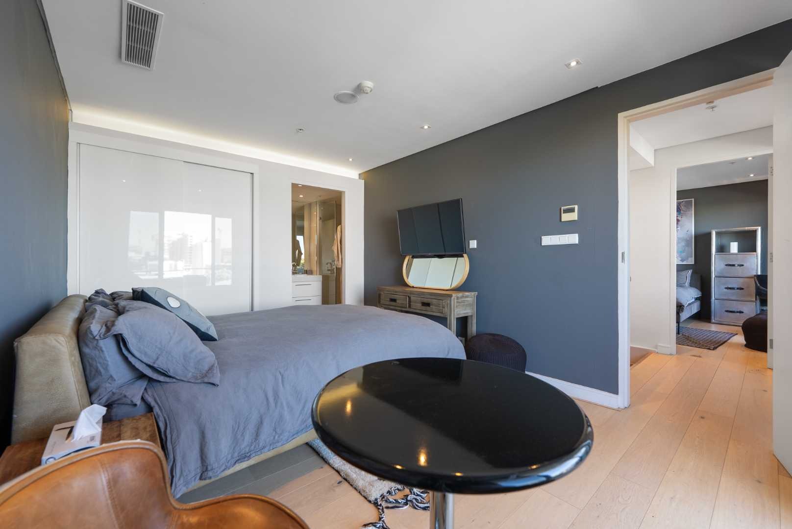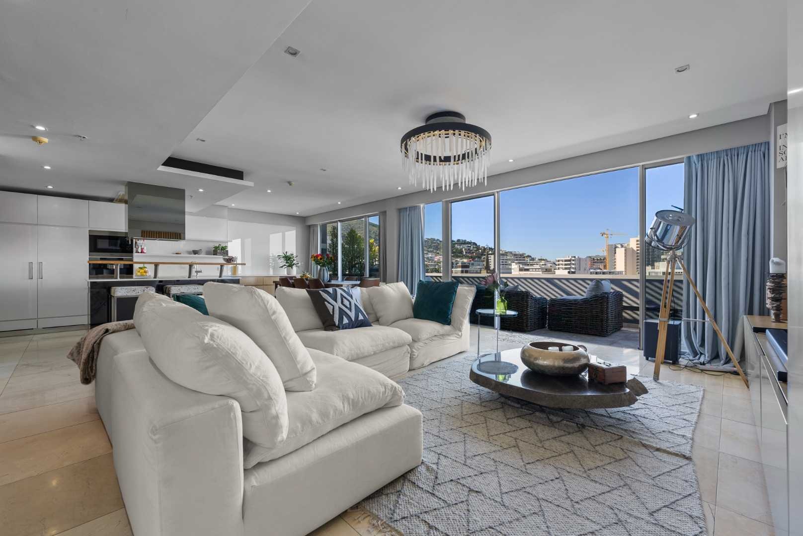 The penthouse features three spacious en-suite bedrooms with built-in cupboards, a guest cloakroom, and expansive open-plan living areas that seamlessly connect the kitchen, dining, and lounge. The modern kitchen, complete with a separate scullery, is both functional and beautiful — ideal for entertaining or relaxed daily living.