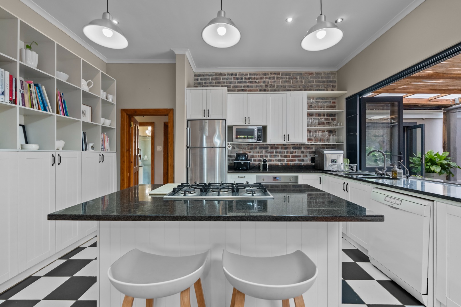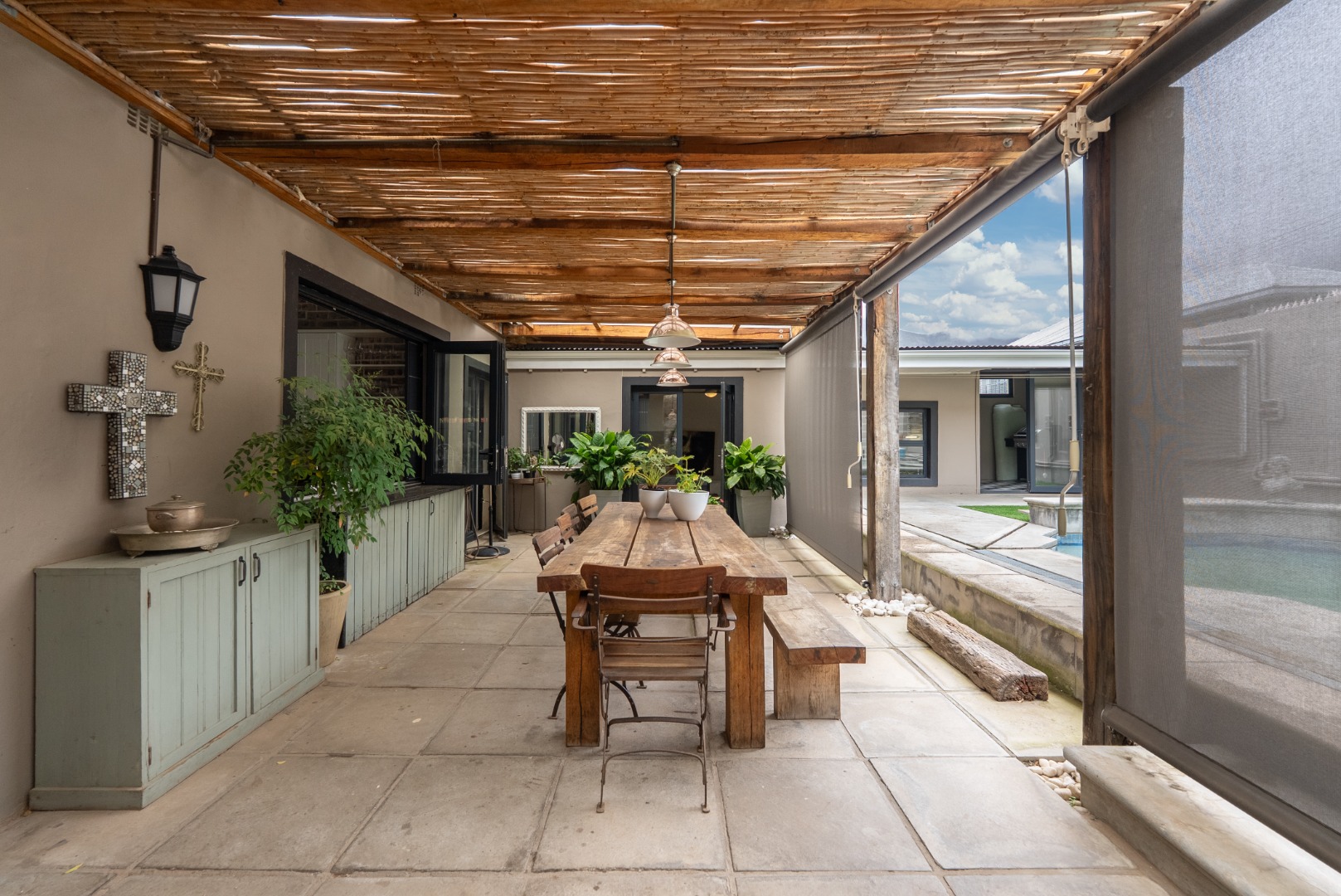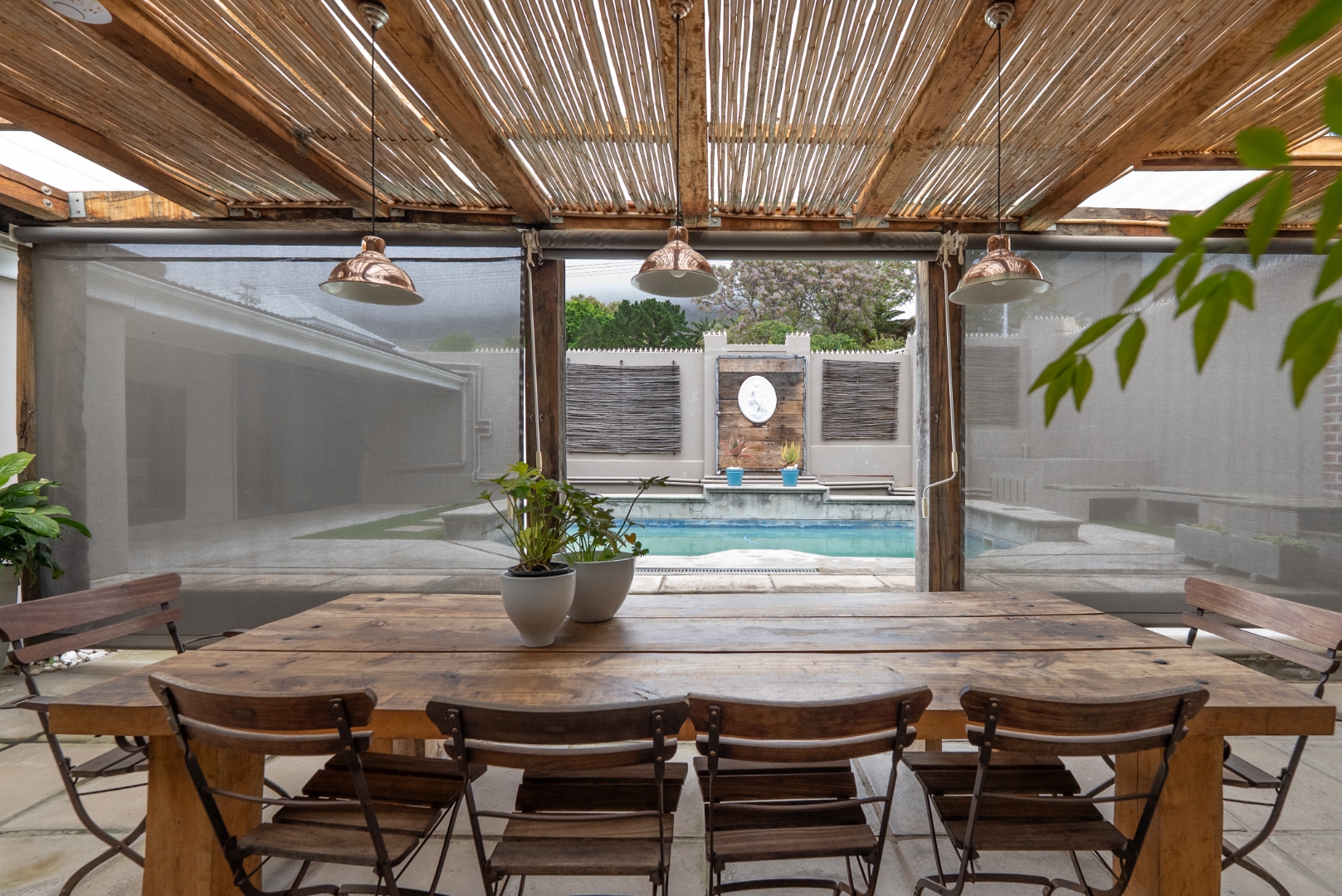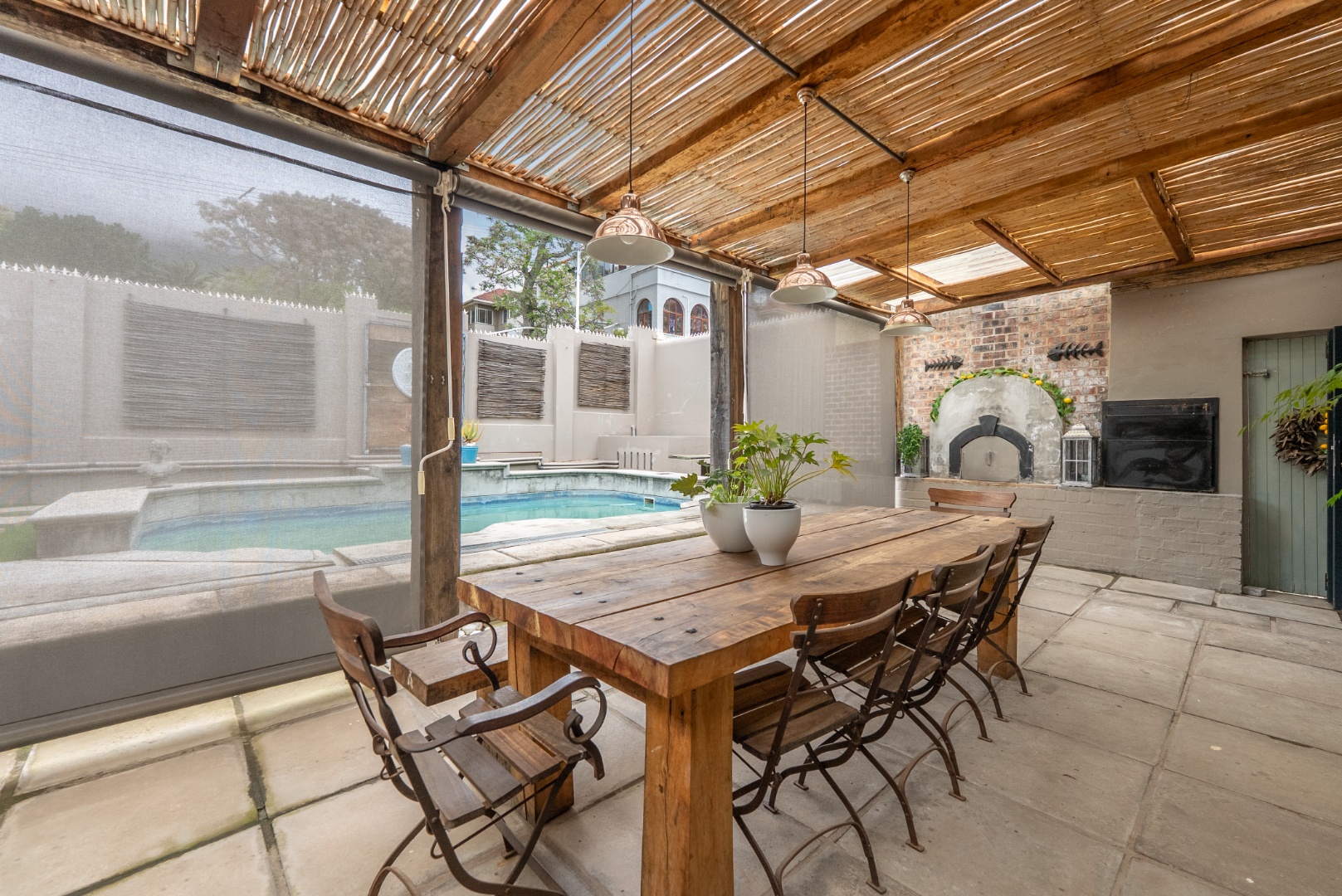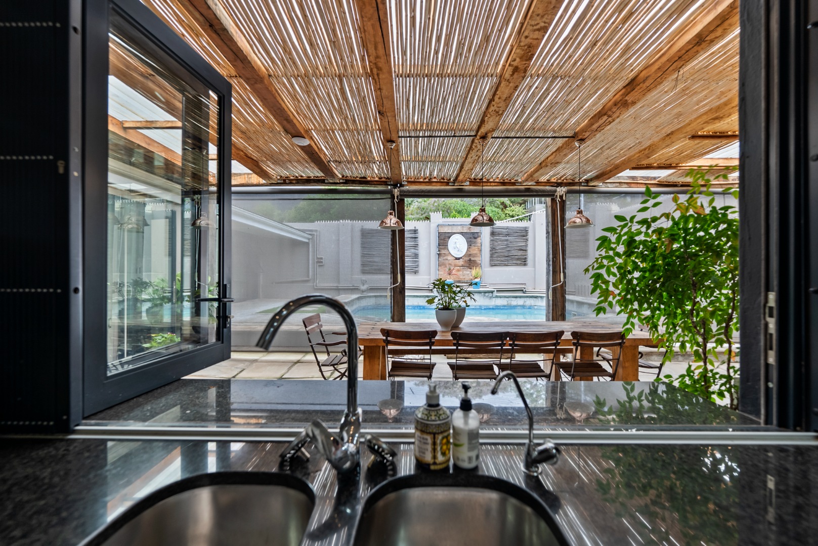 Stacking sliding doors open seamlessly to a heated swimming pool – perfect for year-round