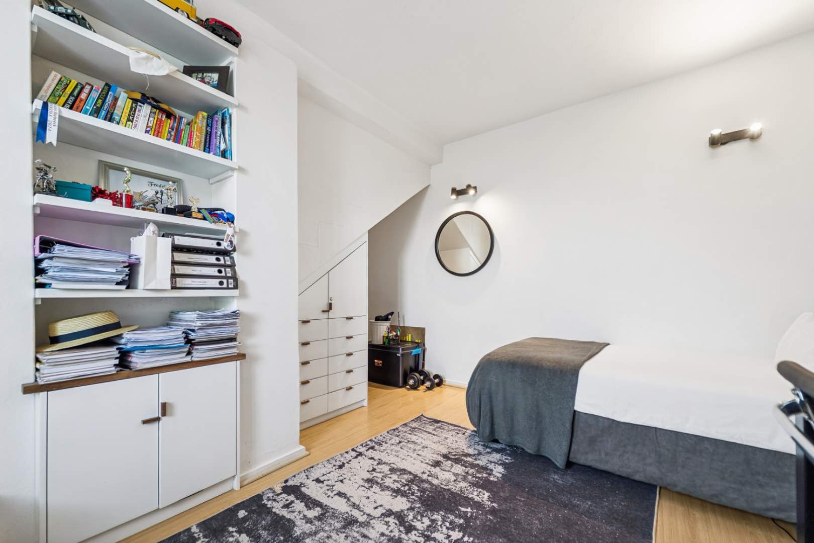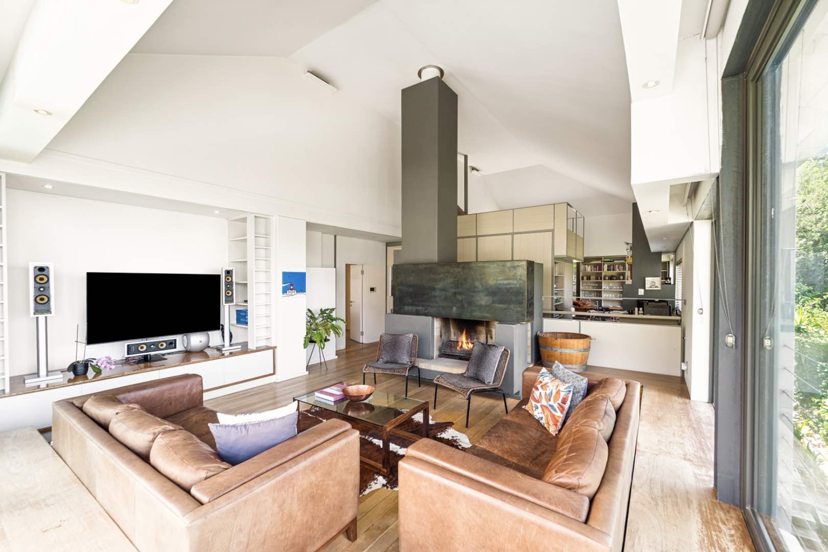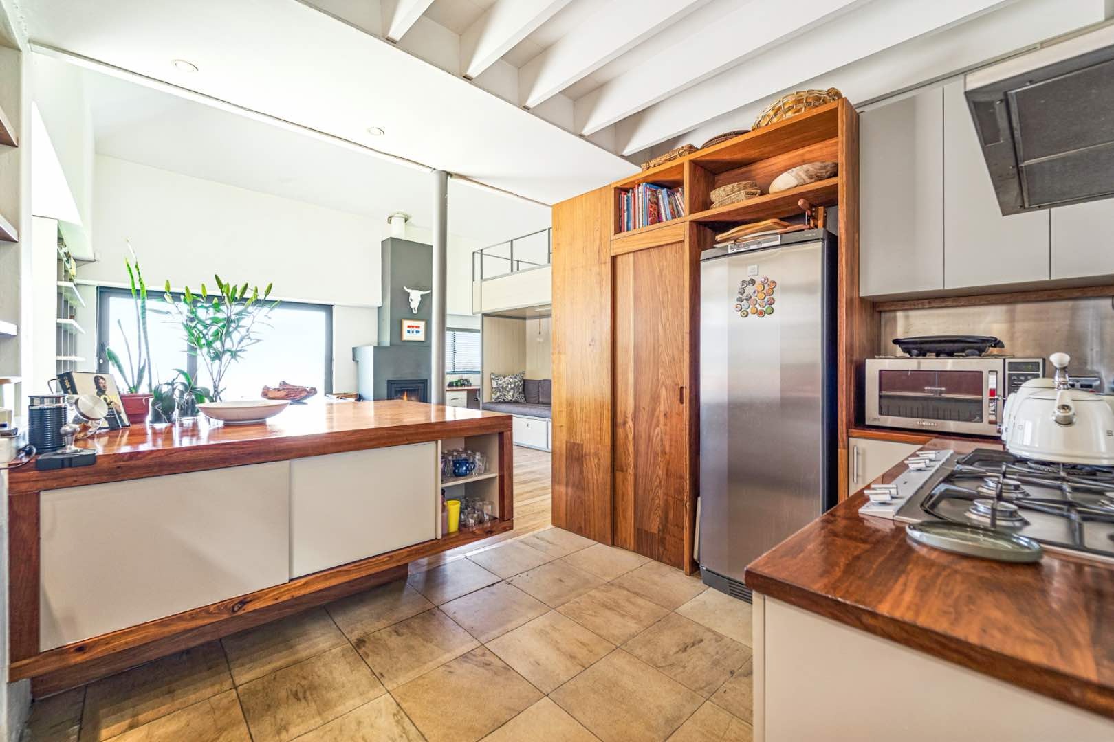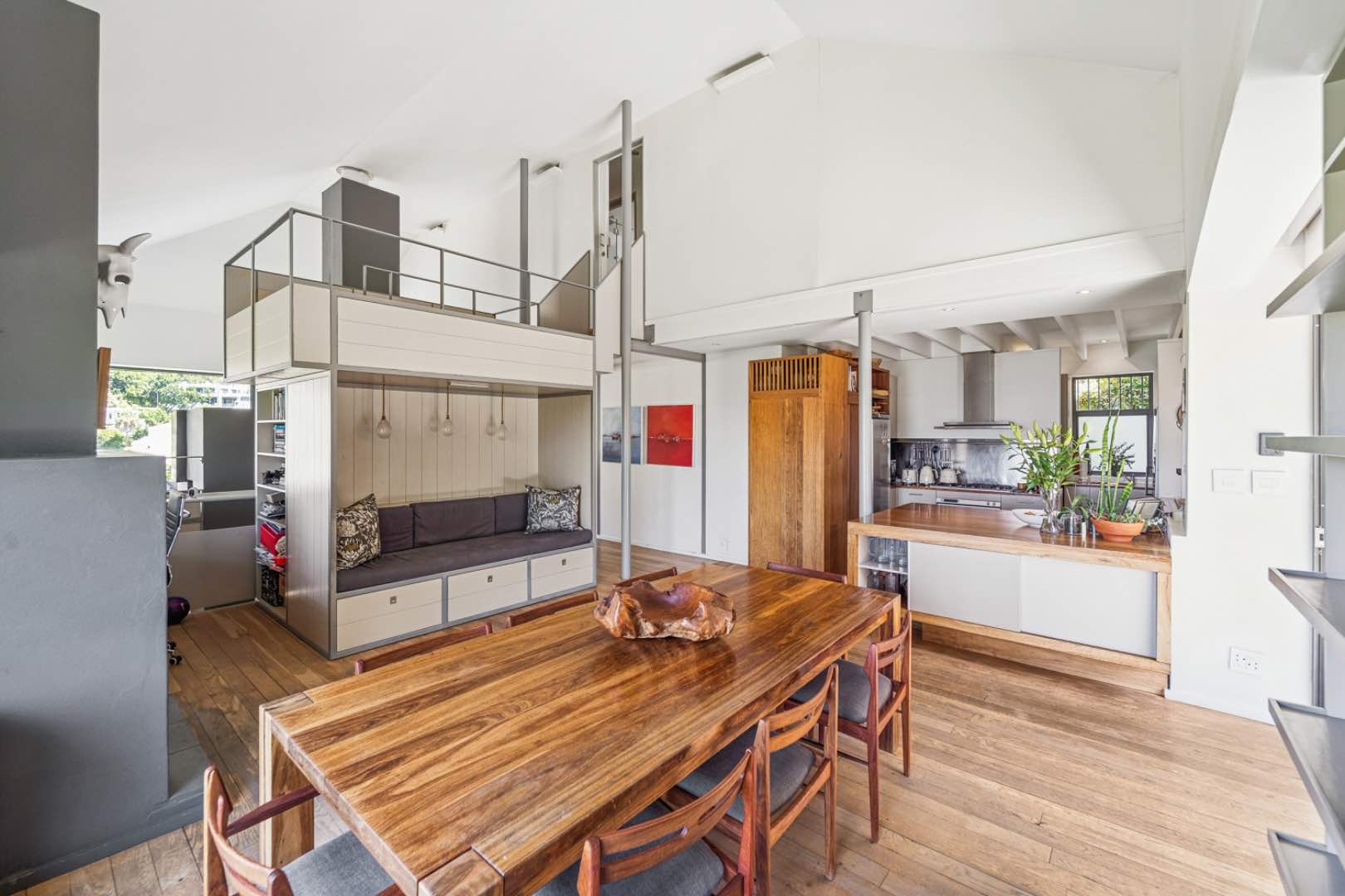 A guest bedroom with air conditioning and built-in cupboards awaits as you make your way up to the second level. Here you will find an open-plan kitchen, dining & living area and, master bedroom. The contemporary kitchen features stylish finishes, integrated appliances and, a separate scullery, while the living area is framed by expansive double-glazed sliding doors that lead to an outdoor entertainment area. The views of Table Mountain and the City to the East are framed by the large expanse of glass and, a fireplace in the dining area adds warmth in winter, complemented by an additional large wooden fireplace in the lounge that centres this level and creates a unique ambience.