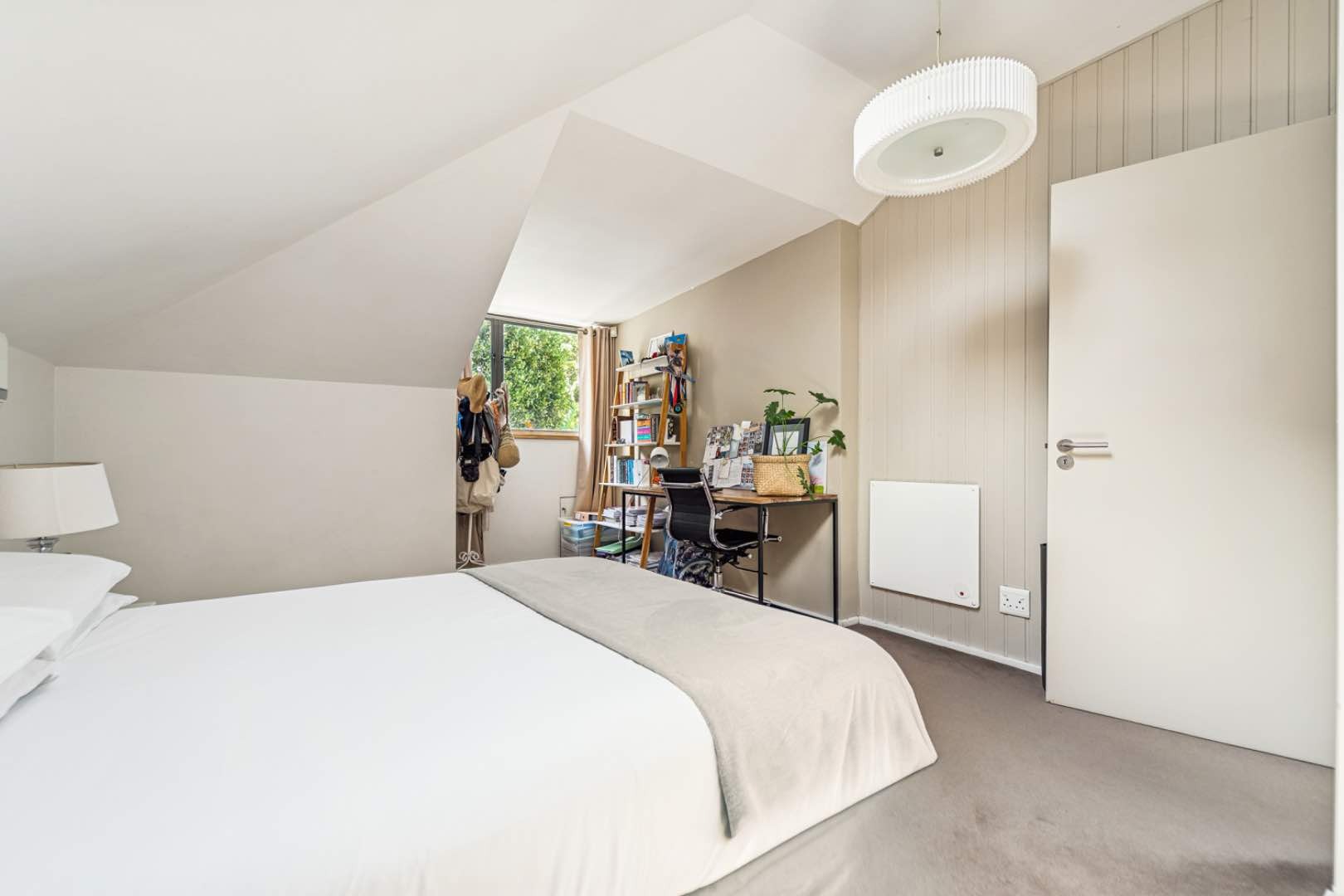 The top level hosts two loft-style bedrooms with a shared full bathroom. Both bedrooms have air conditioning and skylights that fill the spaces with natural light.
