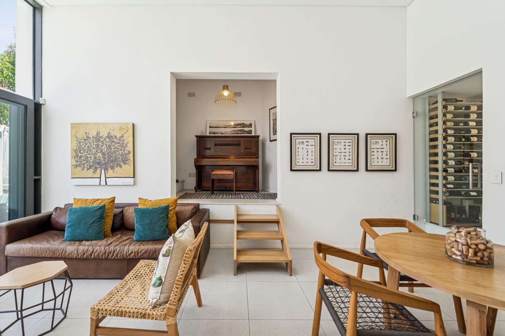 This three-storey residence sits in the sought-after suburb of Higgovale, designed to maximise its scenic position. The first floor, at entrance level, offers an informal lounge and a wine cellar. This light-filled space opens directly onto the outdoor entertainment area, which includes a pool with a heat pump, level lawn, wooden deck and, views that stretch across Table Mountain and the eastern cityscape. A bathroom is also located on this level.