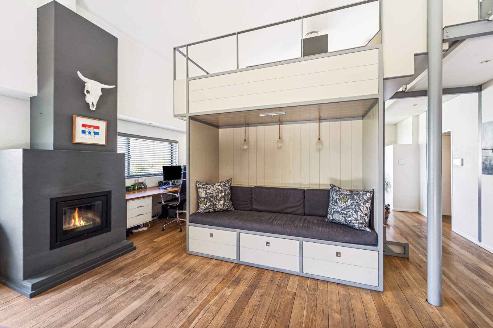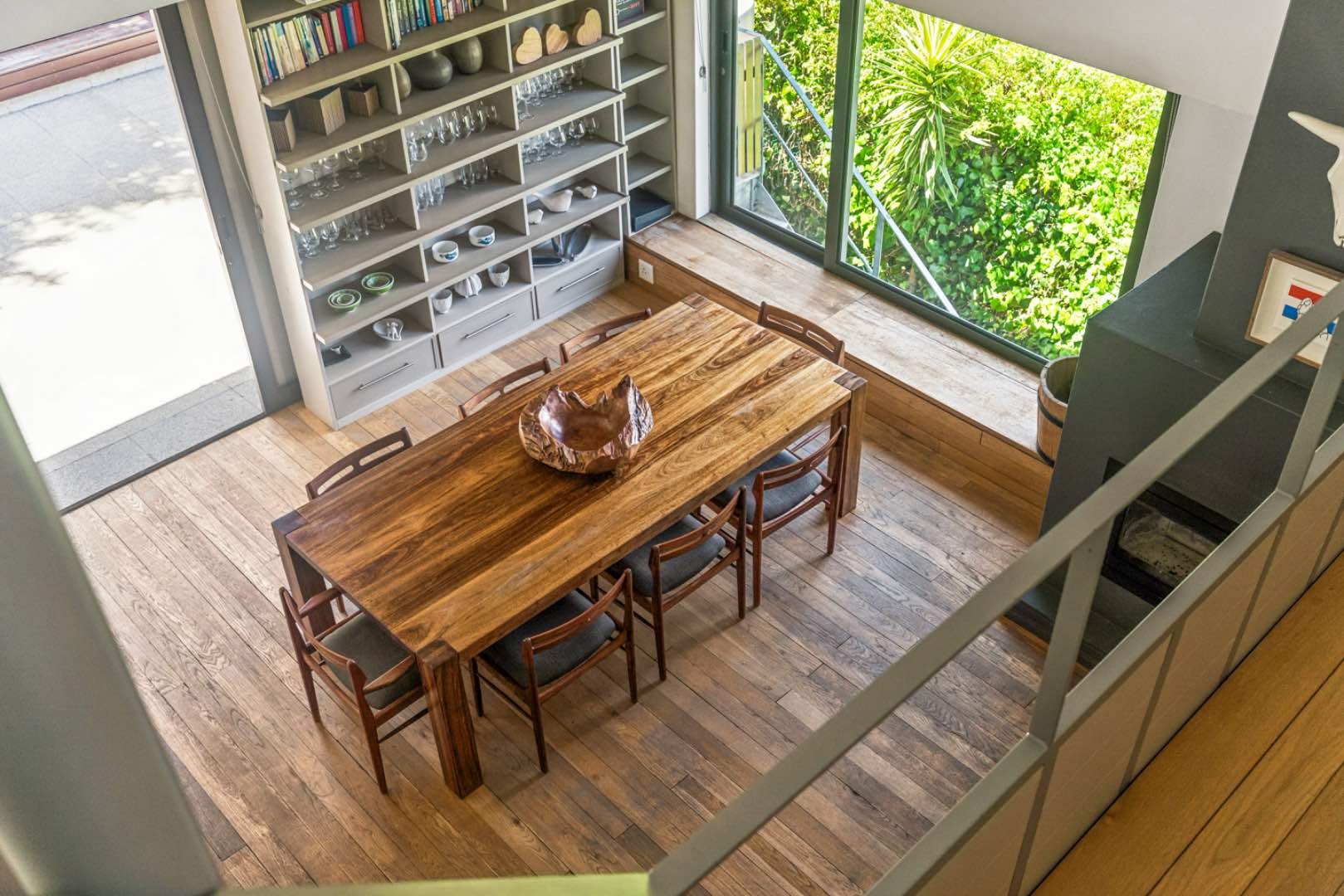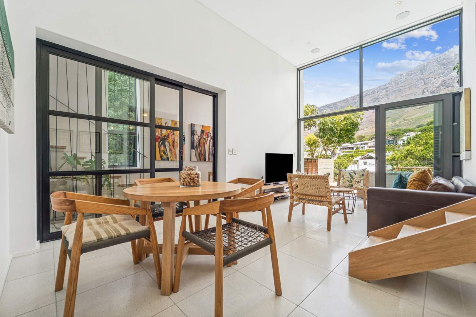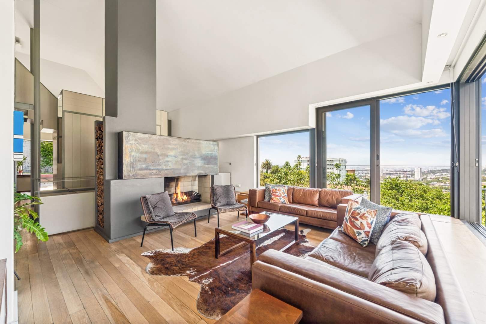 A guest bedroom with air conditioning and built-in cupboards awaits as you make your way up to the second level. Here you will find an open-plan kitchen, dining & living area and, master bedroom. The contemporary kitchen features stylish finishes, integrated appliances and, a separate scullery, while the living area is framed by expansive double-glazed sliding doors that lead to an outdoor entertainment area. The views of Table Mountain and the City to the East are framed by the large expanse of glass and, a fireplace in the dining area adds warmth in winter, complemented by an additional large wooden fireplace in the lounge that centres this level and creates a unique ambience.