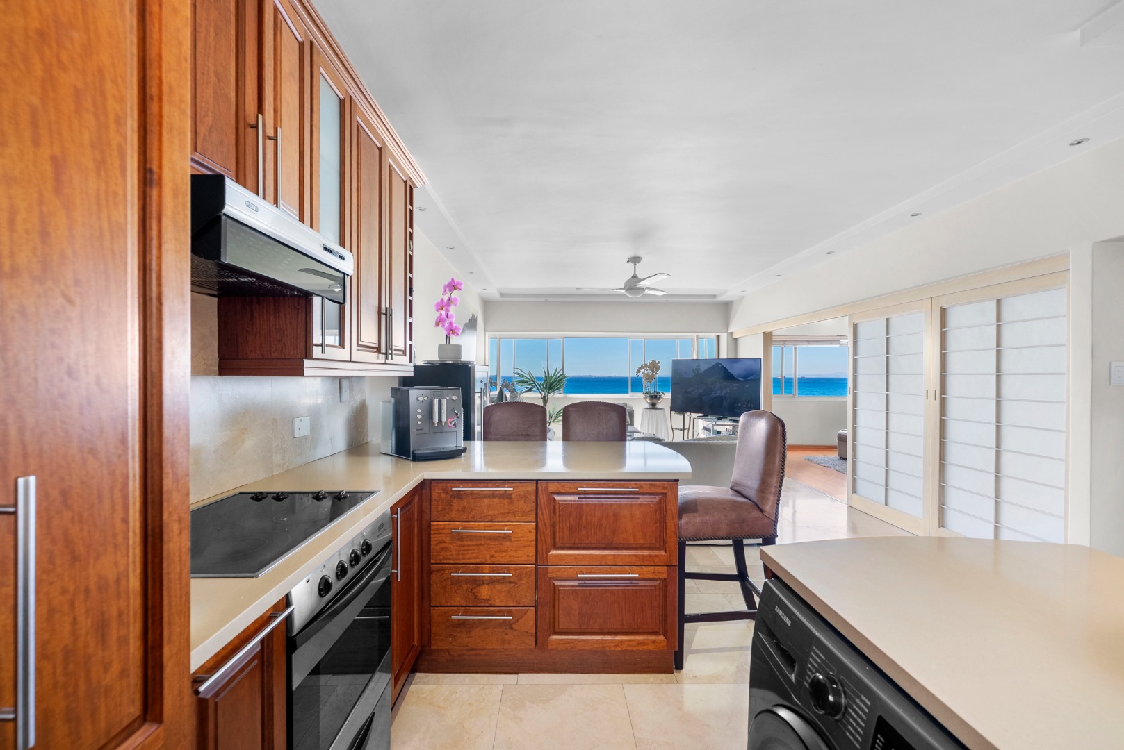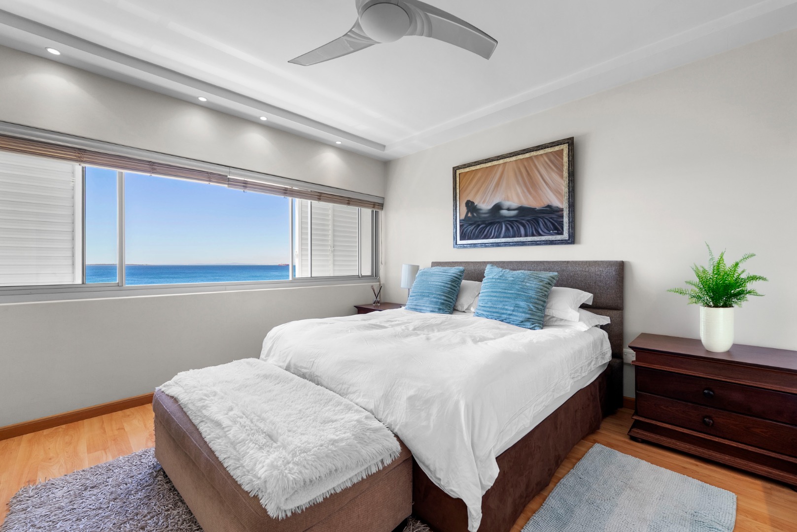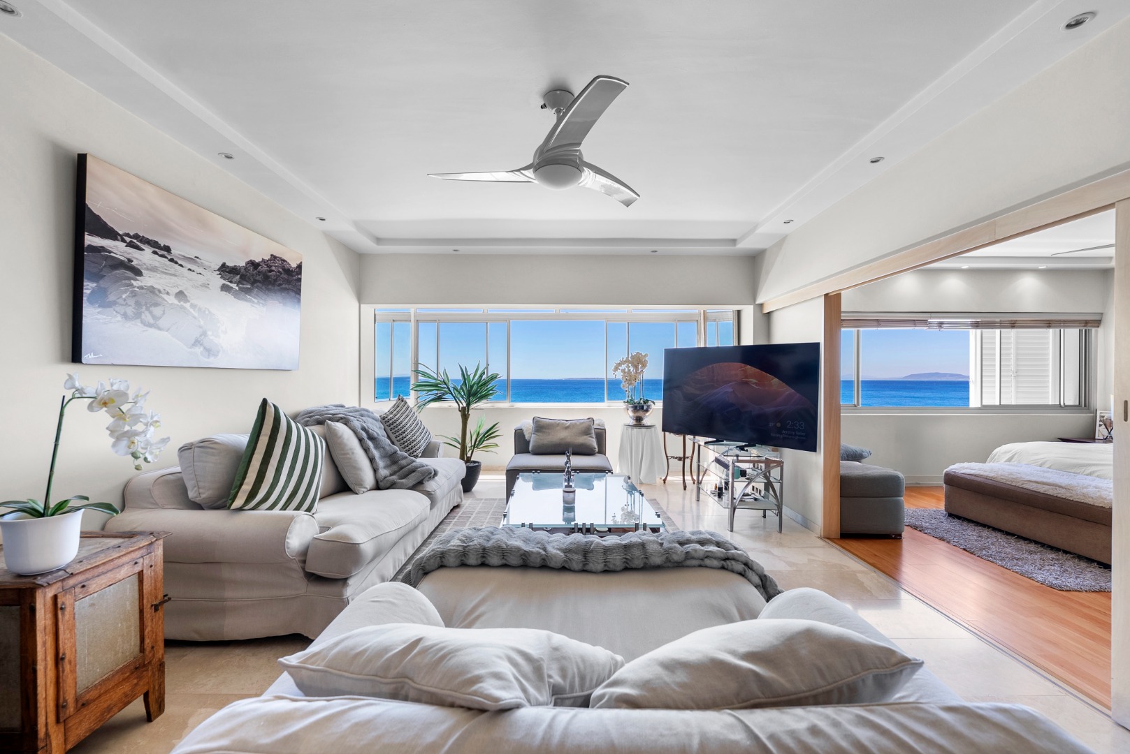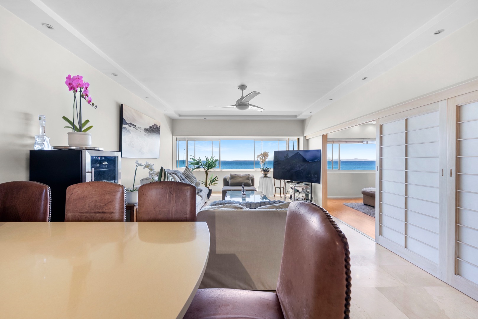 North-facing, the open-plan living area and spacious en-suite main bedroom are perfectly positioned to soak up the sea outlook — with ships gliding past by day and the soothing sound of the ocean at night.