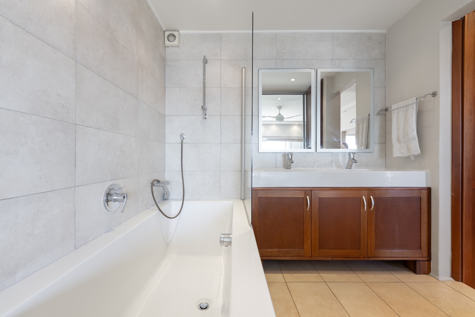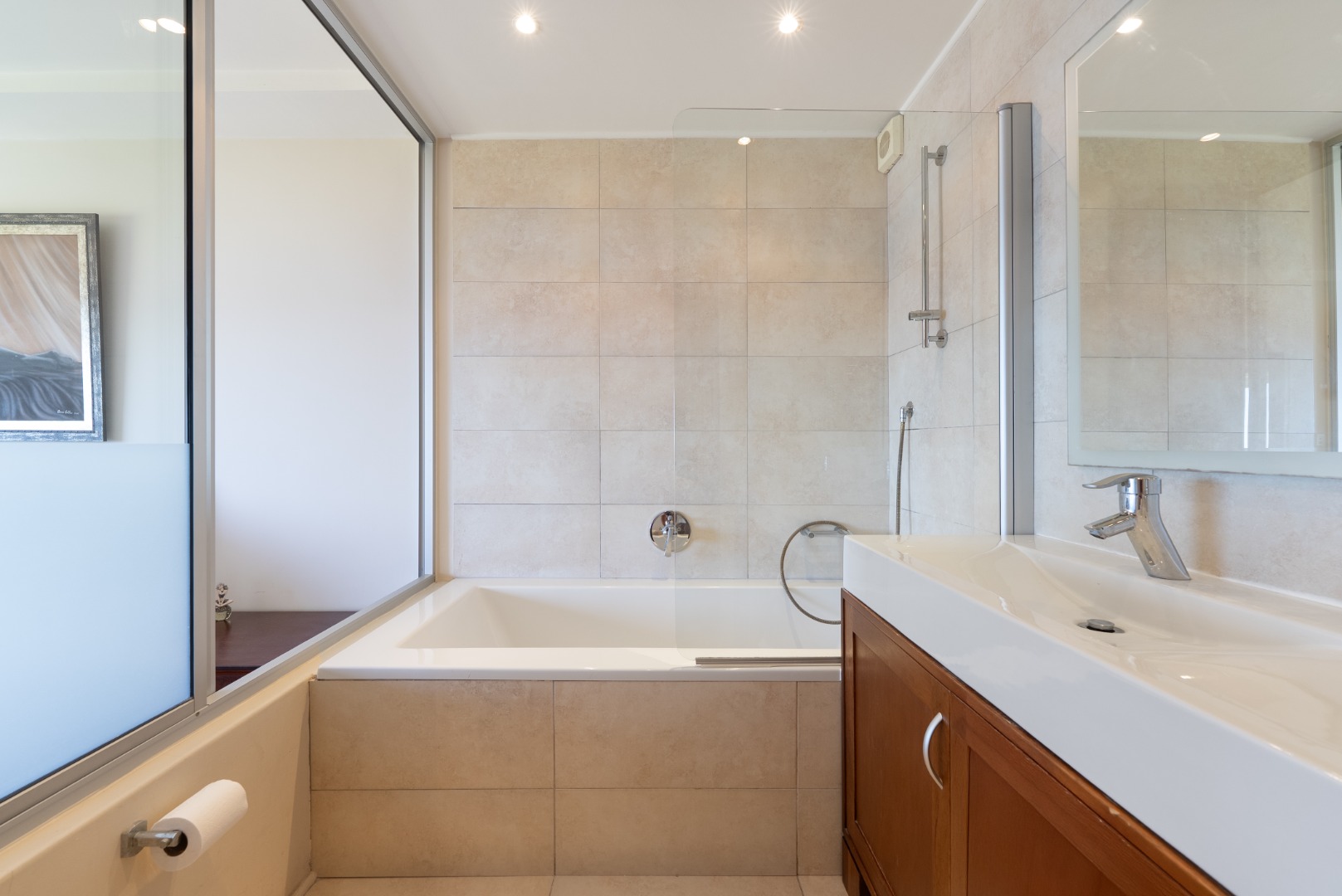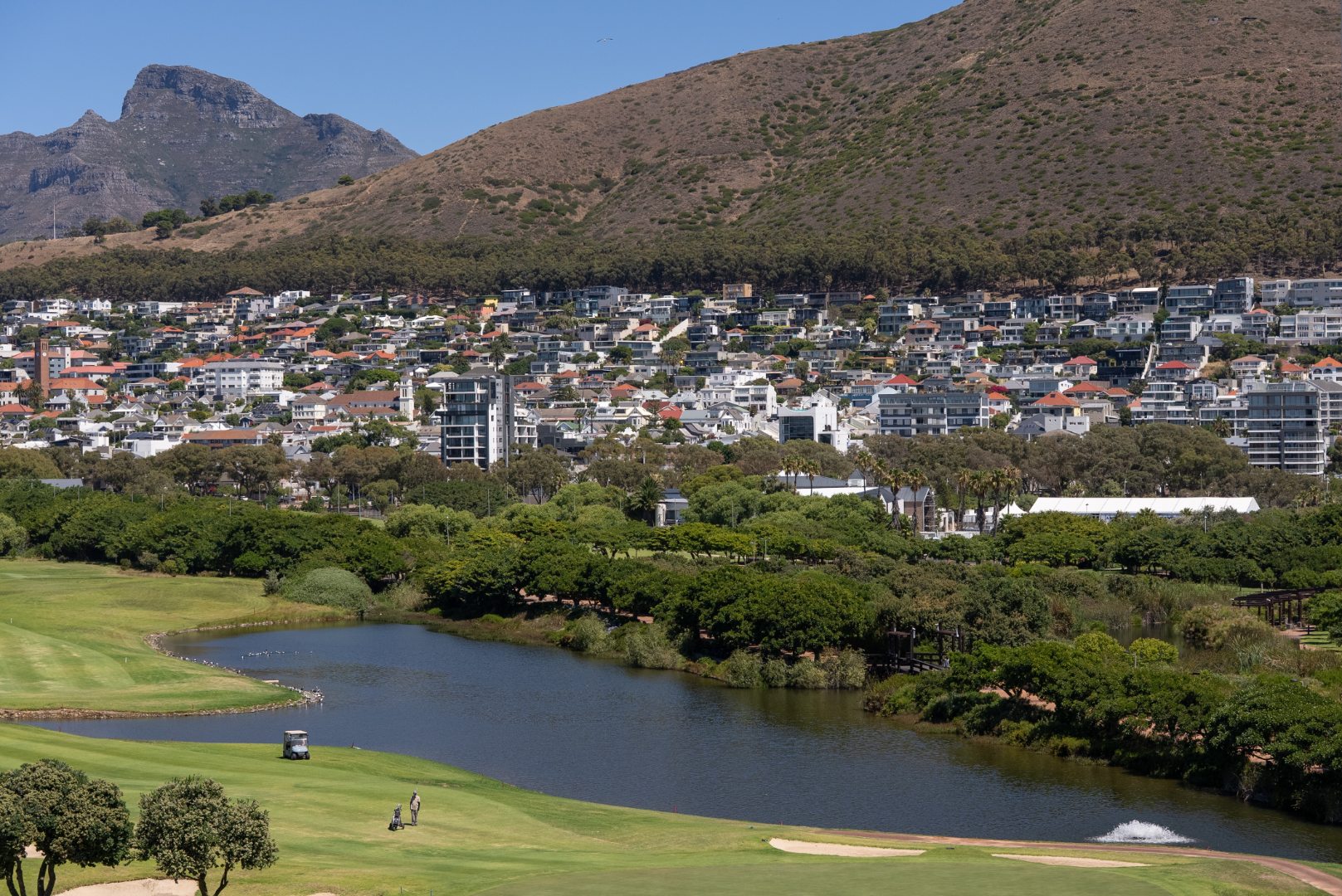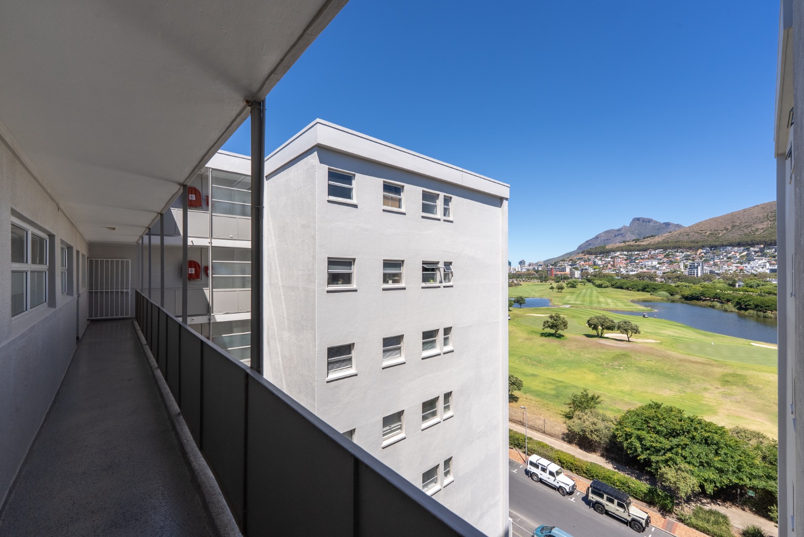 To the south, the kitchen and second bedroom enjoy leafy views over the golf course and adjacent urban park, offering a pleasant balance of outlooks and natural light throughout the home.