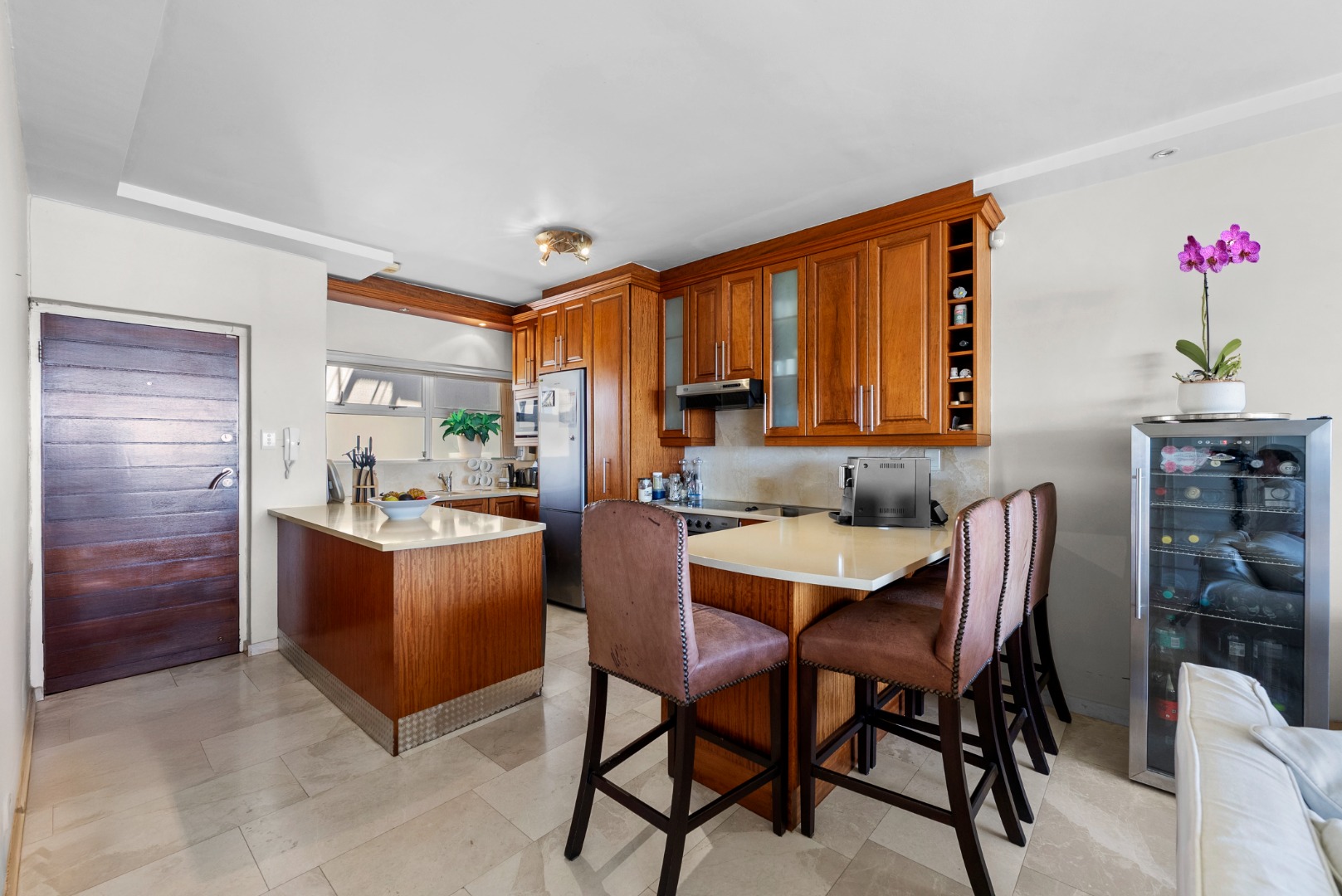 A previous renovation introduced a solid African rosewood kitchen, complemented by luxurious marble flooring and bathrooms, all presented in excellent condition. An enclosed balcony enhances the living space while framing the spectacular sea views.
