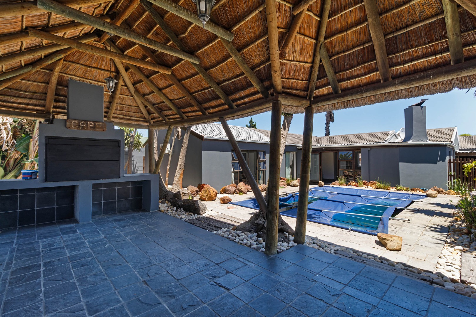 From the bustle of the house is a lovely braai area with Pizza oven and entertainment area with seating. Lovely size plot for the dogs.