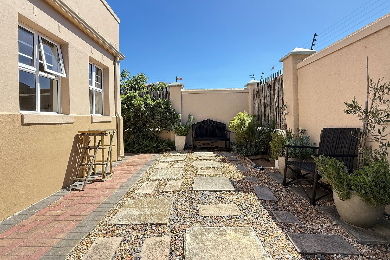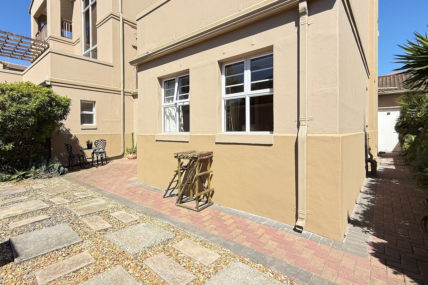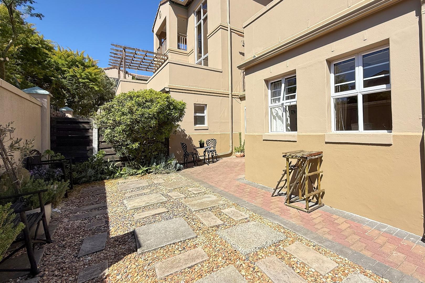 This immaculate residence features two spacious bedrooms, both adorned with elegant wooden floors and equipped with built-in cupboards. The main bedroom offers a serene escape, opening onto a charming sunroom where you can enjoy your morning coffee while overlooking the lush garden. The main en suite bathroom is designed with a modern shower, toilet, and basin for your convenience, while the second bathroom includes a bath, toilet, and basin.