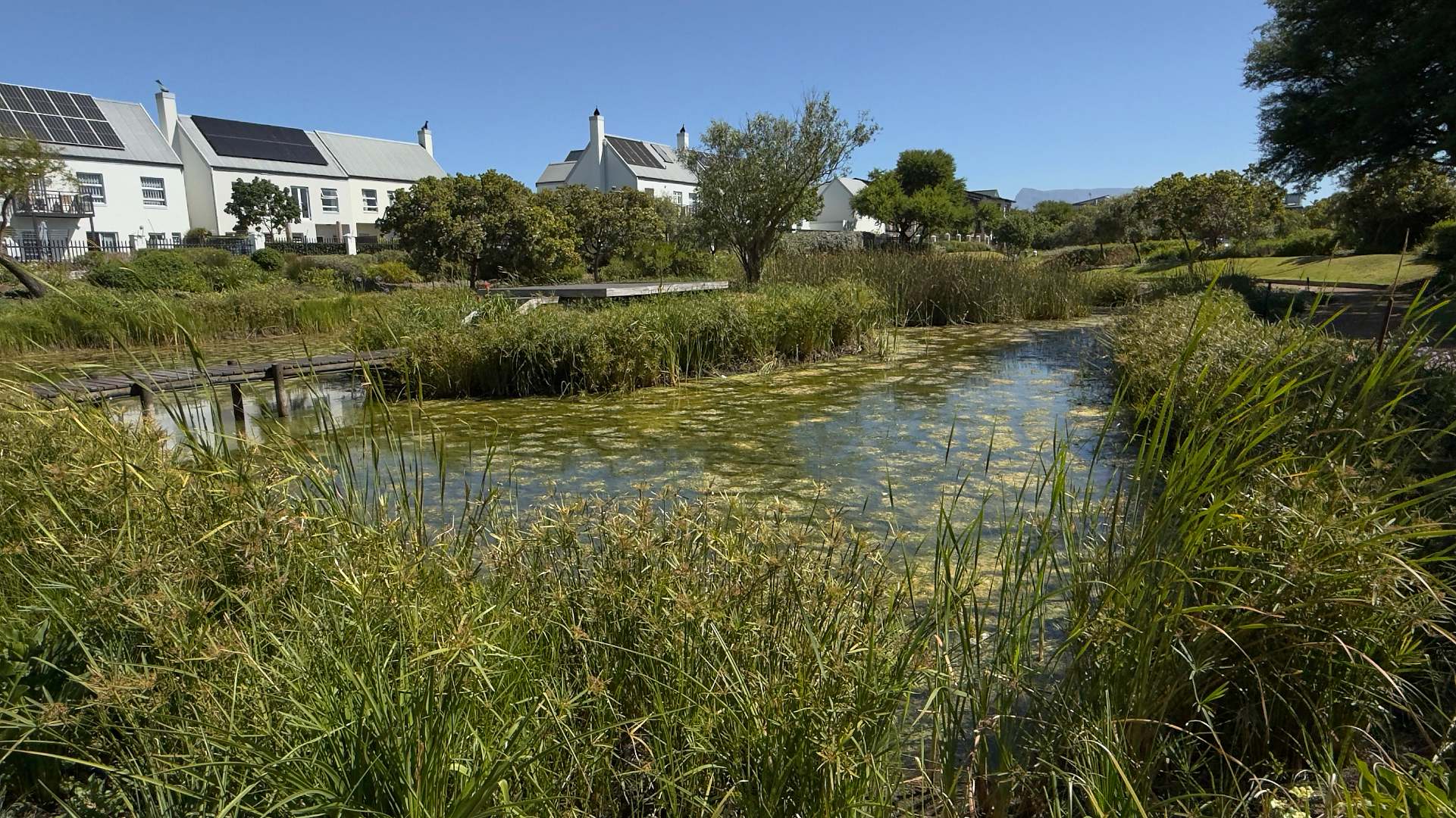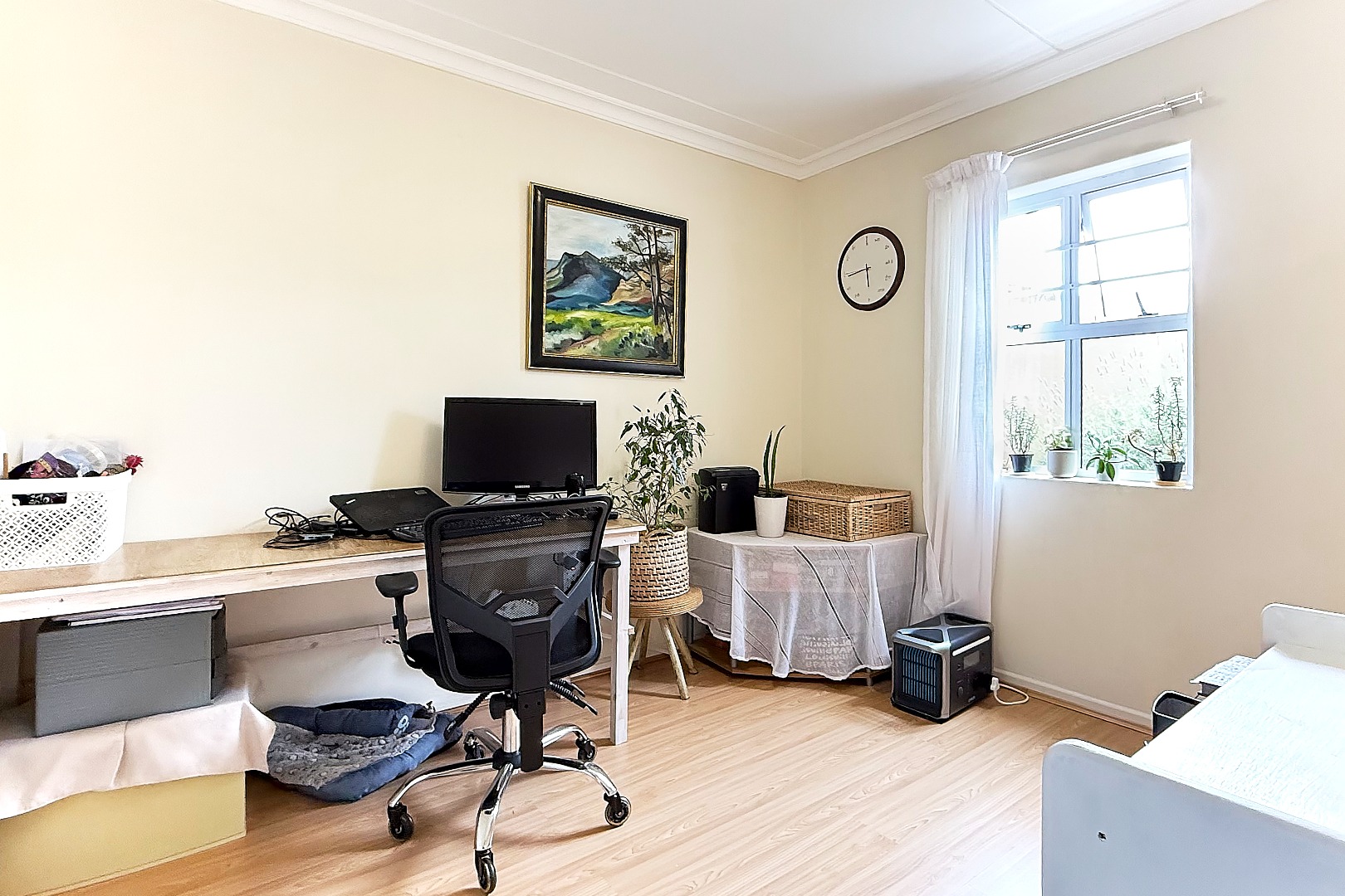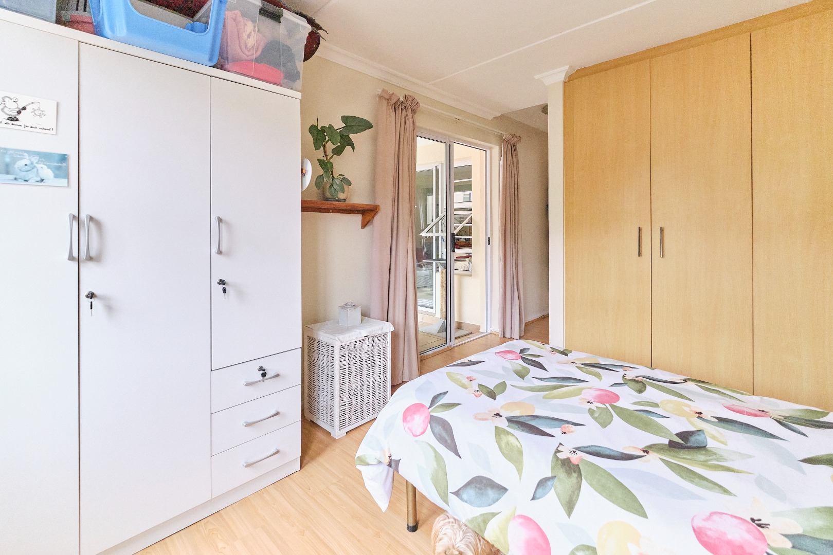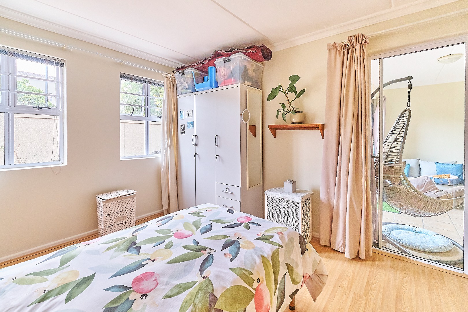 This immaculate residence features two spacious bedrooms, both adorned with elegant wooden floors and equipped with built-in cupboards. The main bedroom offers a serene escape, opening onto a charming sunroom where you can enjoy your morning coffee while overlooking the lush garden. The main en suite bathroom is designed with a modern shower, toilet, and basin for your convenience, while the second bathroom includes a bath, toilet, and basin.
