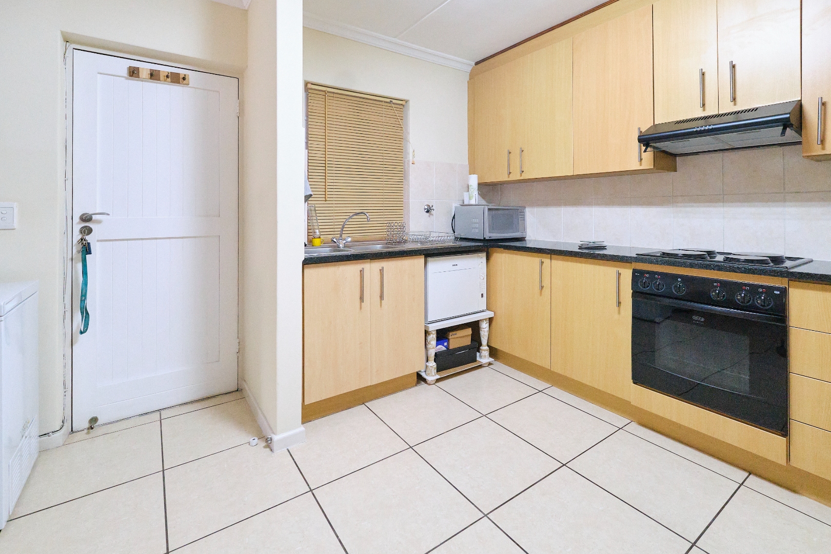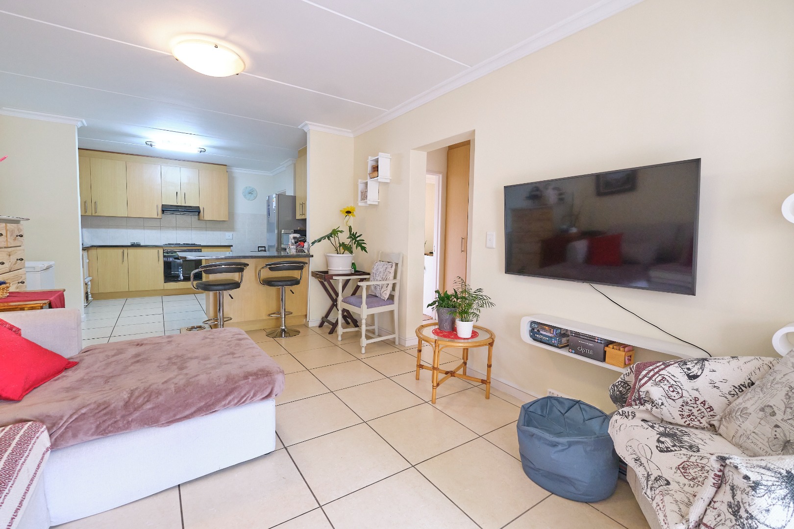 The expansive tiled living room seamlessly transitions into the sunroom, creating a light-filled space that leads directly to the inviting garden. The large kitchen is a chef’s dream, boasting ample cupboard space and sleek granite countertops. For added convenience, the single automated garage provides extra space and includes a plumbing point, offering direct access to the kitchen.
