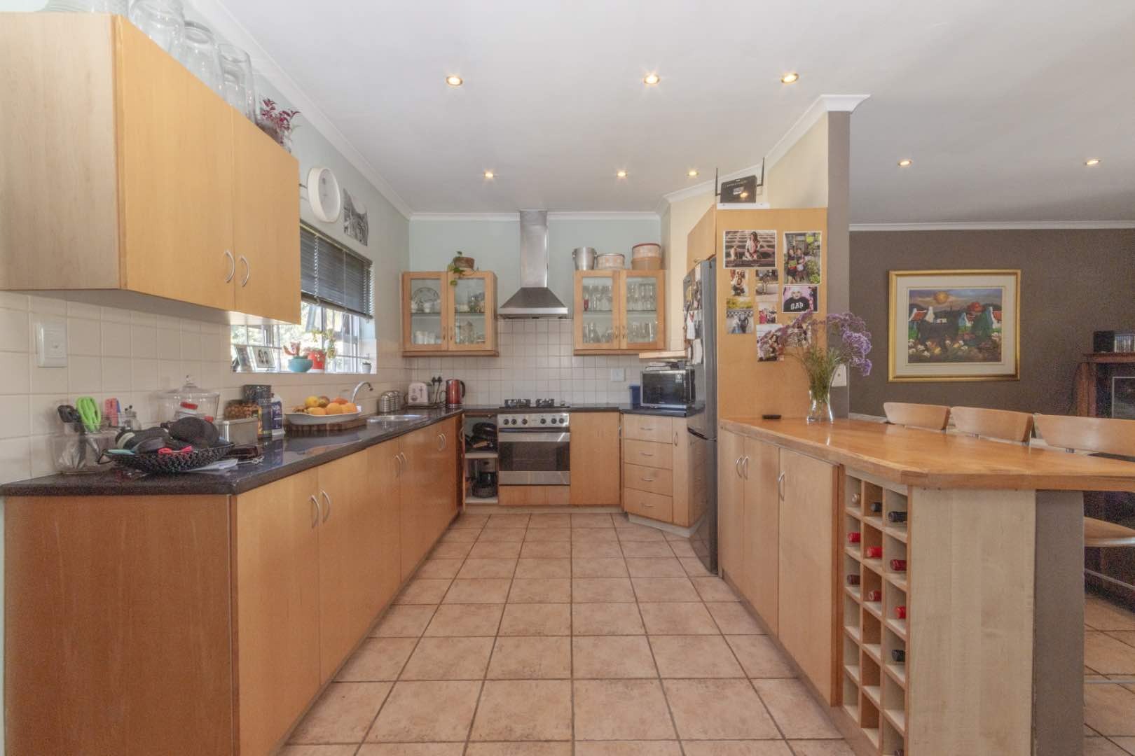 north-facing, lush garden. The kitchen has ample cupboards, a gas hob with an