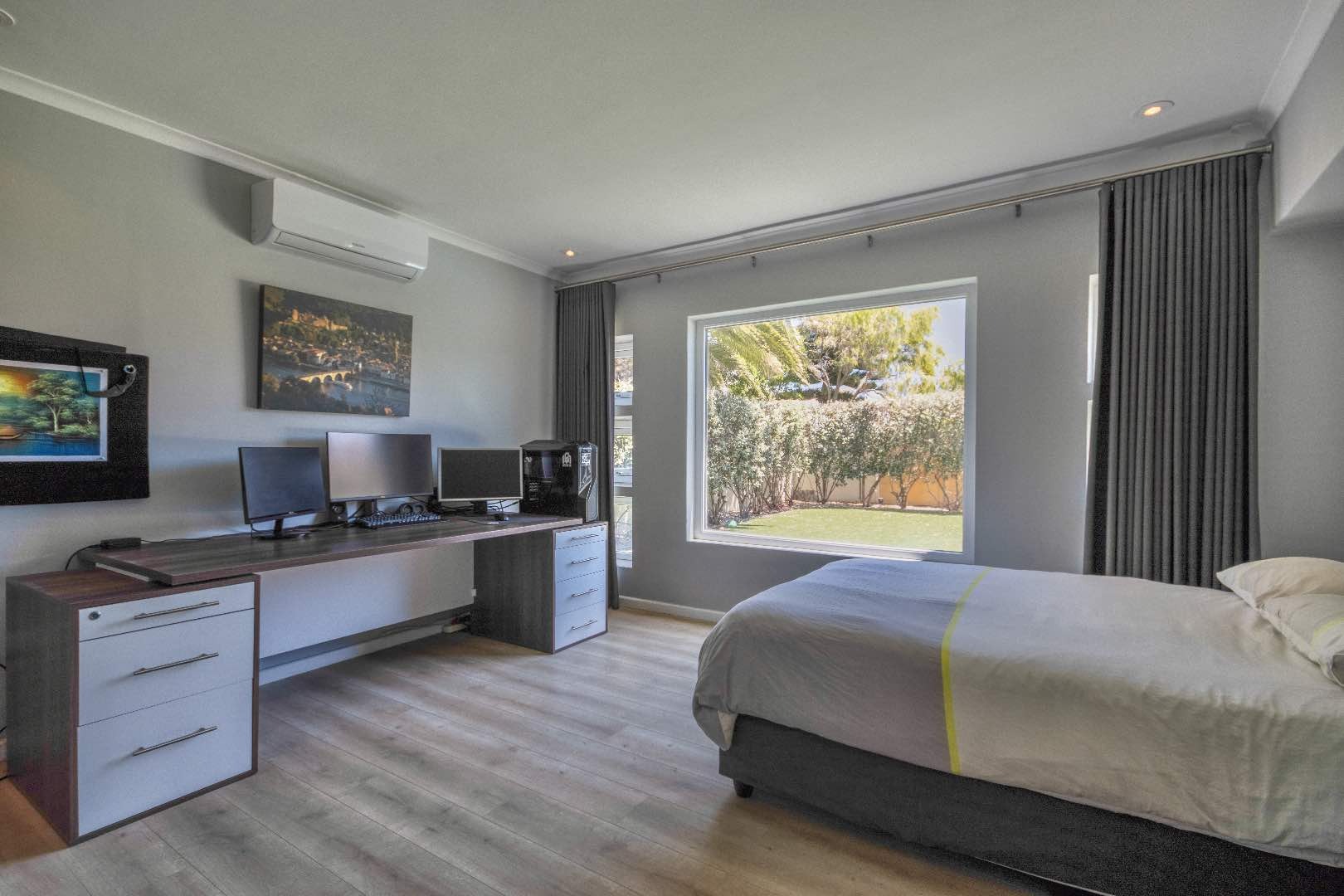 Set on an expansive erf with immaculate low-maintenance landscaping, the property welcomes you with a sparkling blue pool, astro-turf lawn, and a crisp architectural façade. A sculptural spiral staircase leads to the impressive rooftop deck—perfect for sunset gatherings, morning coffee, and enjoying views towards Table Mountain.