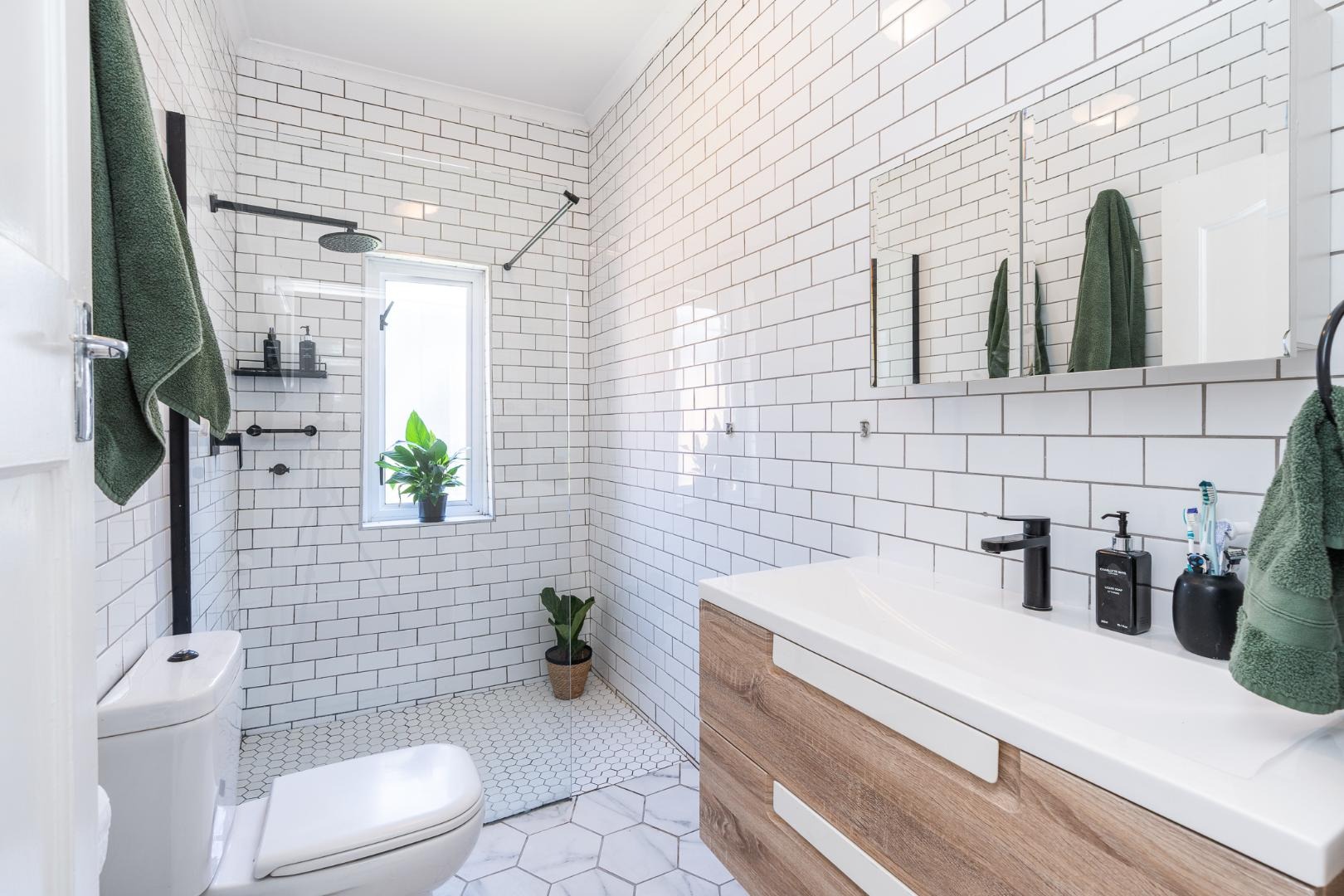 Trendy bathroom with large shower and hand basin vanity unit for storage.
