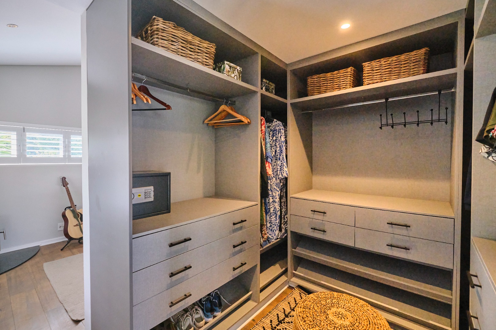 A double garage with concrete shelving and built-in cupboards and secure ample visitors' parking.