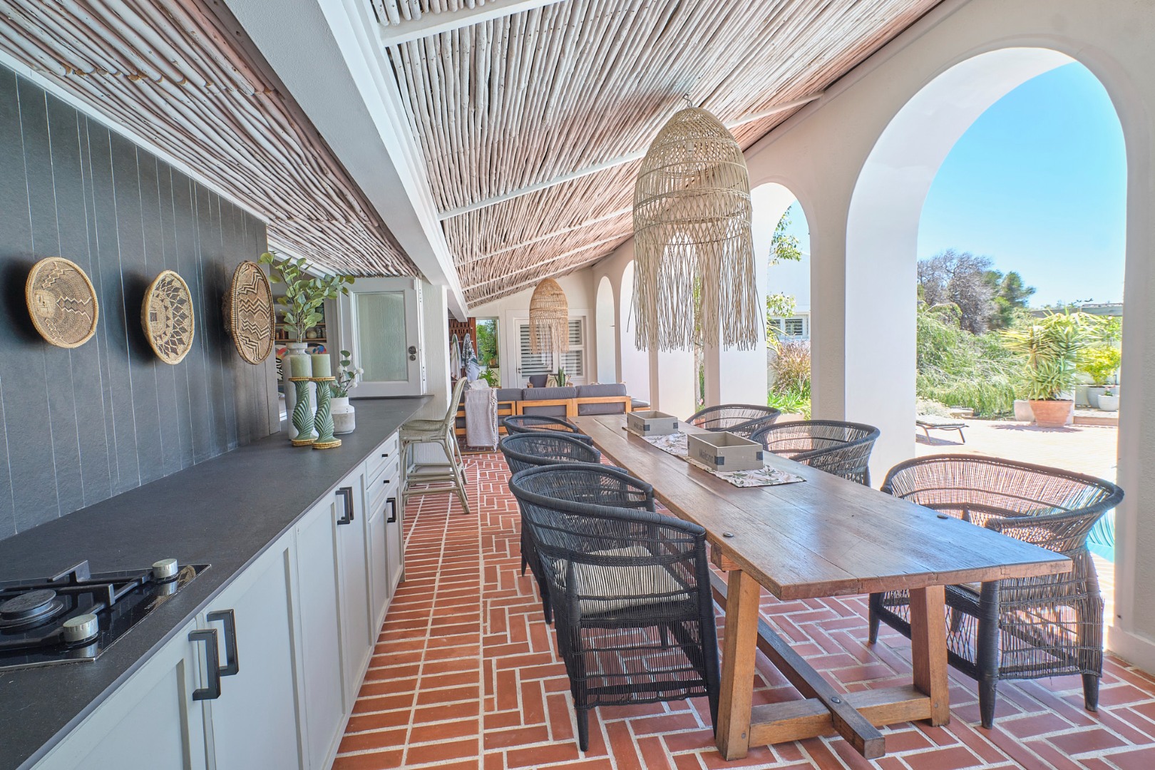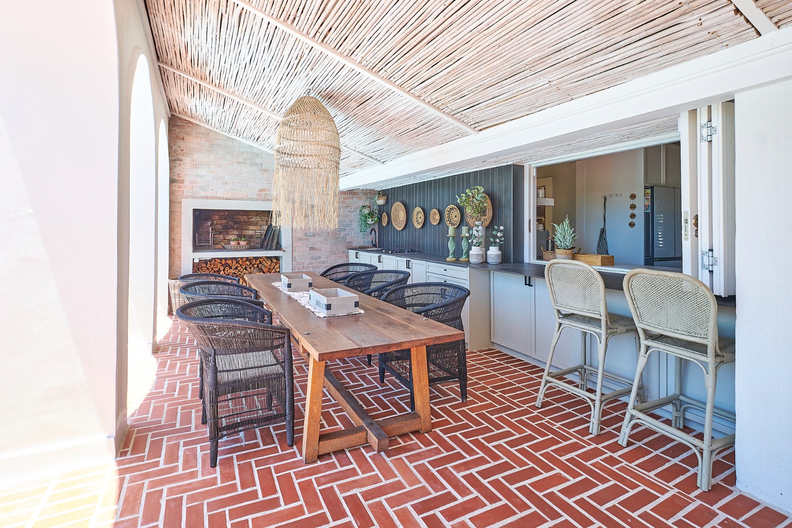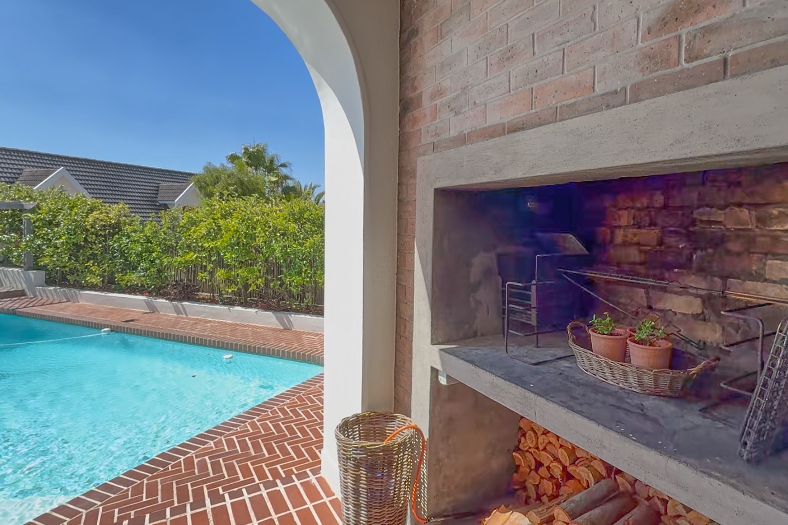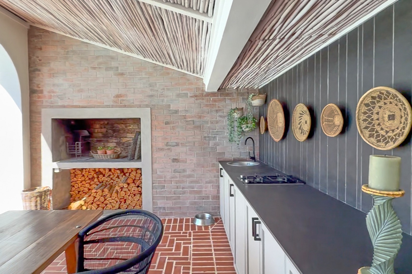 Step outside to discover a large covered patio with ample space for lounging or dining while enjoying the beautiful sunrises and sunsets. The patio is equipped with a built-in braai, kitchenette with a large countertop, gas cooktop, and prep bowl, all overlooking a magnificent sparkling swimming pool. The surrounding paved area is perfect for those fun pool days. The expansive landscaped garden offers an enchanting escape from the hustle and bustle of daily life.