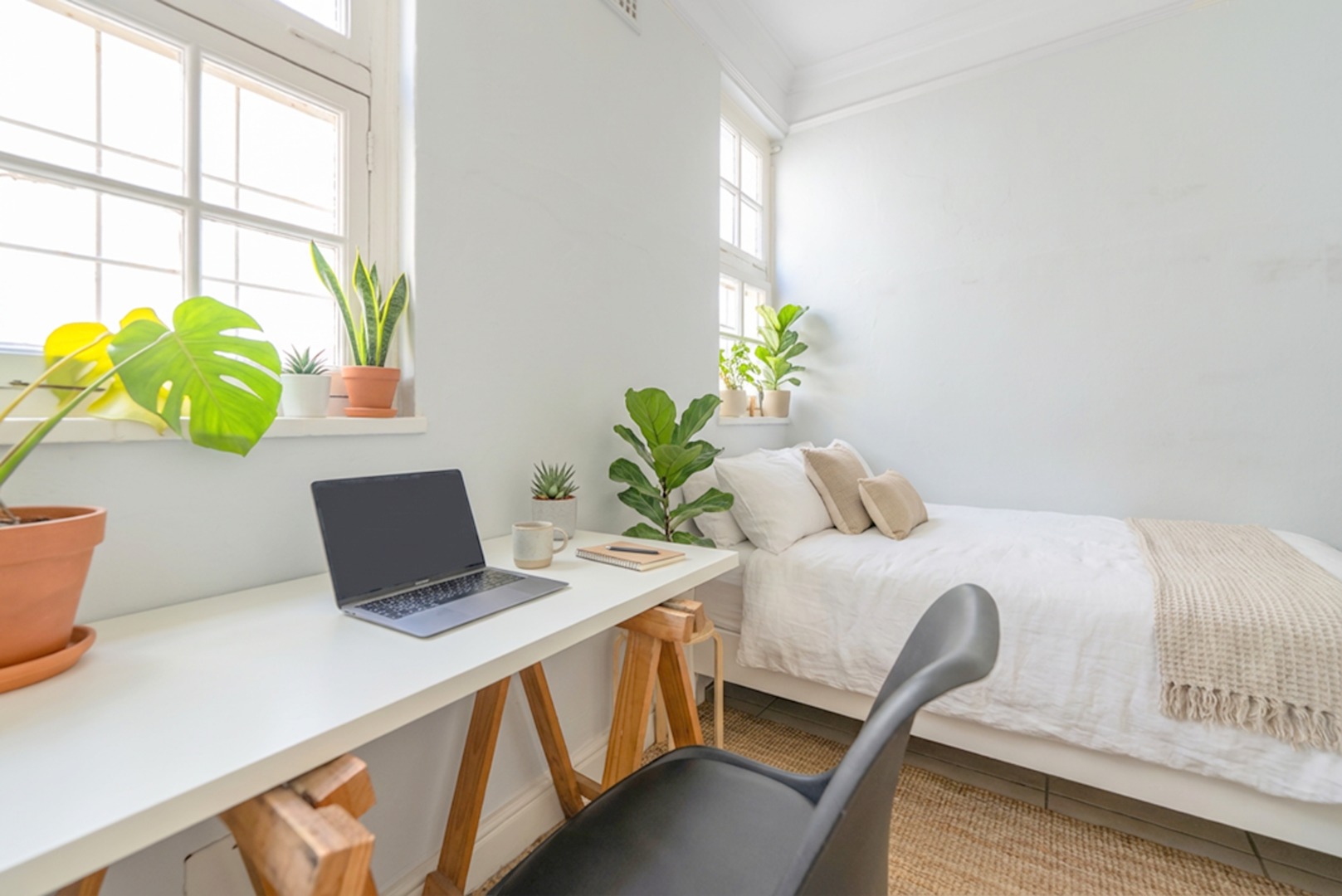 This charming apartment offers two bedrooms, a modern bathroom, a galley kitchen, and a study nook.