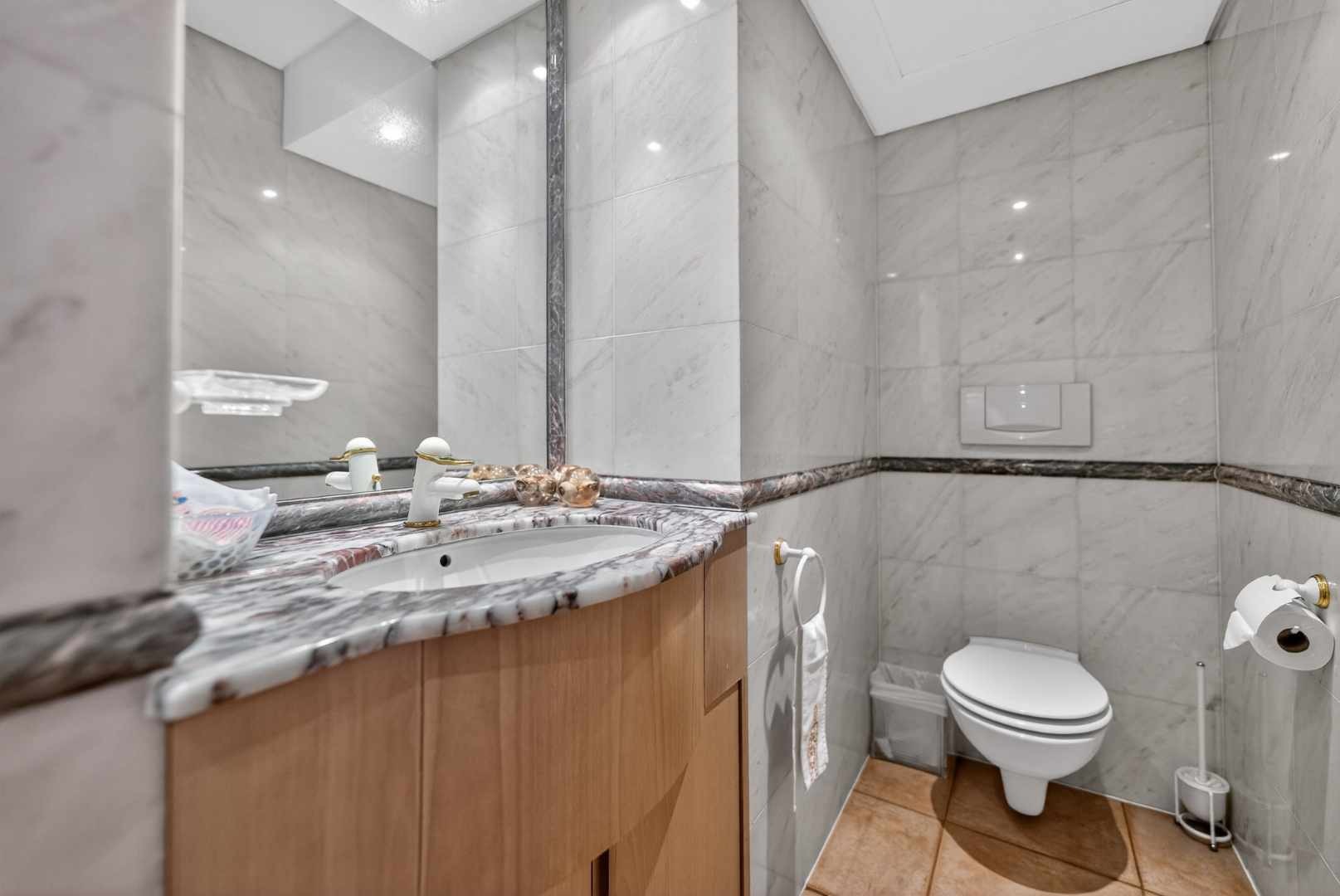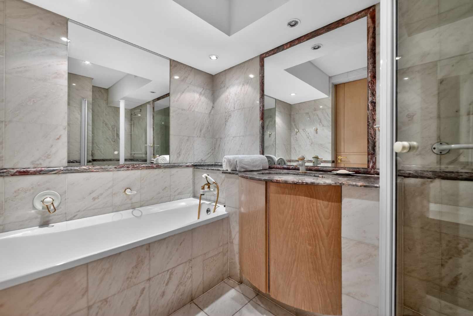The apartment boasts three generously sized bedrooms and three bathrooms, ensuring ample space for family and guests. The master bedroom is a true retreat, offering breathtaking sea views, an abundance of built-in cupboards, and a luxurious en-suite full bathroom.
