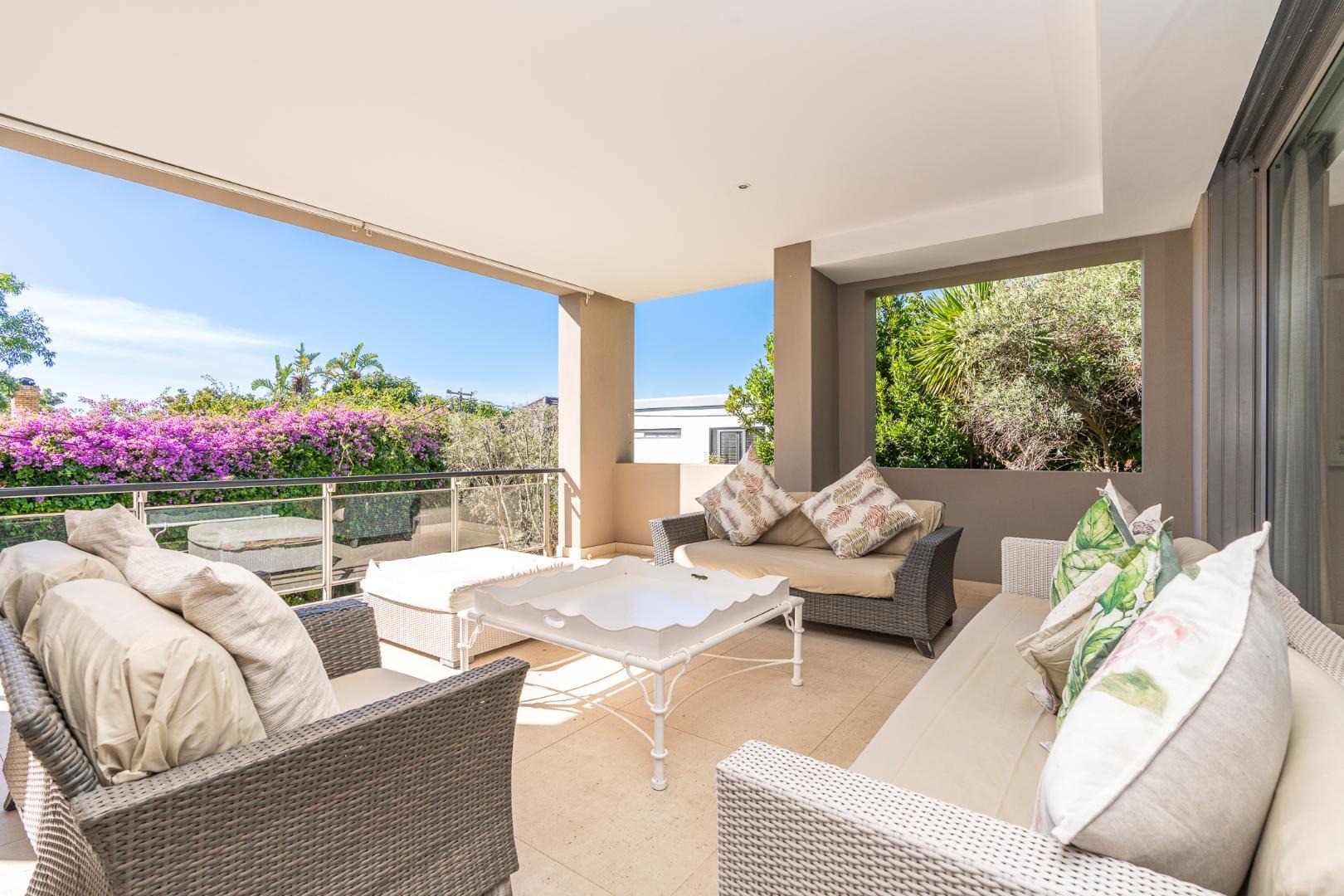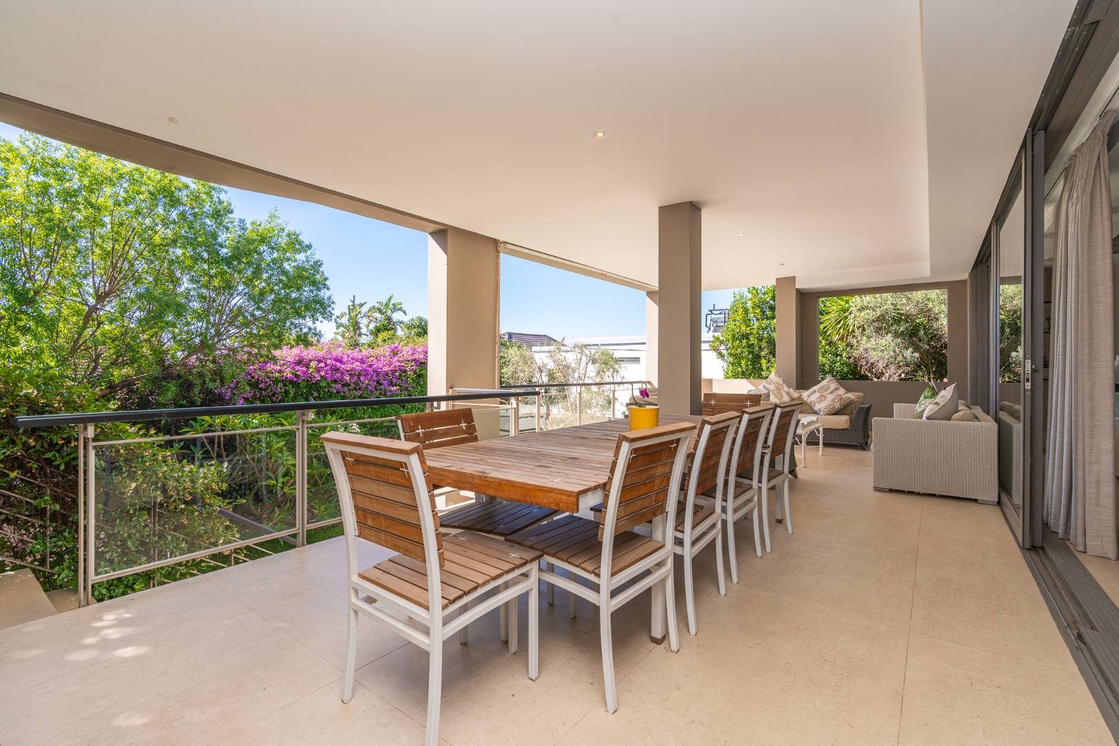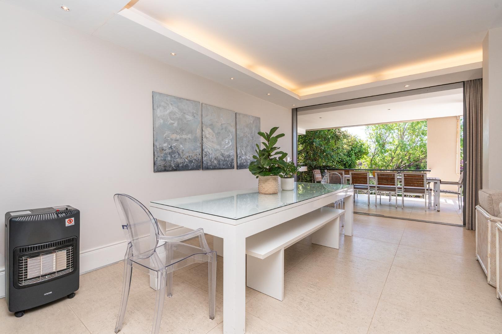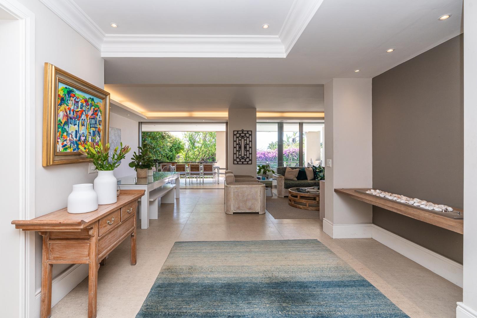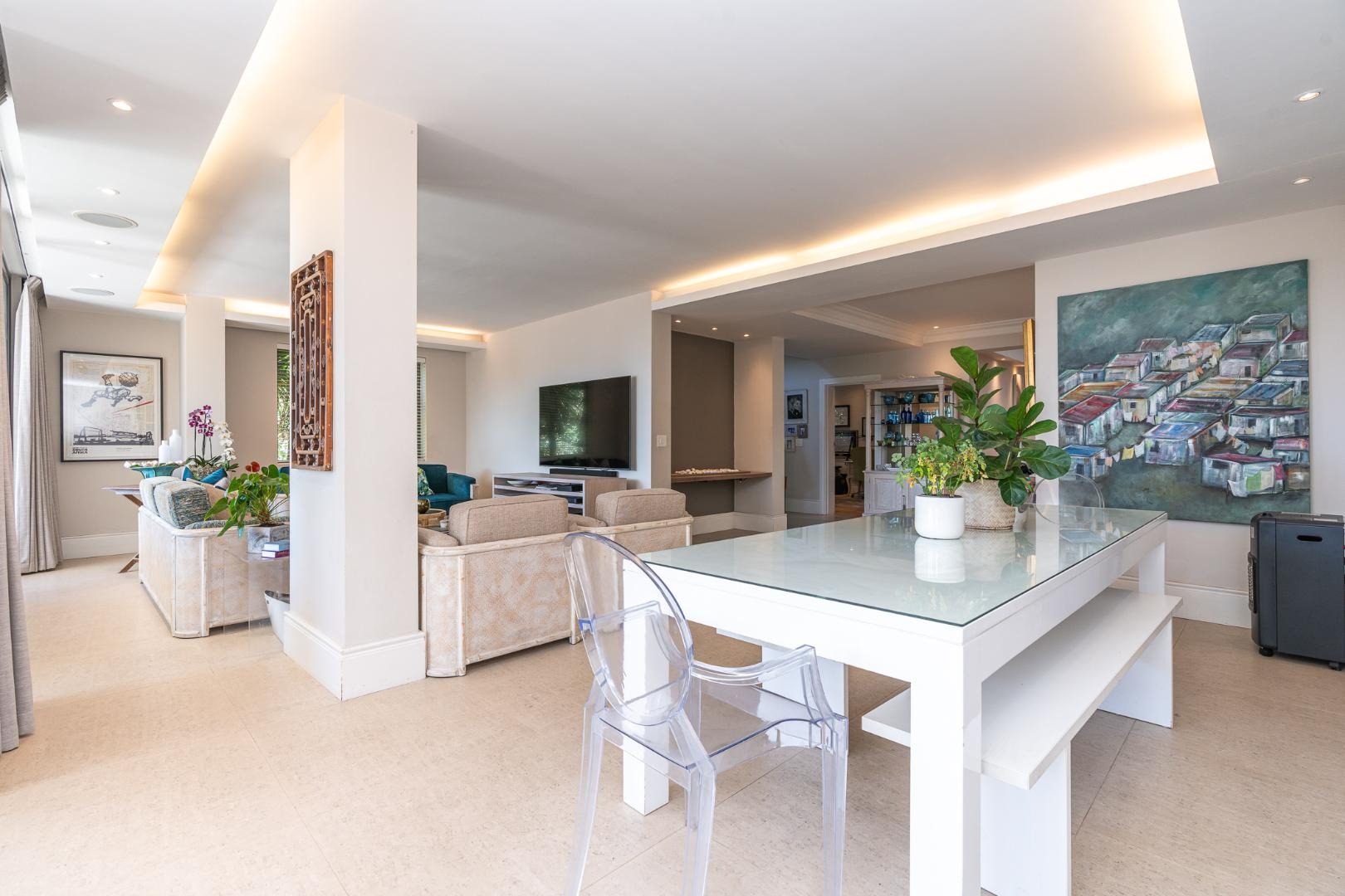 Flowing further, a relaxed TV lounge and informal dining area lead to a sun-drenched veranda with elevated views across the garden, pool and partial sea views — the perfect backdrop for family gatherings and long summer afternoons.