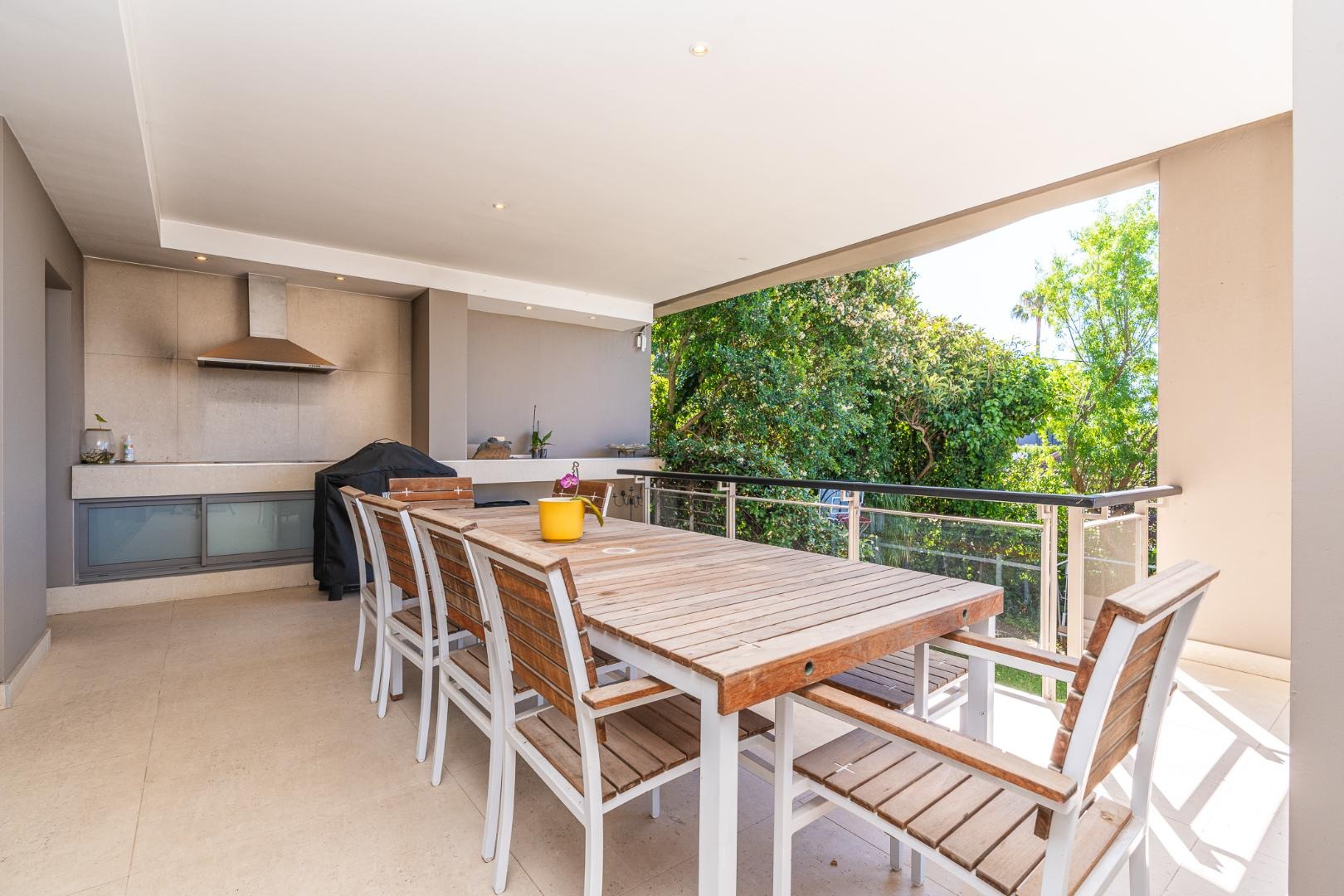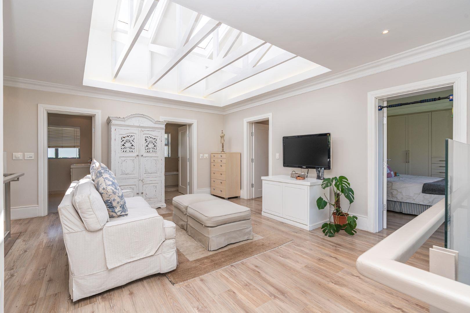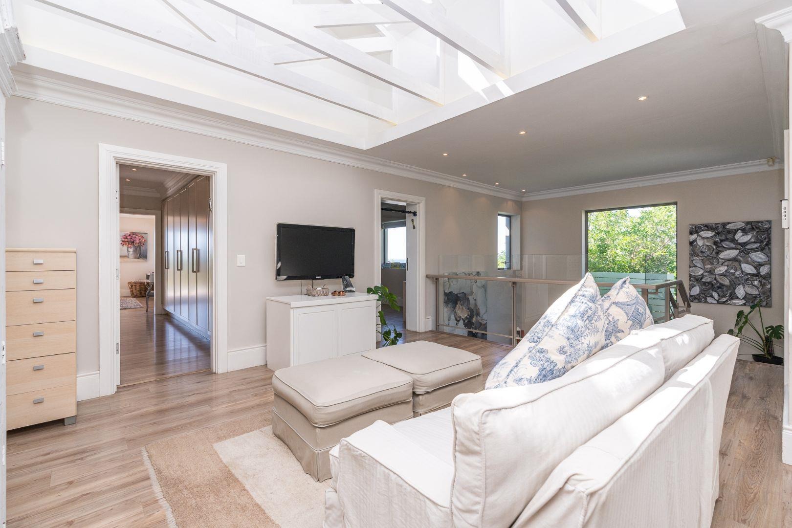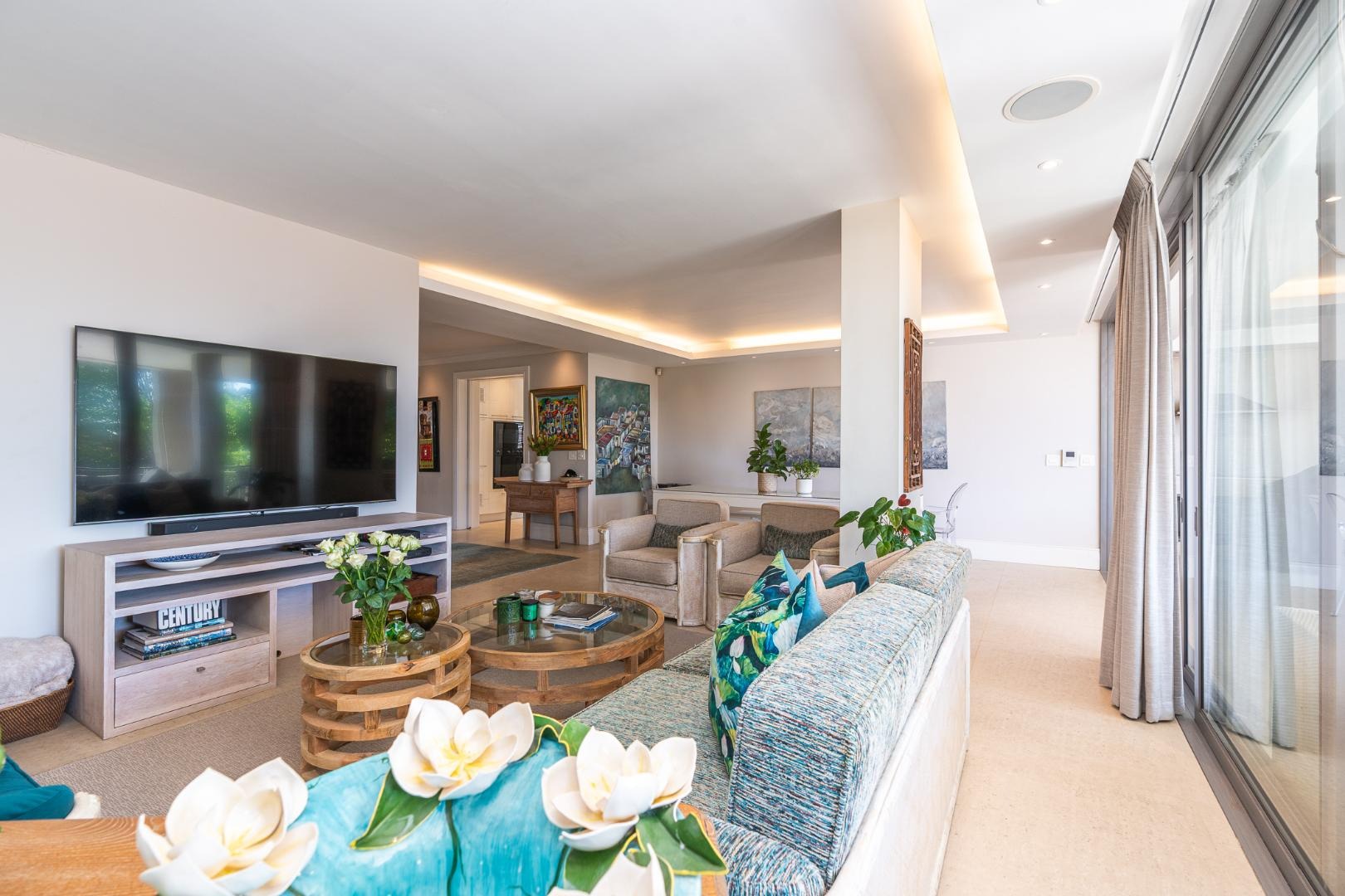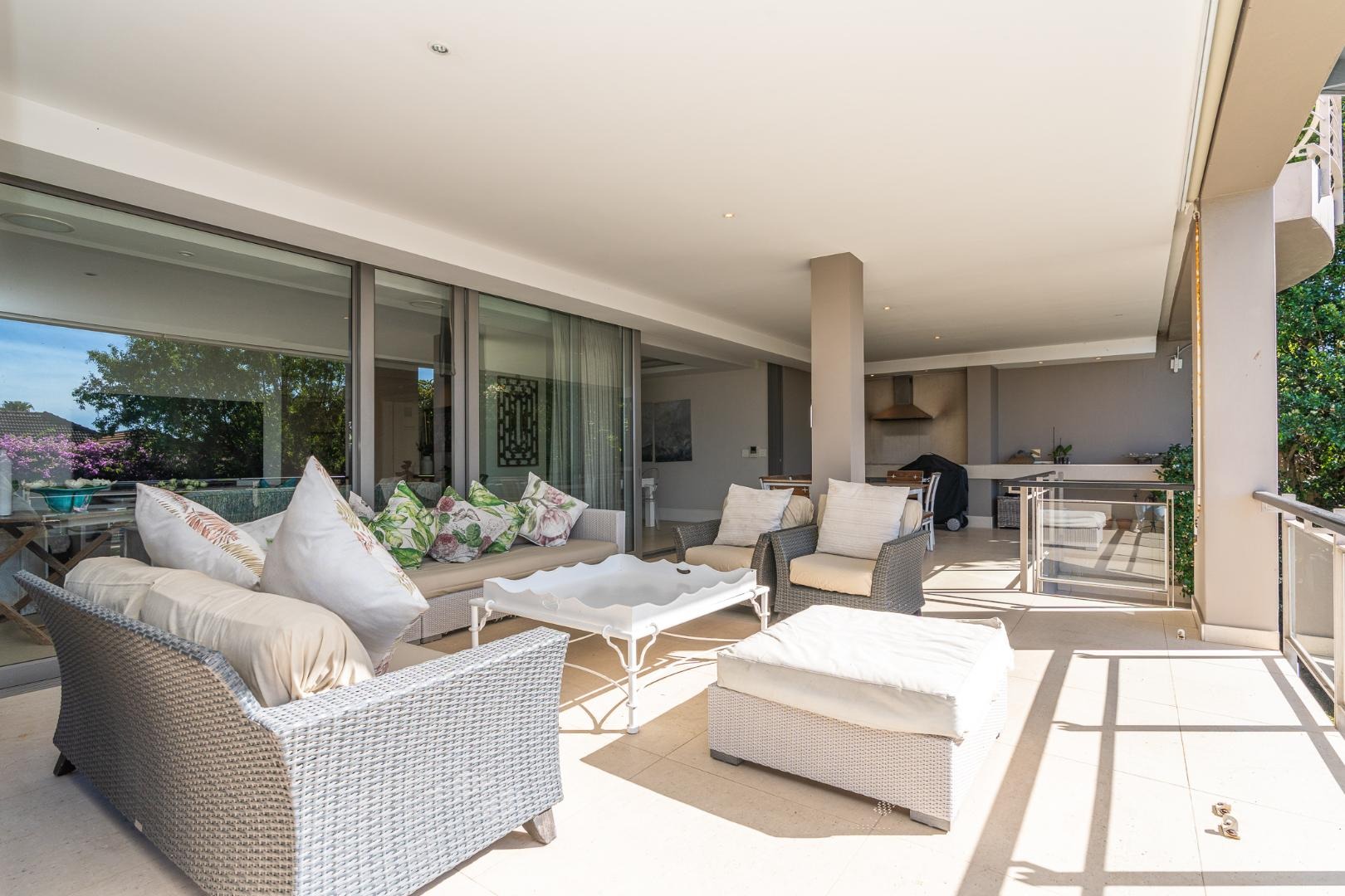 Flowing further, a relaxed TV lounge and informal dining area lead to a sun-drenched veranda with elevated views across the garden, pool and partial sea views — the perfect backdrop for family gatherings and long summer afternoons.