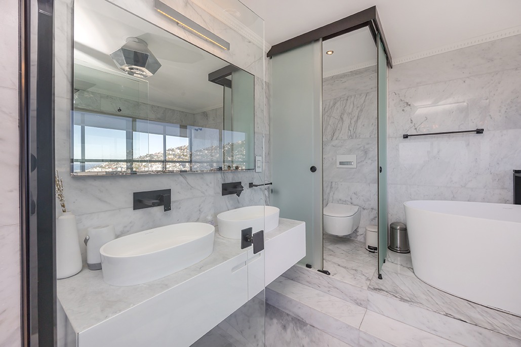 The apartment features two bedrooms and two marble-finished bathrooms. The spacious main suite offers a luxurious en-suite, with a freestanding bath perfectly positioned to capture the sea views. A walk-in dressing room with an integrated study completes this refined home, ideal for professionals or remote working.