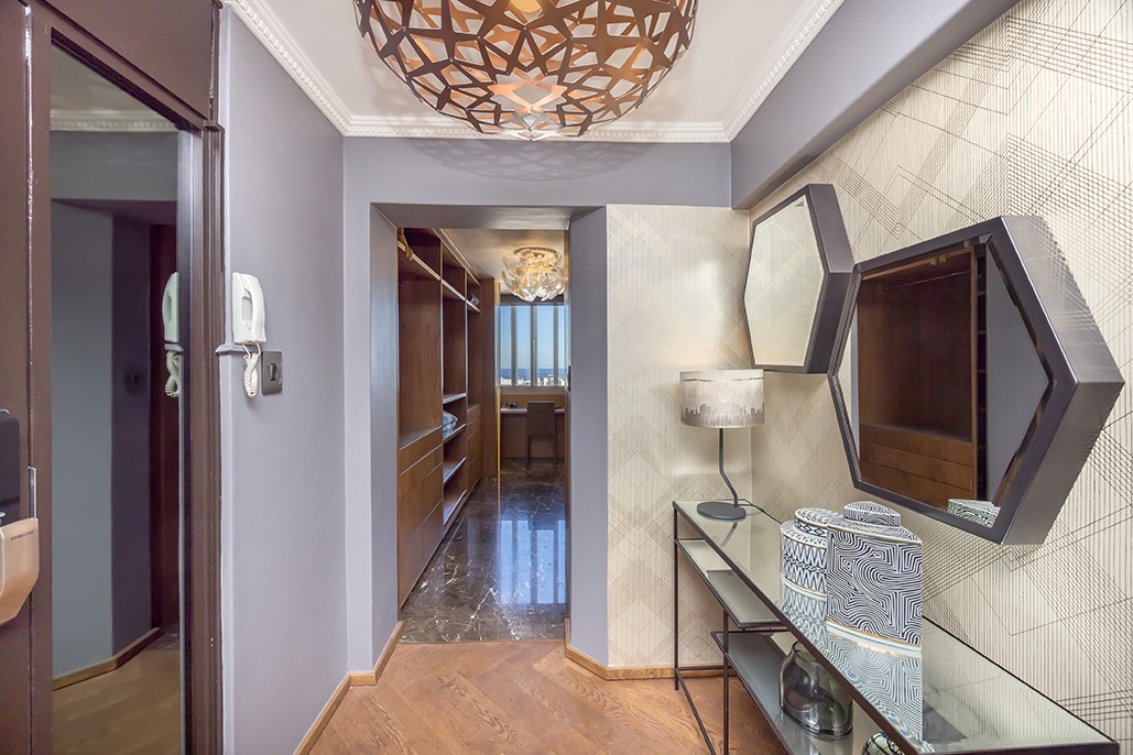 The apartment features two bedrooms and two marble-finished bathrooms. The spacious main suite offers a luxurious en-suite, with a freestanding bath perfectly positioned to capture the sea views. A walk-in dressing room with an integrated study completes this refined home, ideal for professionals or remote working.