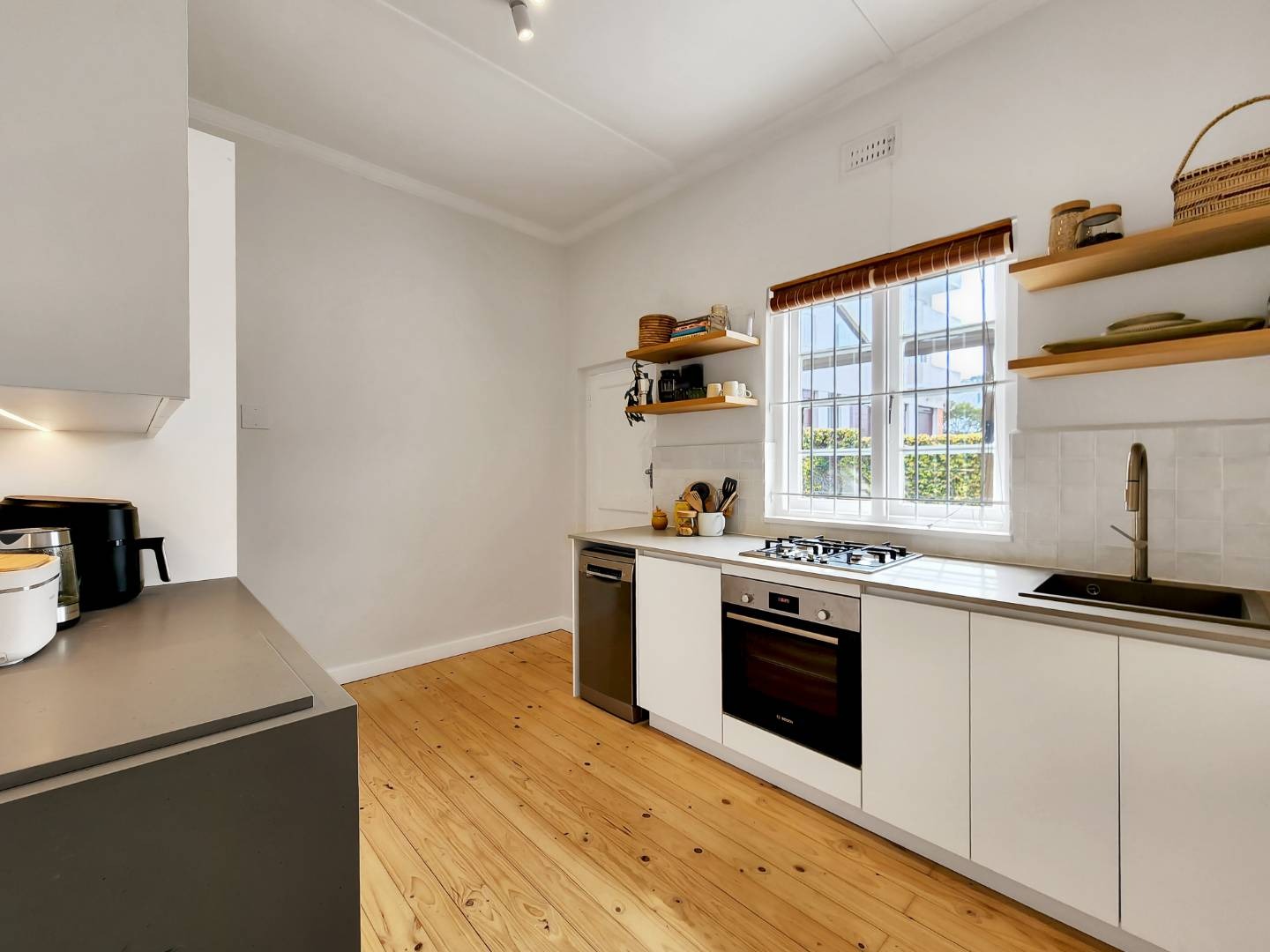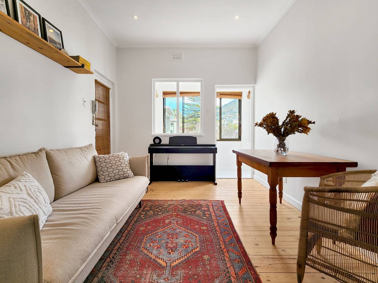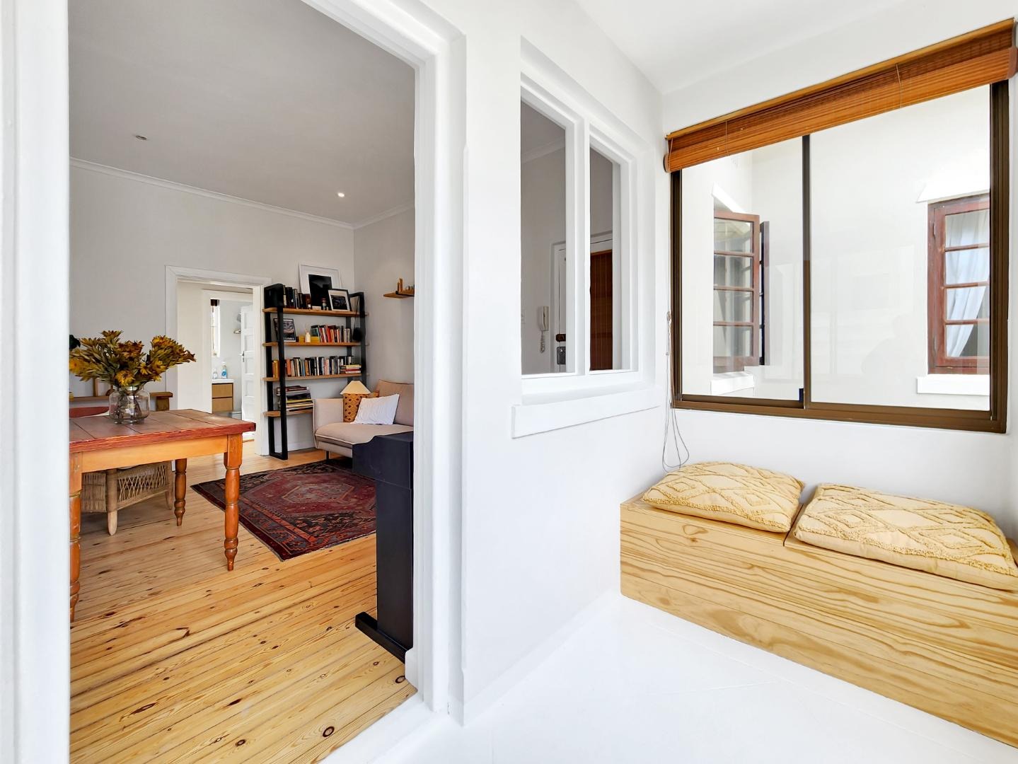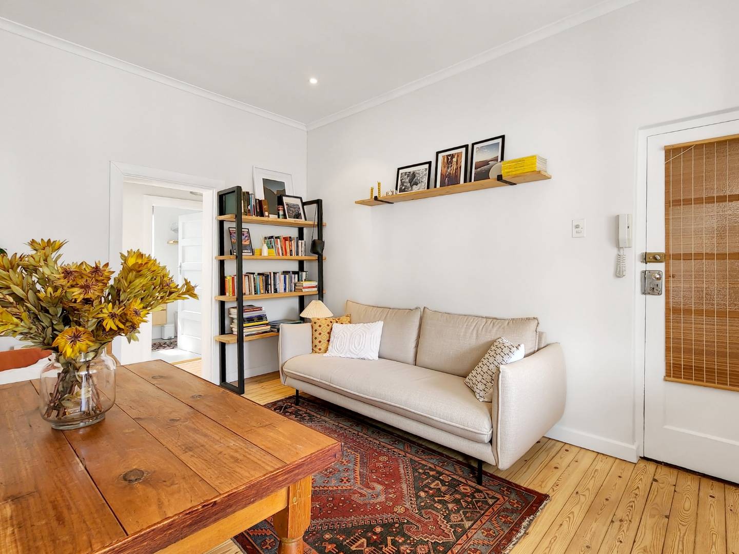 Step into a spacious living room with access to an enclosed balcony, offering picturesque views of the lush central garden. The apartment features beautiful Oregon pine floors throughout, adding a touch of warmth and elegance.