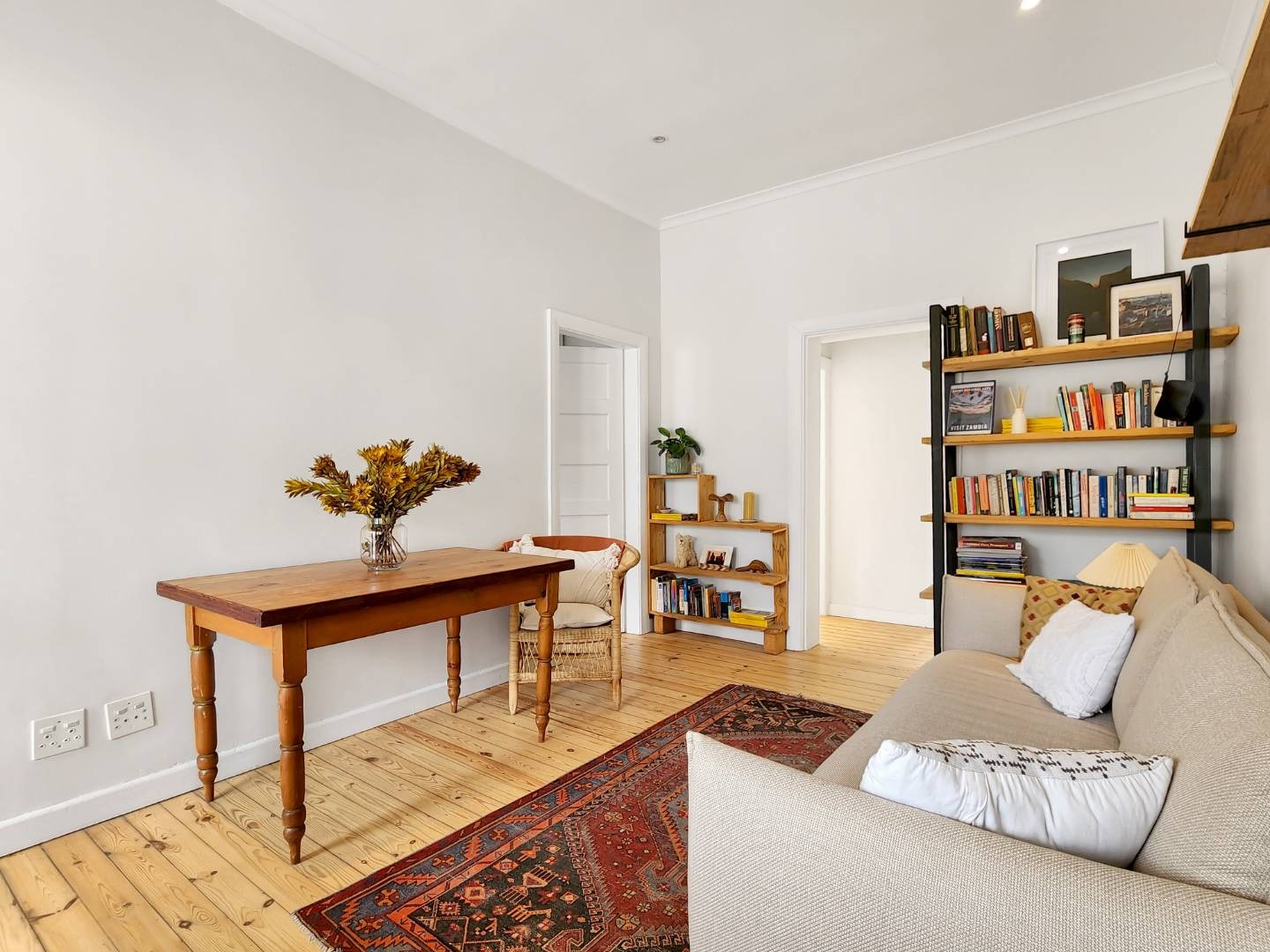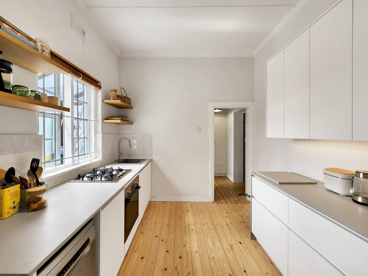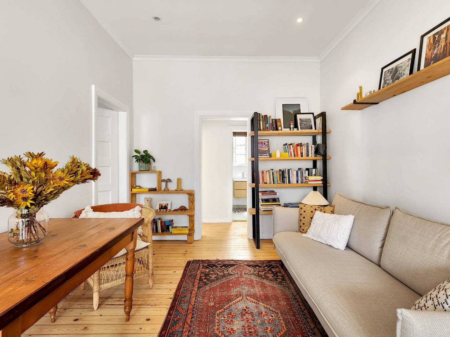 Step into a spacious living room with access to an enclosed balcony, offering picturesque views of the lush central garden. The apartment features beautiful Oregon pine floors throughout, adding a touch of warmth and elegance.