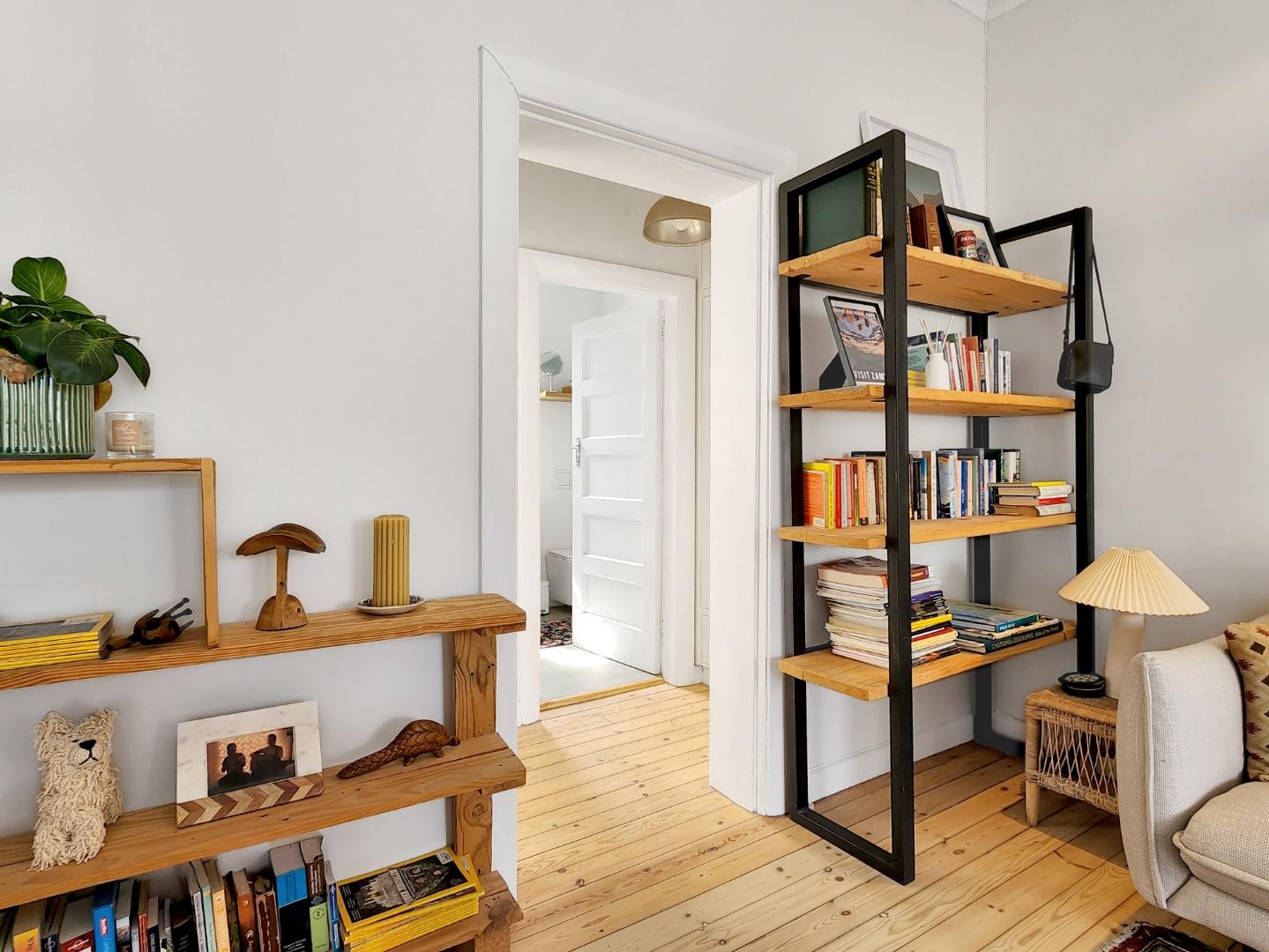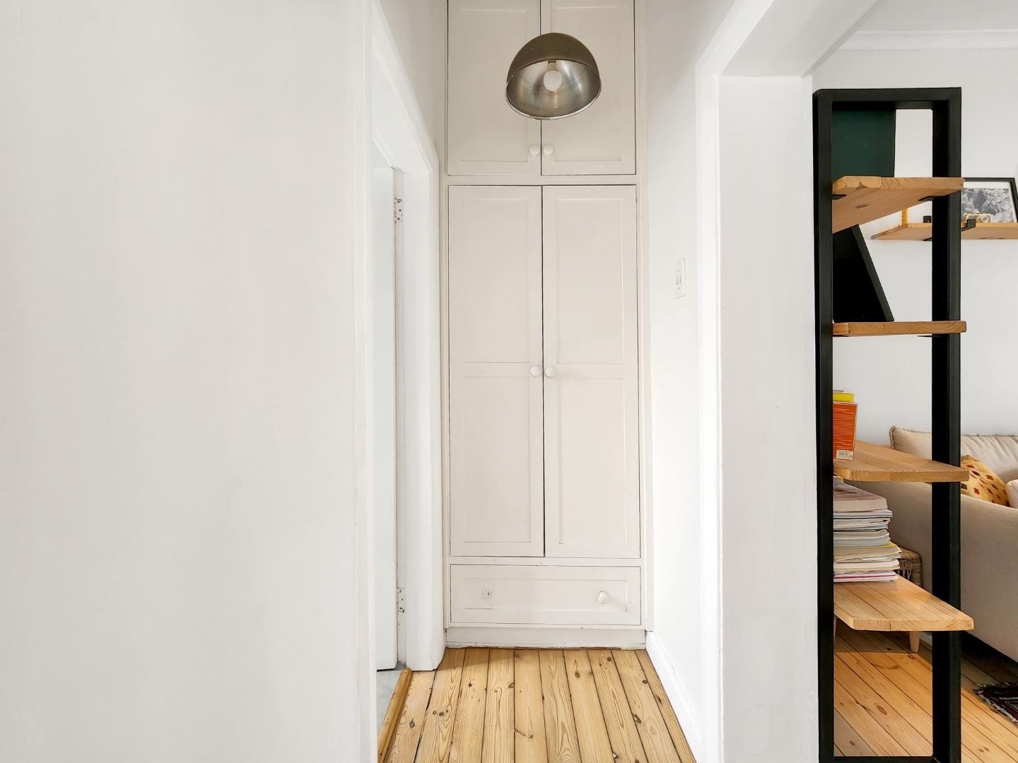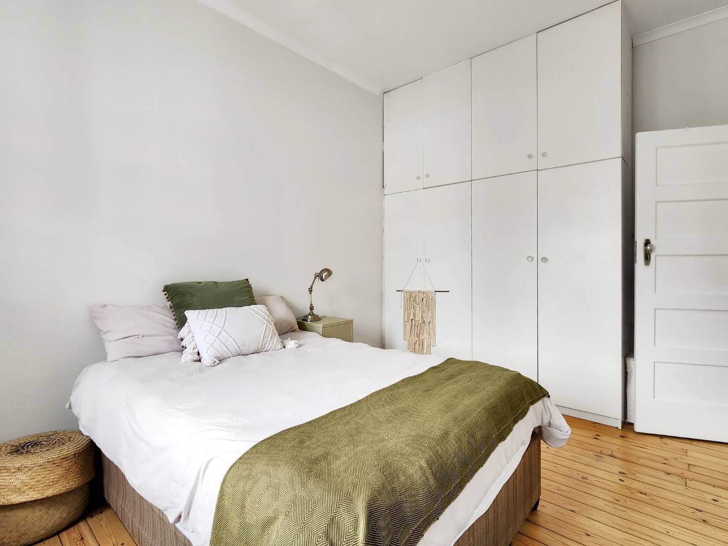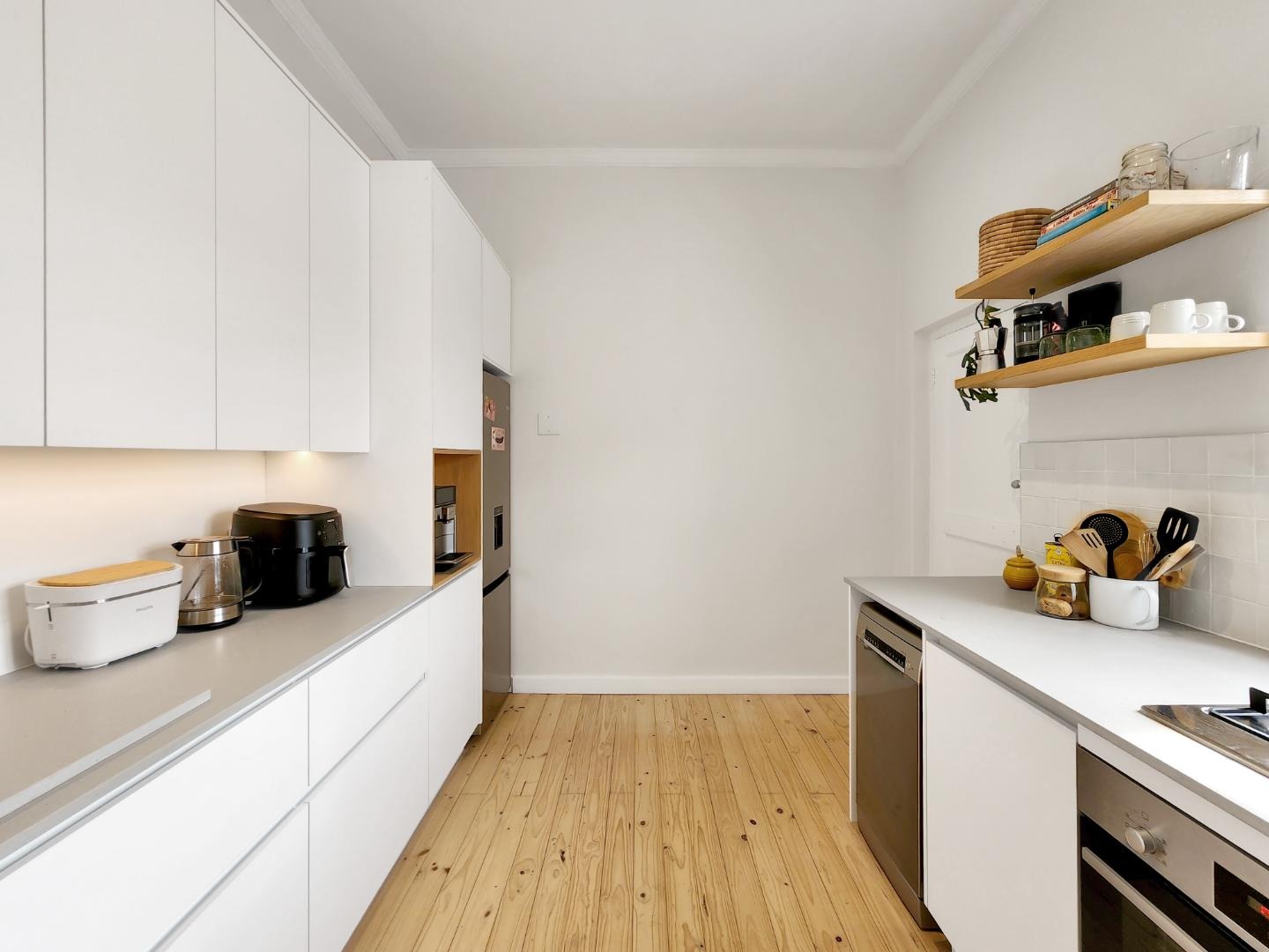 Step into a spacious living room with access to an enclosed balcony, offering picturesque views of the lush central garden. The apartment features beautiful Oregon pine floors throughout, adding a touch of warmth and elegance.
