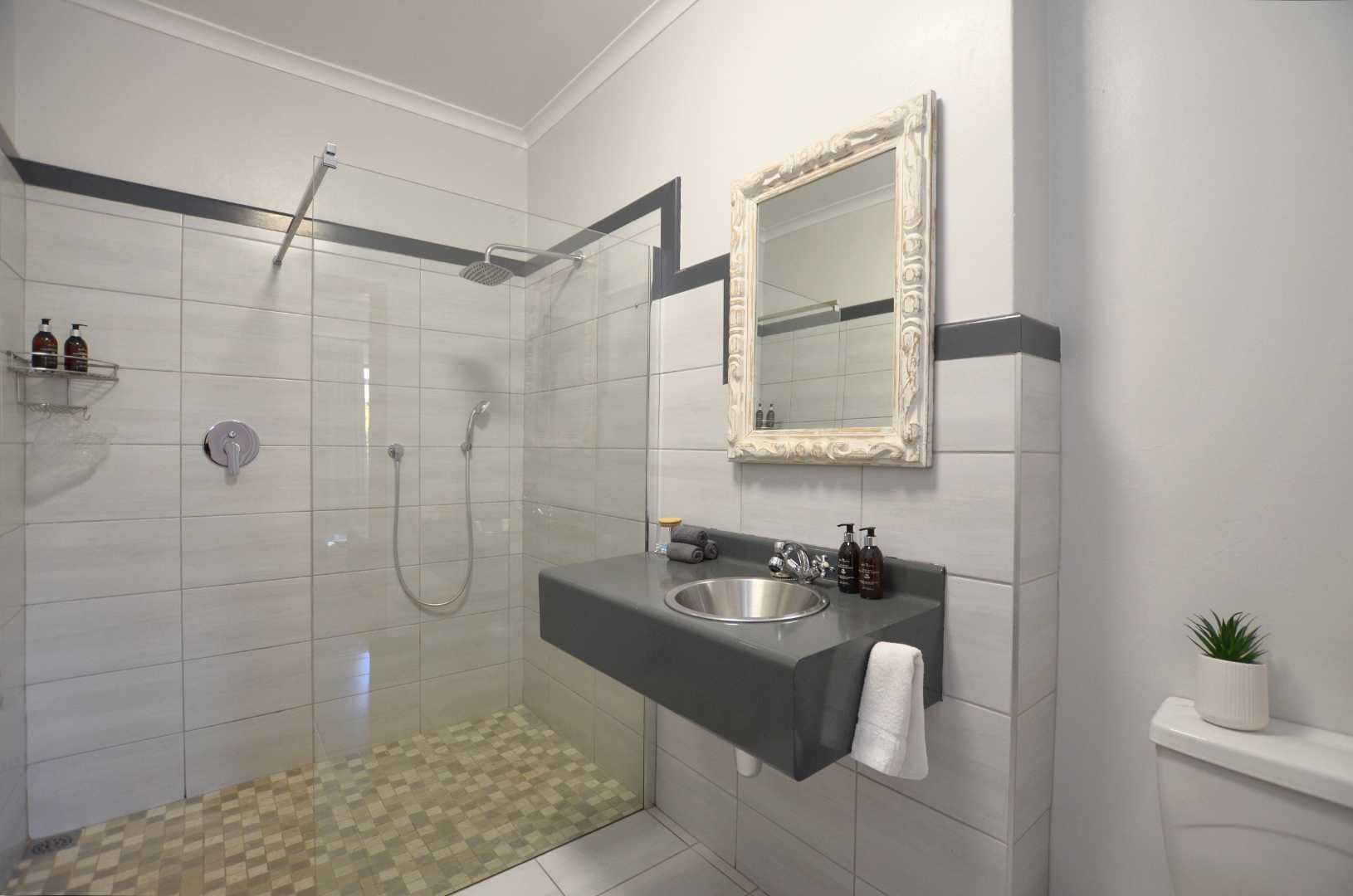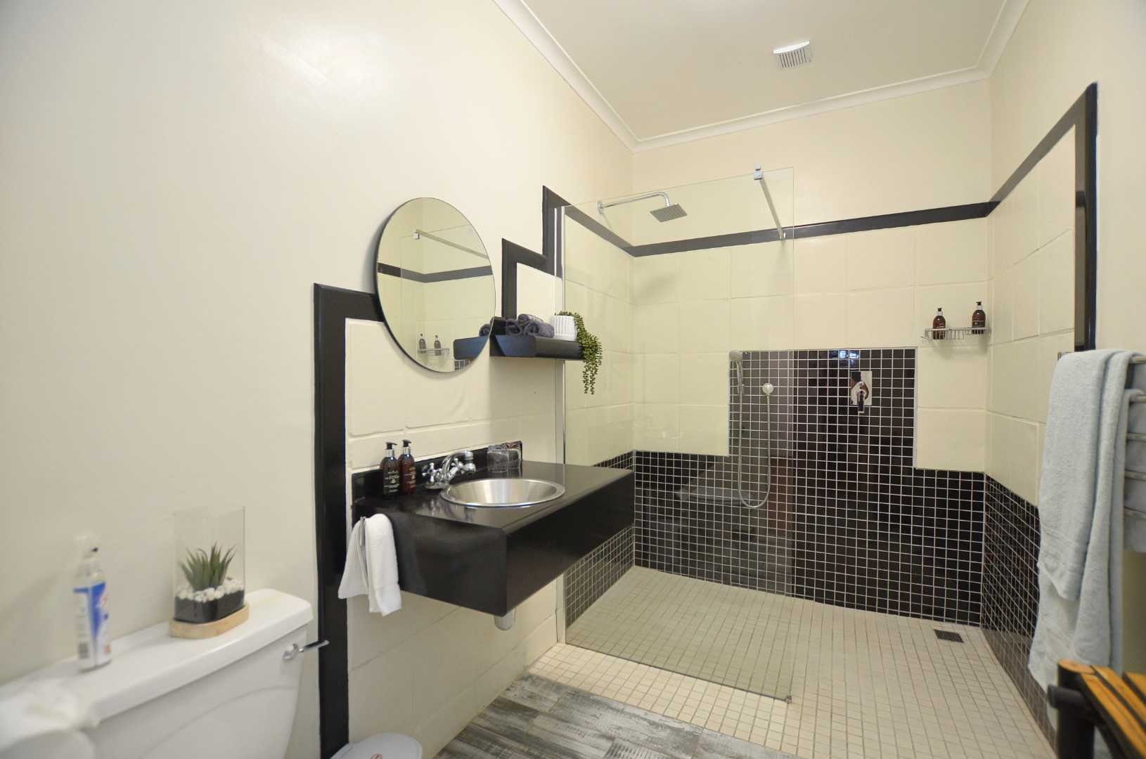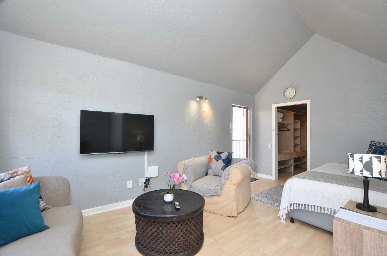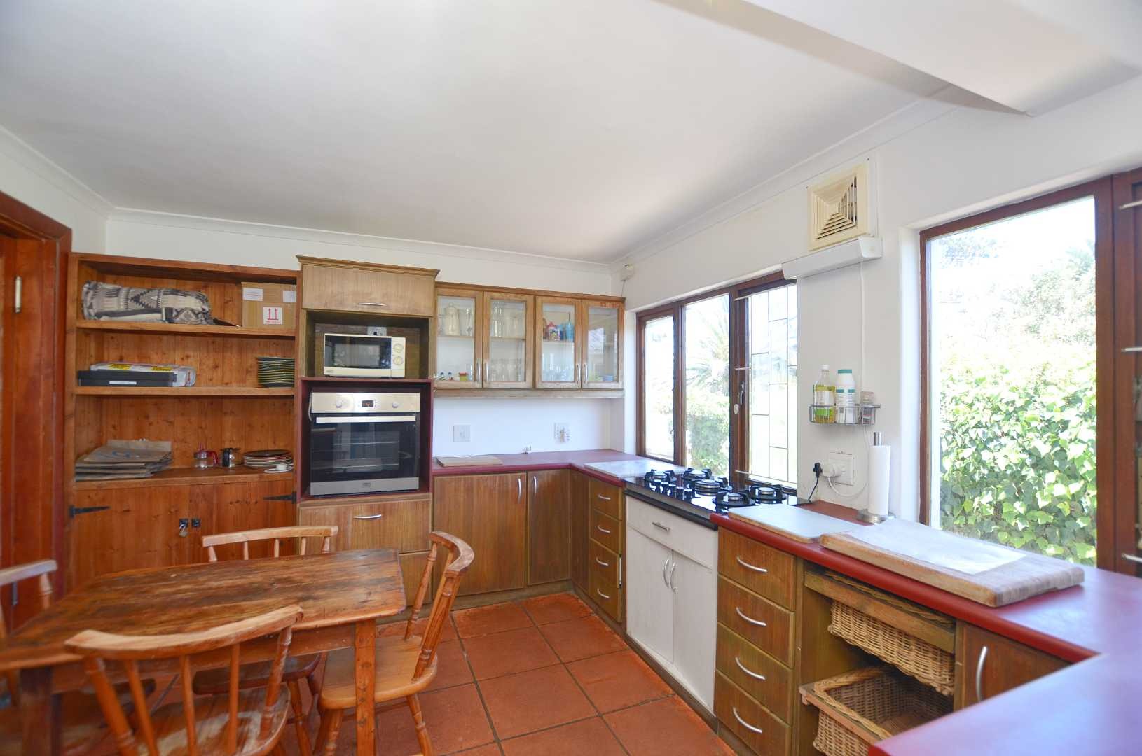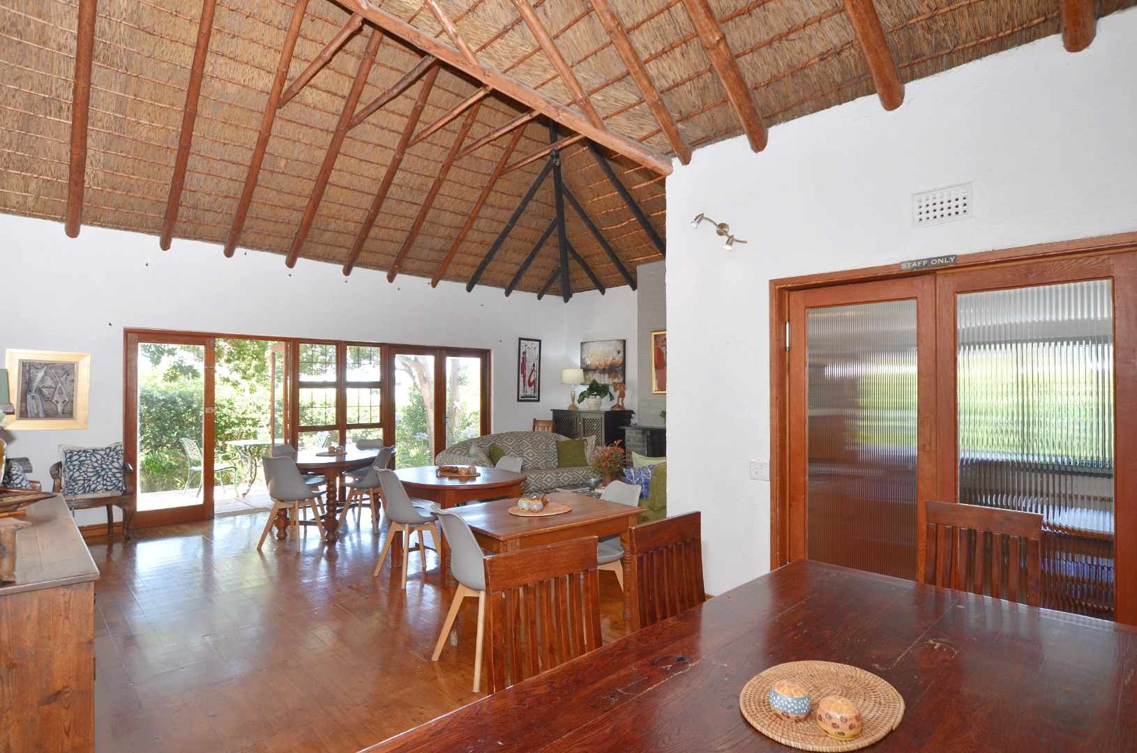 Dine indoors or step out onto the sunny patio off the lounge, where you can enjoy meals overlooking the picturesque garden. The outdoor space is enhanced by a lapa and a generously sized pool, perfect for cooling off on lazy summer days. Mature trees provide privacy and tranquility, making this section of the property an ideal sanctuary for relaxation.