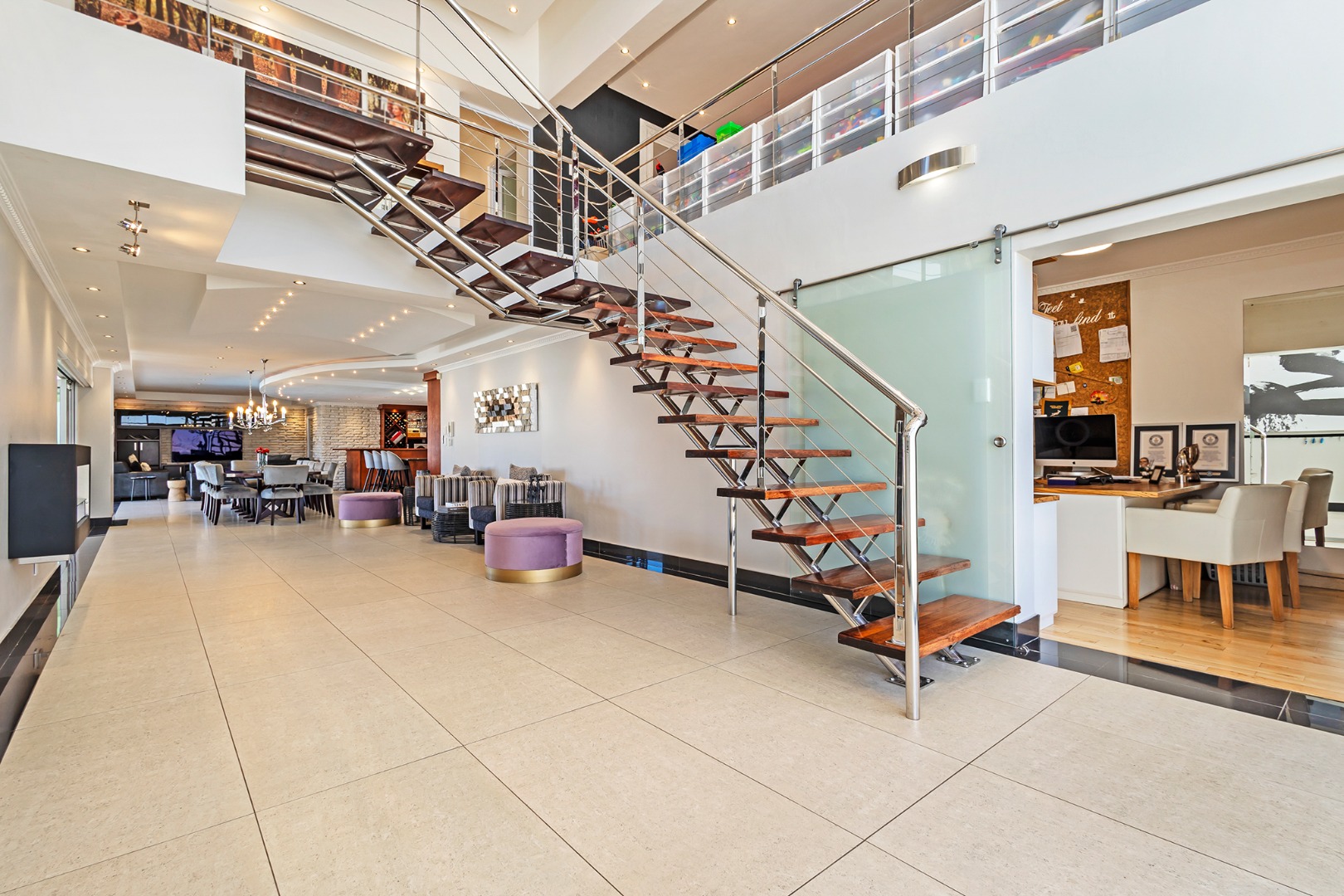 The home offers four beautifully proportioned bedroom suites, four located upstairs, each capturing breathtaking views across Cape Town, while a luxurious guest suite on the ground level enjoys its own private garden entrance. A dedicated study provides the ideal work-from-home environment, balancing productivity with tranquillity. Upstairs, an expansive entertainment lounge with a fitted bar, indoor braai, and view deck creates the perfect setting for both relaxed family evenings and vibrant gatherings, all set against the iconic backdrop of Table Mountain.