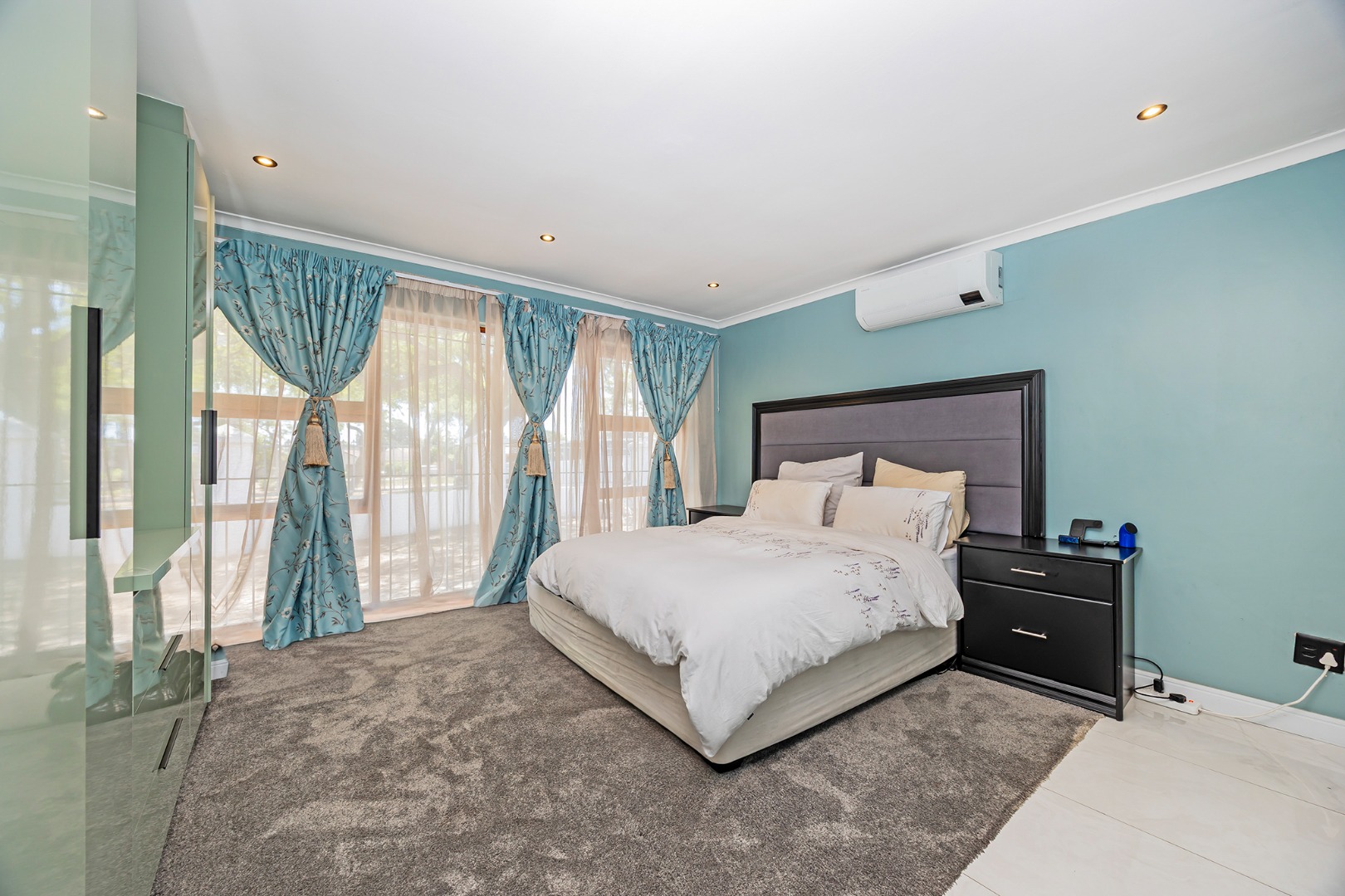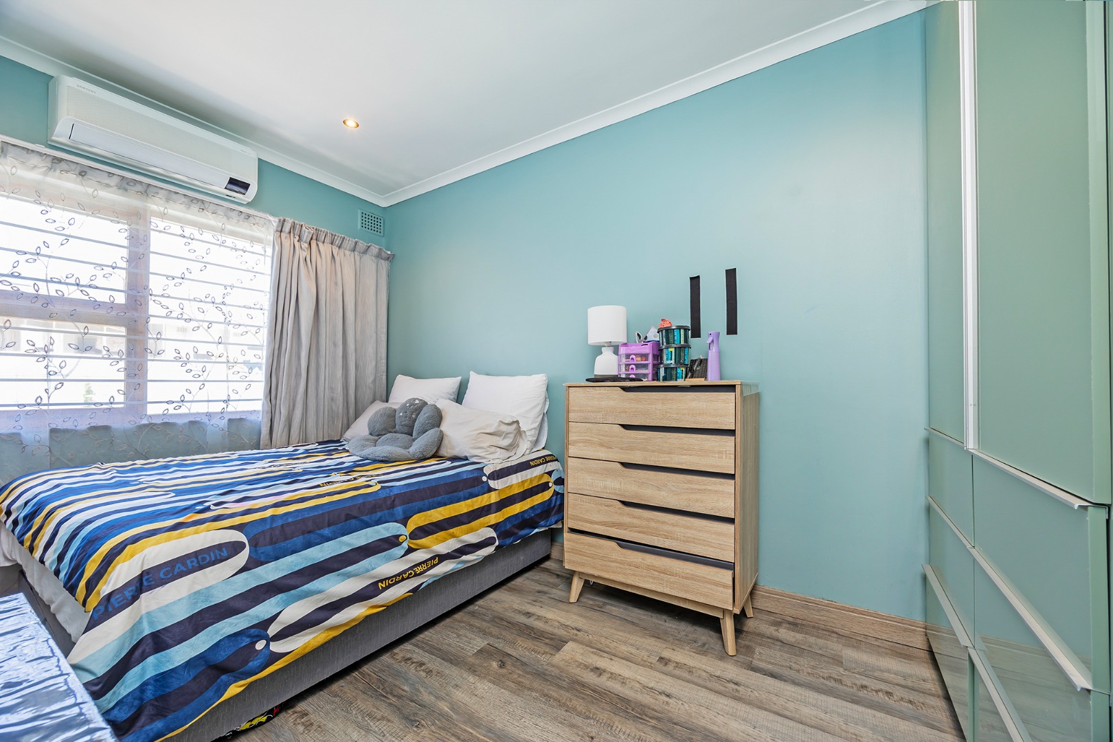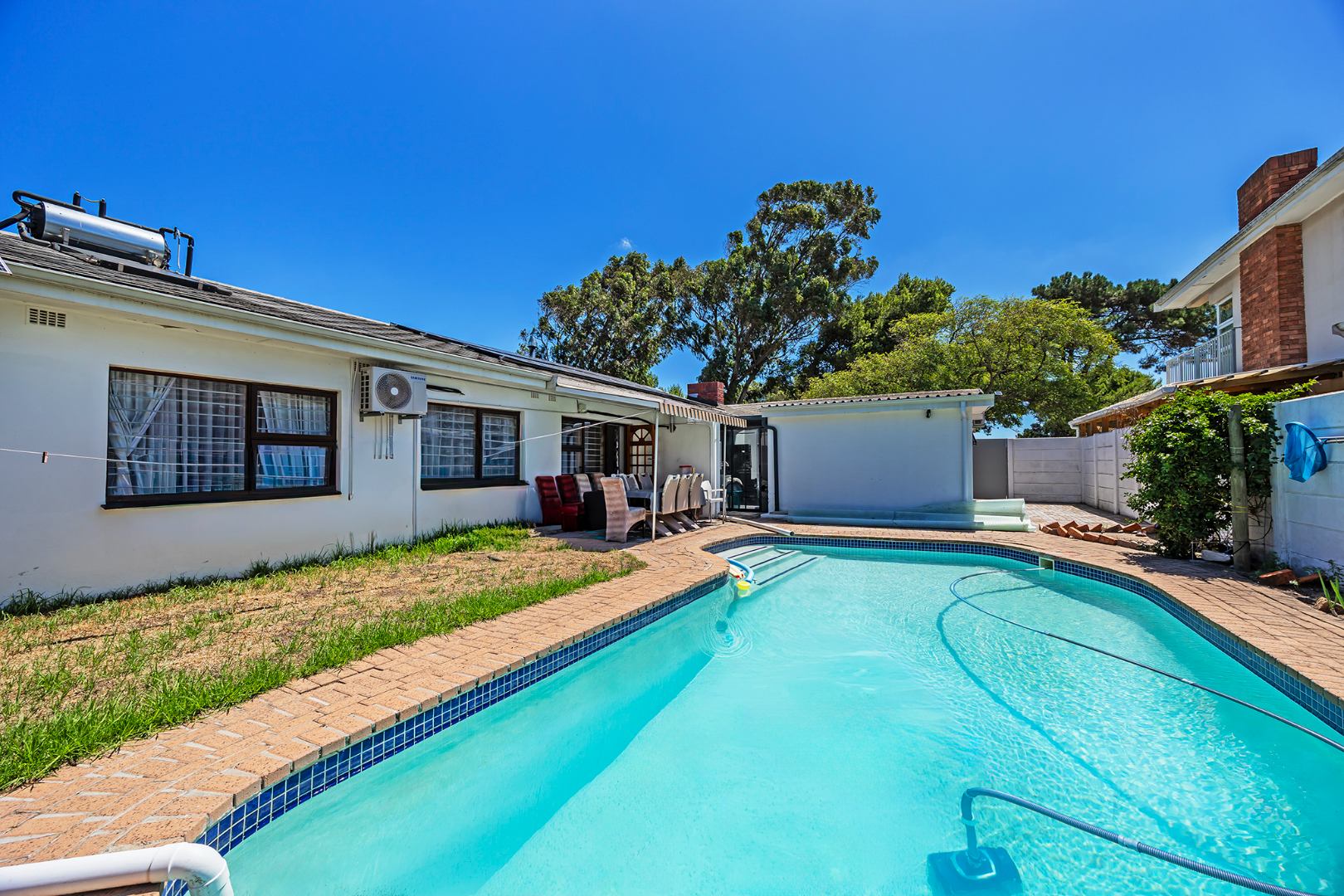 The remainder of the home offers four well-sized bedrooms, all finished with vinyl flooring and fitted with burglar bars for added security. The bathrooms are tastefully renovated with clean, modern finishes, while the main suite also enjoys the added comfort of air-conditioning and a private dressing room.