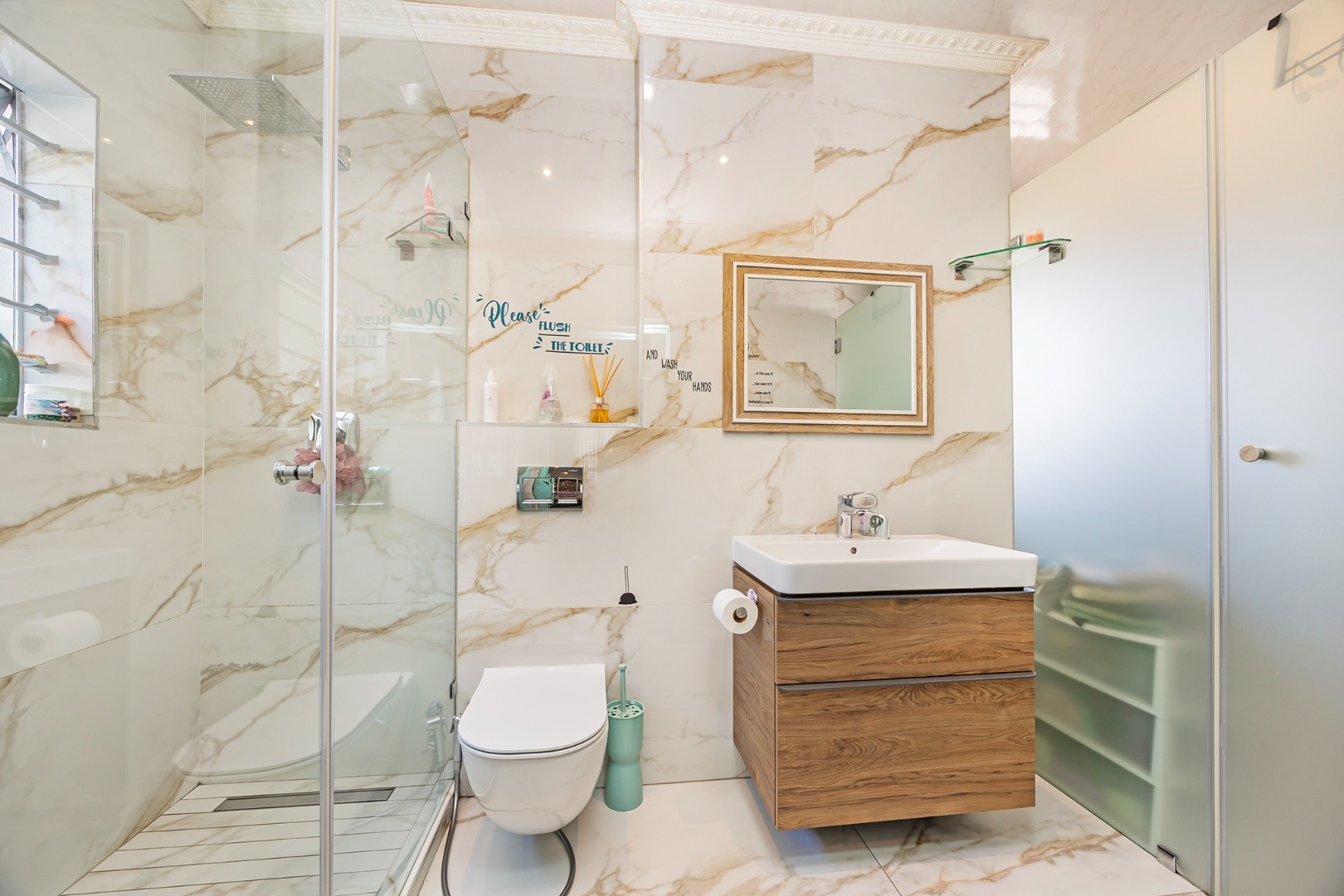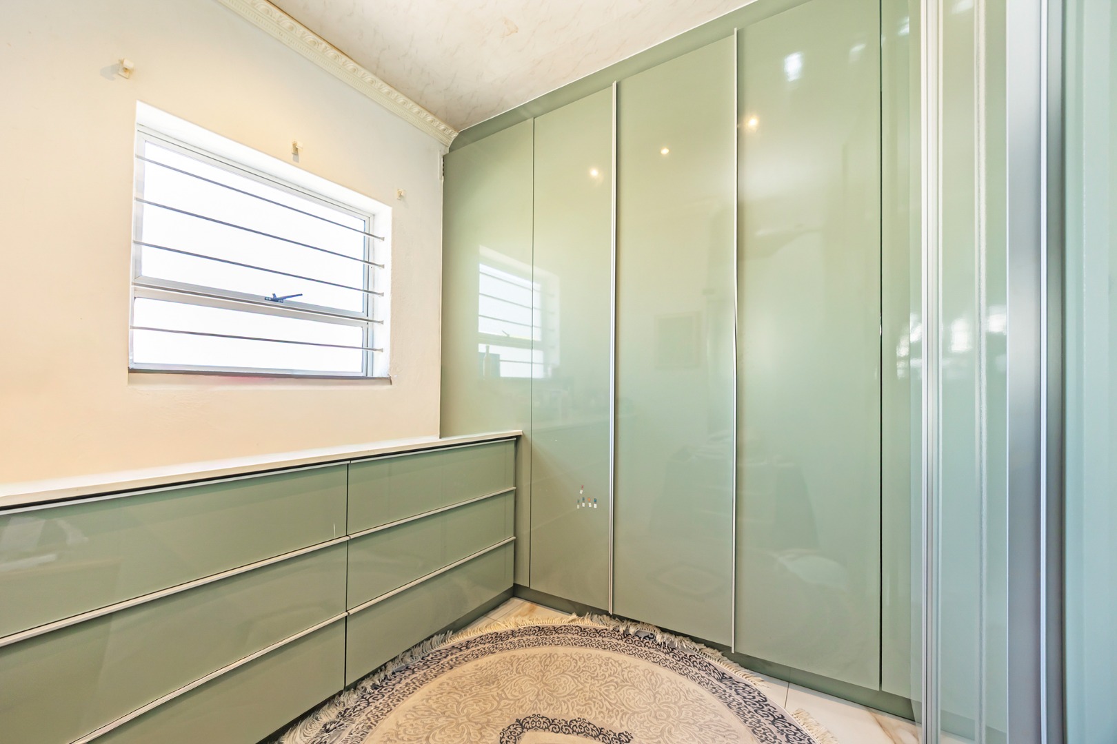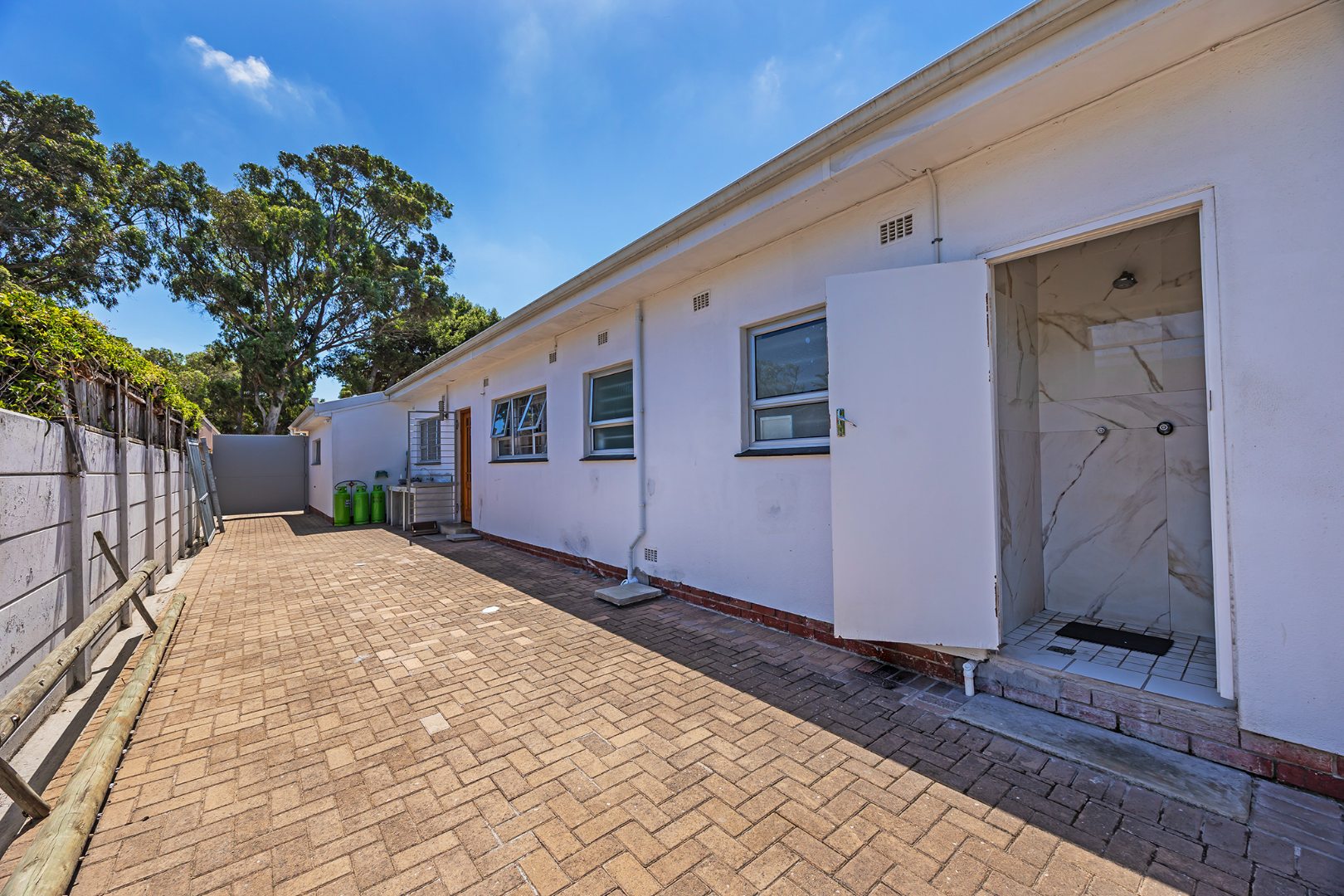 The remainder of the home offers four well-sized bedrooms, all finished with vinyl flooring and fitted with burglar bars for added security. The bathrooms are tastefully renovated with clean, modern finishes, while the main suite also enjoys the added comfort of air-conditioning and a private dressing room.
