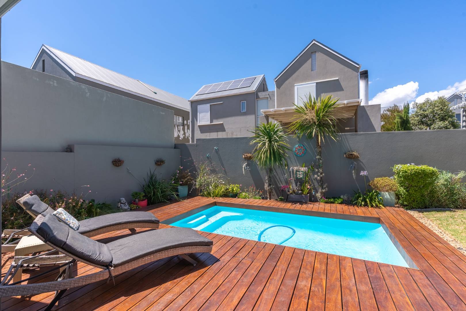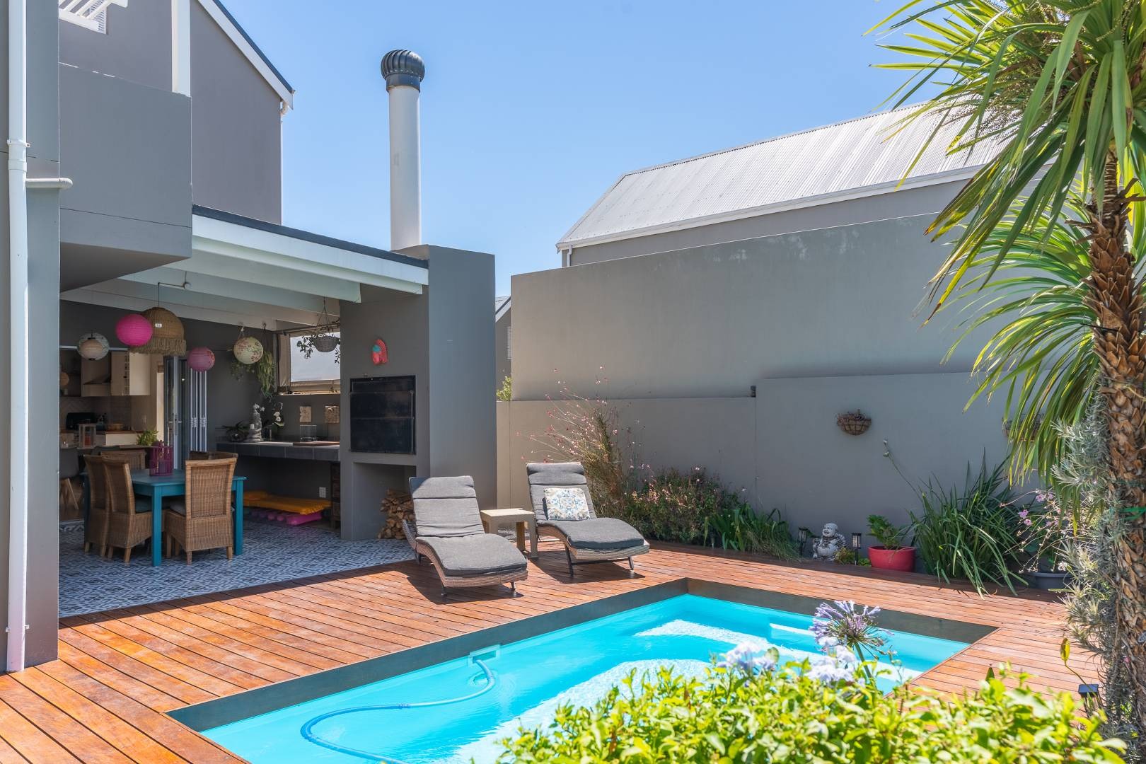 Enjoy an enclosed braai area with a built-in braai for year-round entertaining. The property also features a sparkling pool with a wooden deck and a generously sized garden area for outdoor enjoyment.
