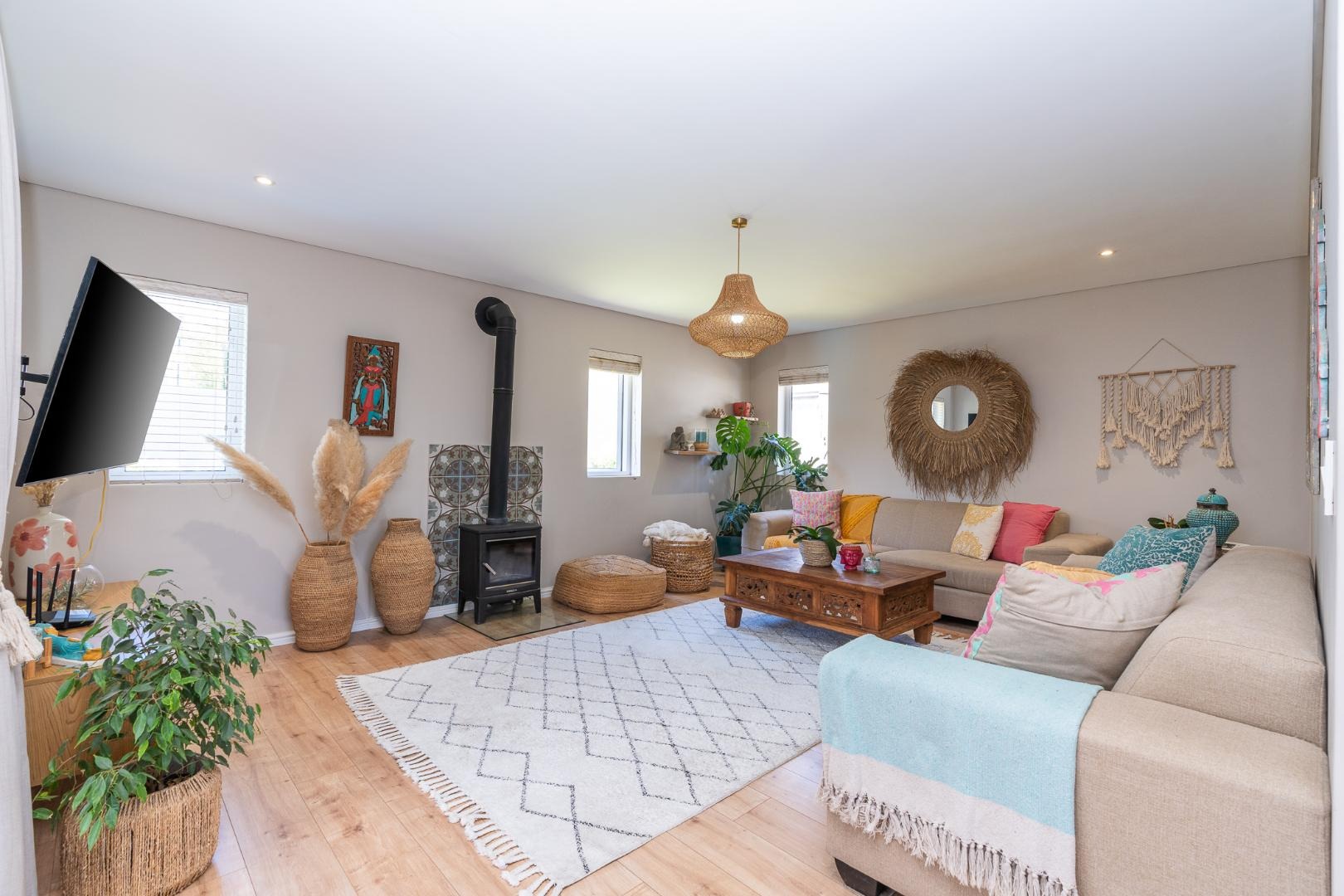 The dining and lounge areas are enhanced by stack doors that open to reveal a spectacular entertainment space and pool area, complete with a Nordflam cast iron stove that adds warmth and ambiance.