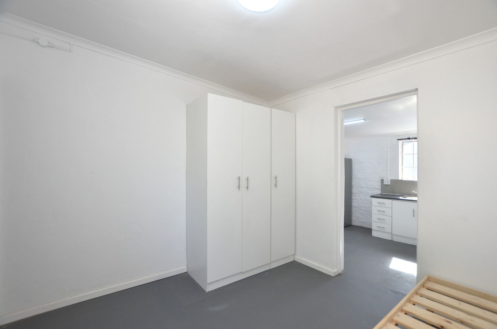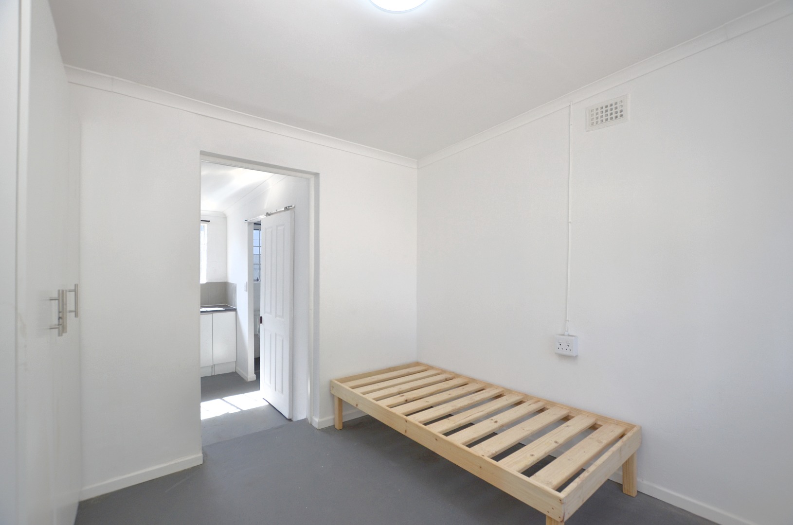 Step into a welcoming open-plan living space, complete with a fridge and a wooden base for a single bed, making moving in a breeze.