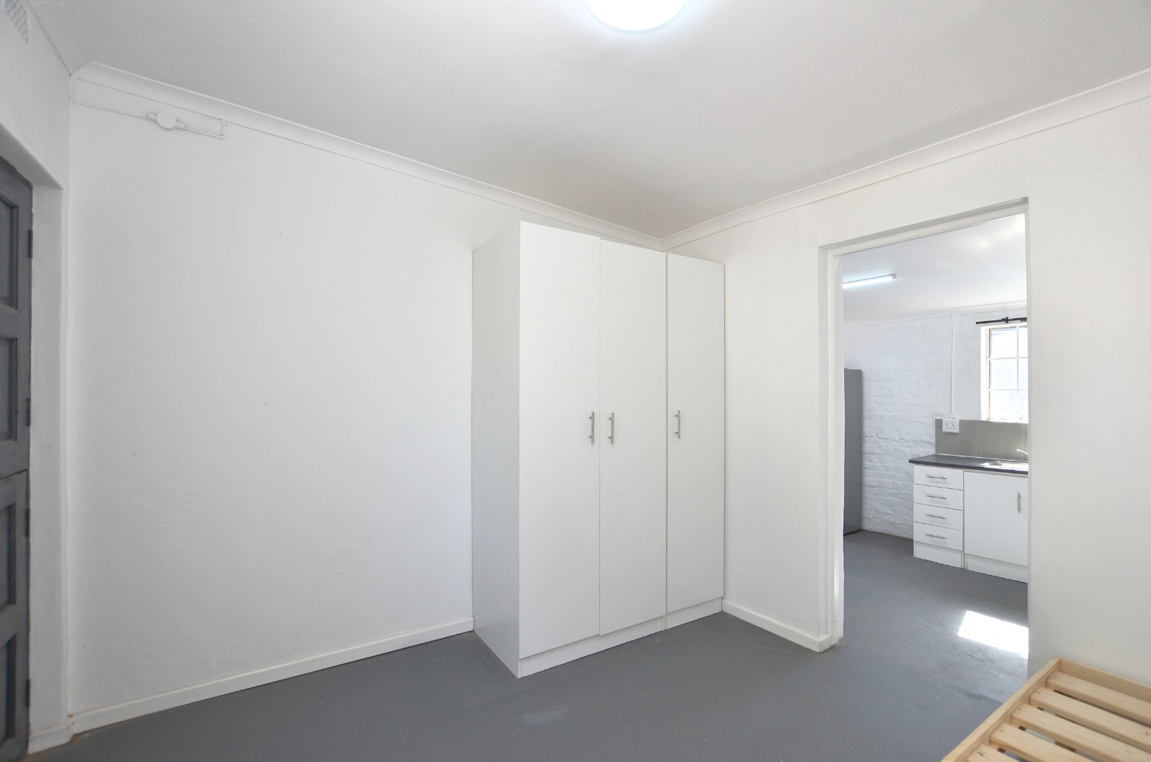 Step into a welcoming open-plan living space, complete with a fridge and a wooden base for a single bed, making moving in a breeze.