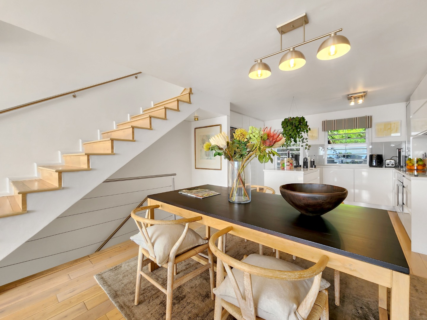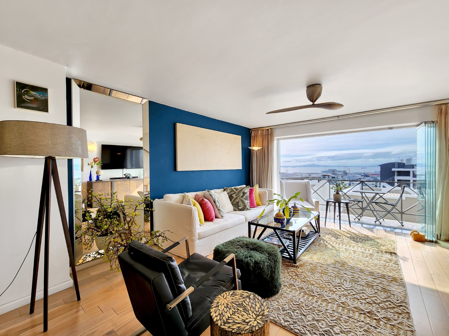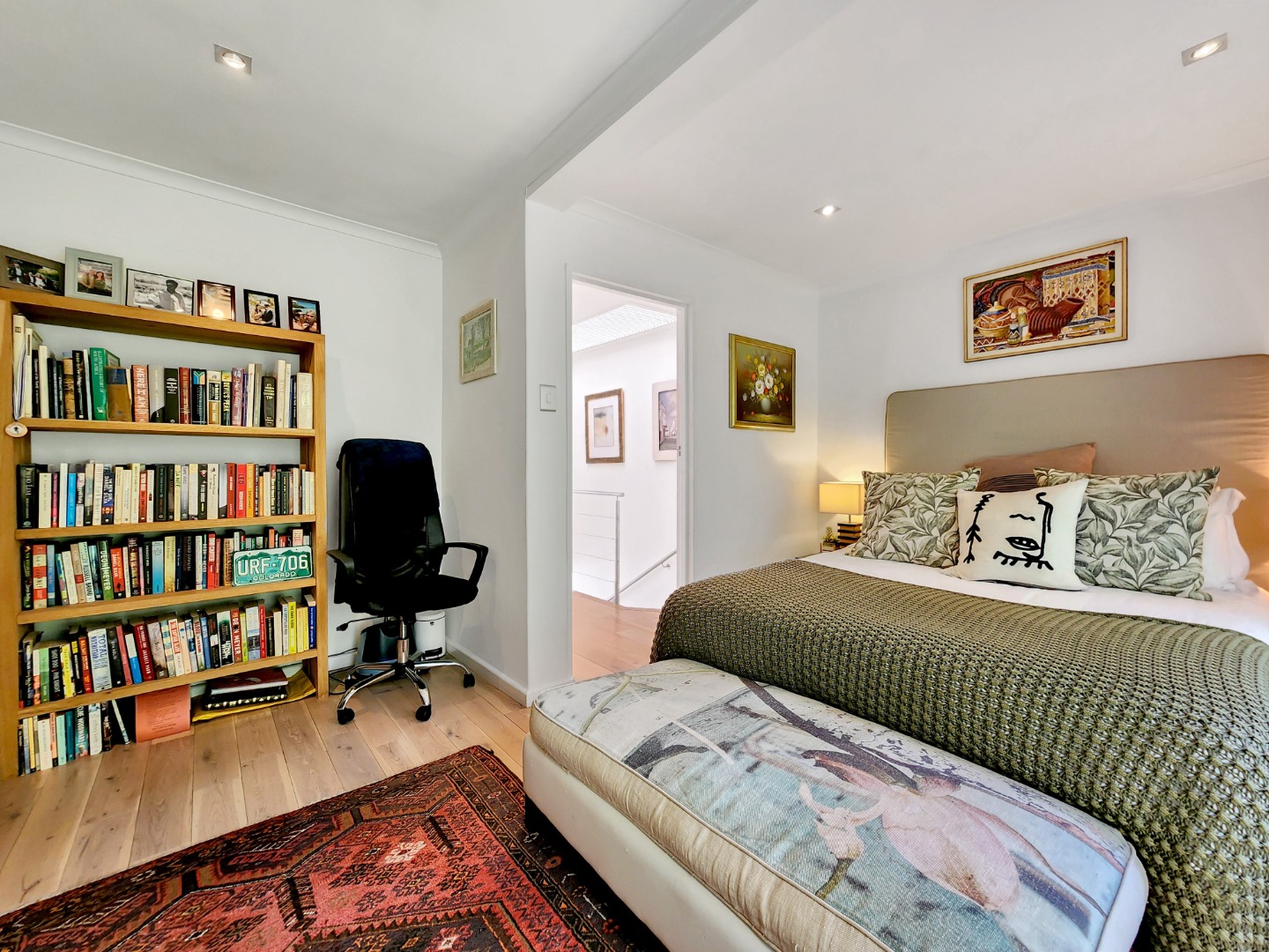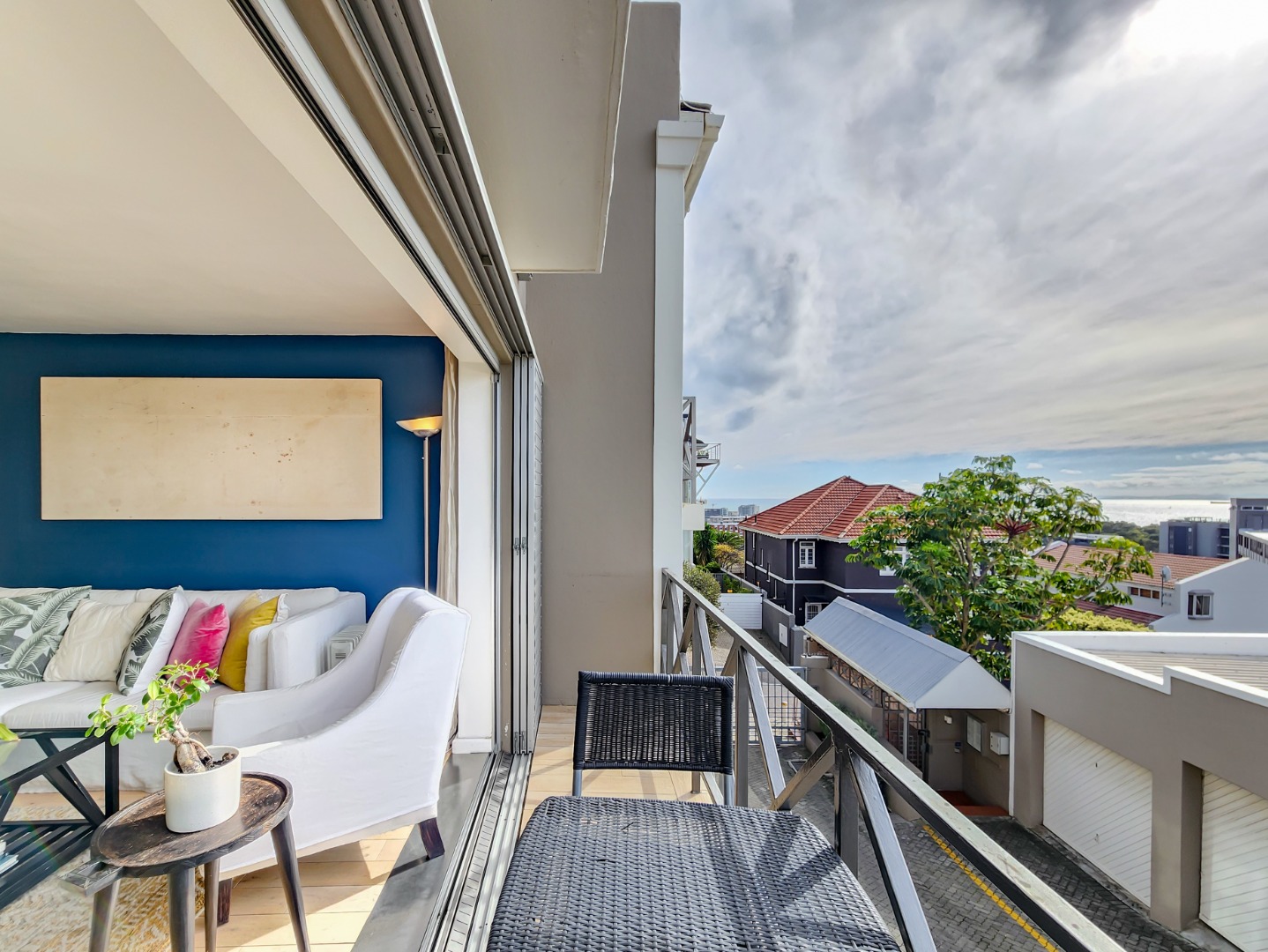 A beautifully designed staircase leads you down to the middle level, where a large balcony awaits, offering mesmerizing views of the ocean, mountains, and cityscape. This level is home to an open-plan lounge, dining area, and kitchen—perfect for entertaining and relaxation. At the rear, a cozy space awaits your barbequing (braai) adventures. The kitchen is thoughtfully equipped with a dishwasher and washing machine for your convenience.