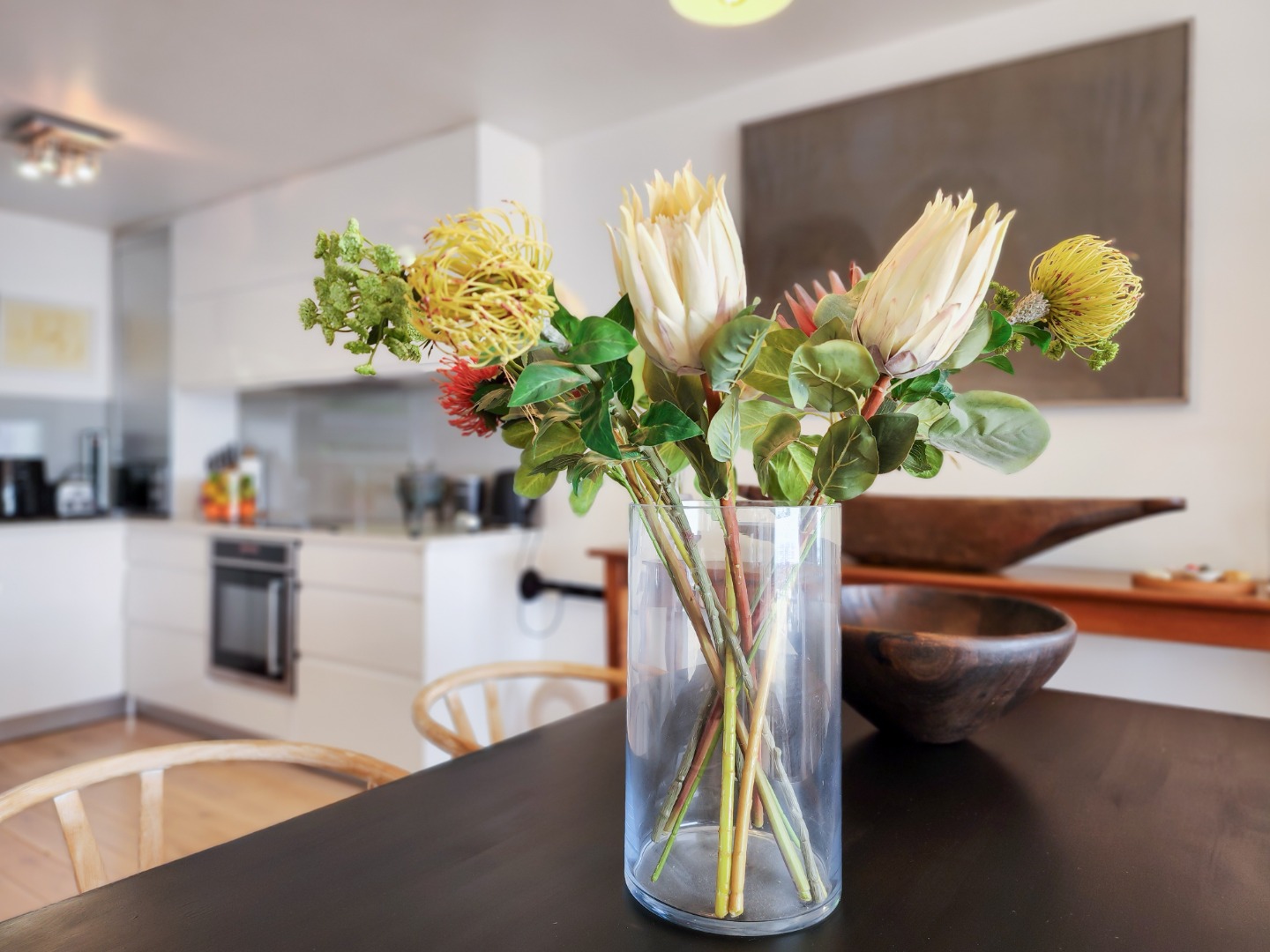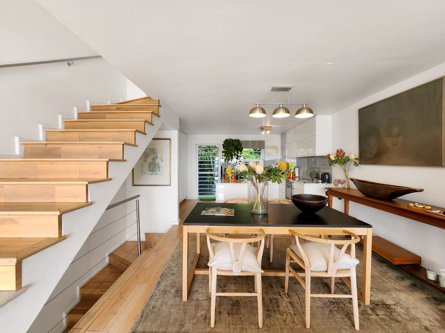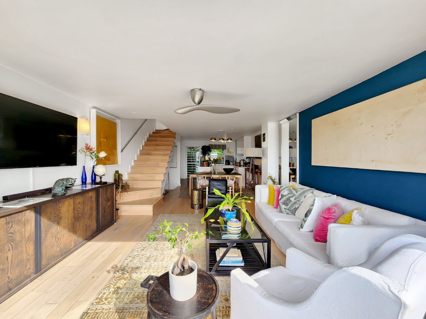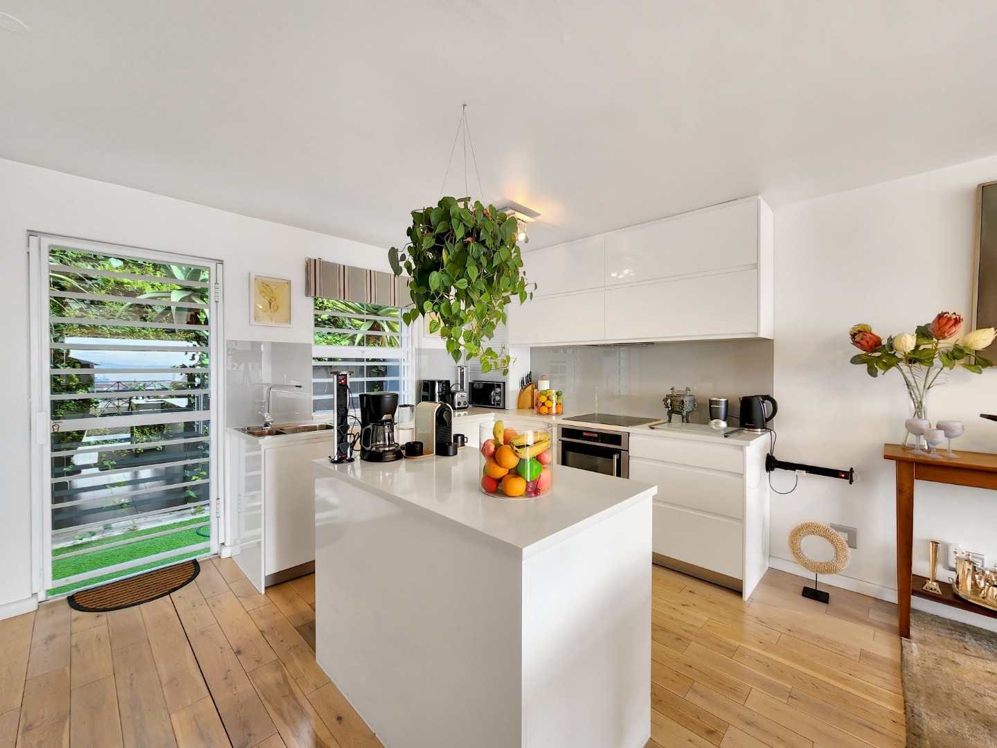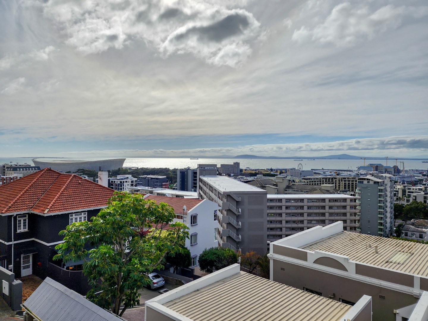 A beautifully designed staircase leads you down to the middle level, where a large balcony awaits, offering mesmerizing views of the ocean, mountains, and cityscape. This level is home to an open-plan lounge, dining area, and kitchen—perfect for entertaining and relaxation. At the rear, a cozy space awaits your barbequing (braai) adventures. The kitchen is thoughtfully equipped with a dishwasher and washing machine for your convenience.