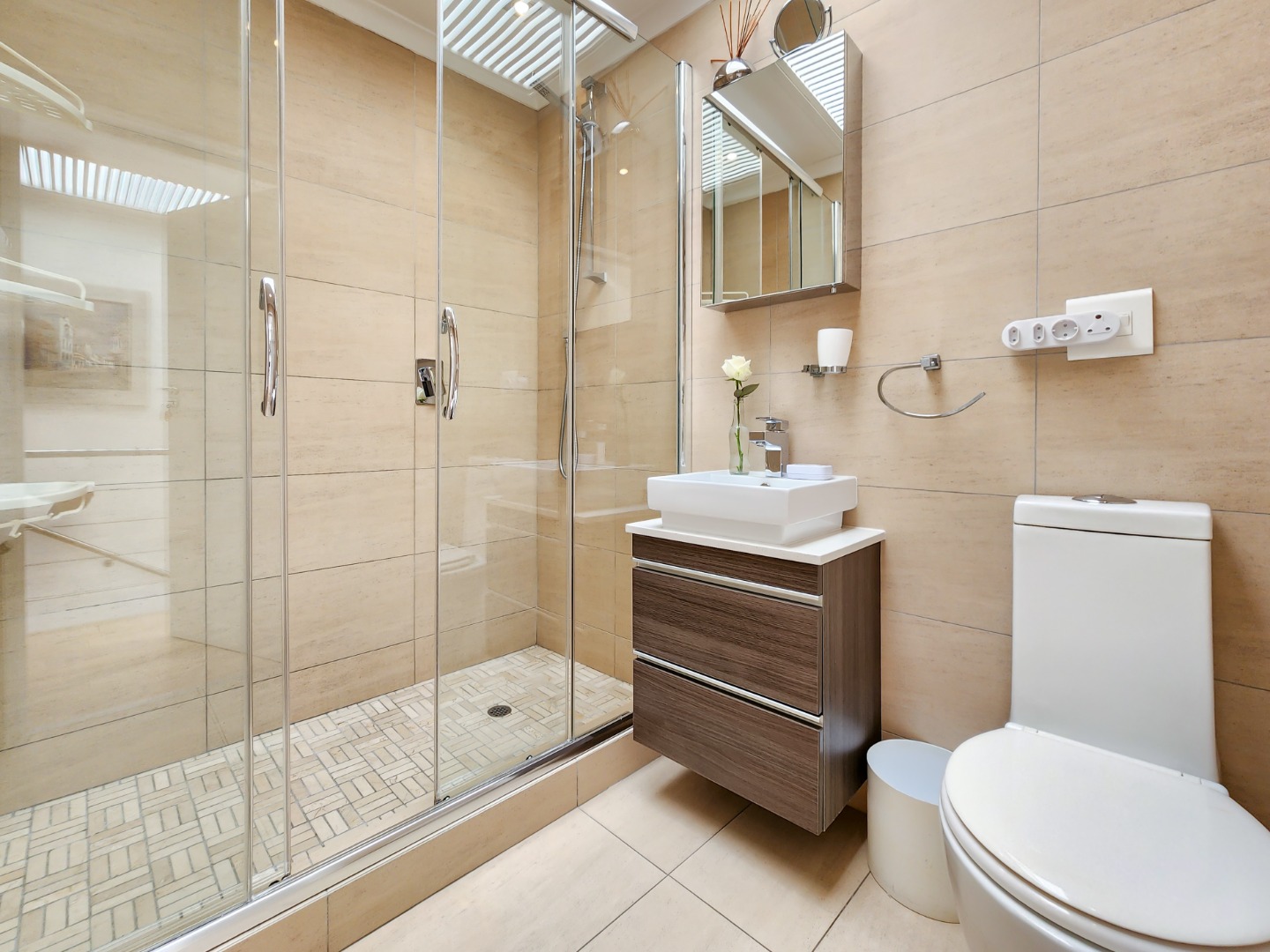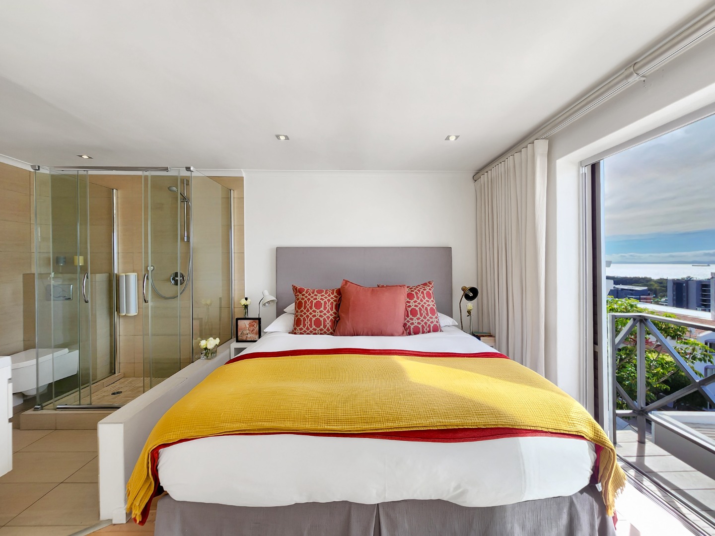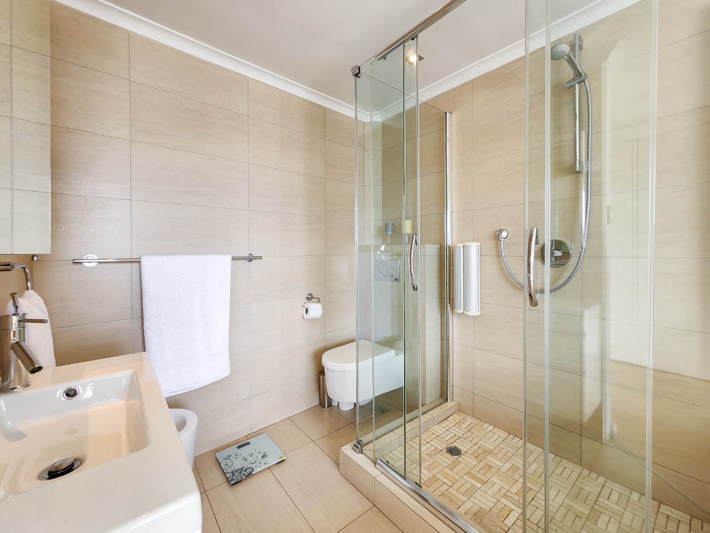 This remarkable property features two spacious bedrooms and two modern bathrooms, each designed with meticulous attention to detail. The main bedroom, located on the top level, is en suite and includes a private balcony that offers breathtaking views. With ample cupboard space and a large shower, it ensures your utmost comfort. The second bedroom, equally spacious and situated on the upper level, conveniently accesses the second bathroom, which also features a shower.